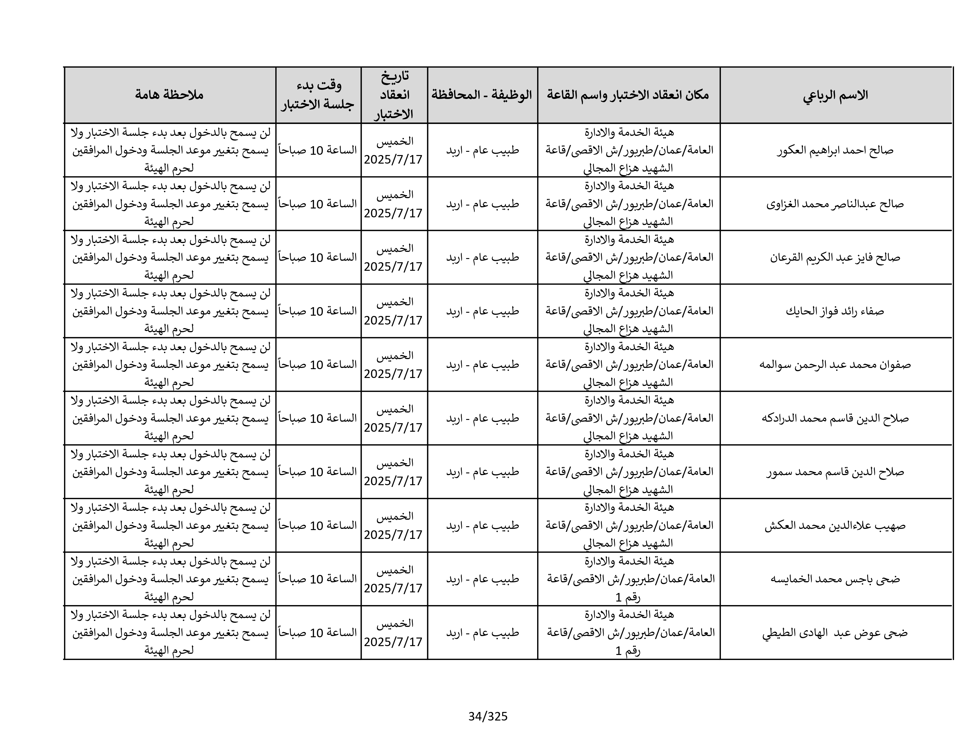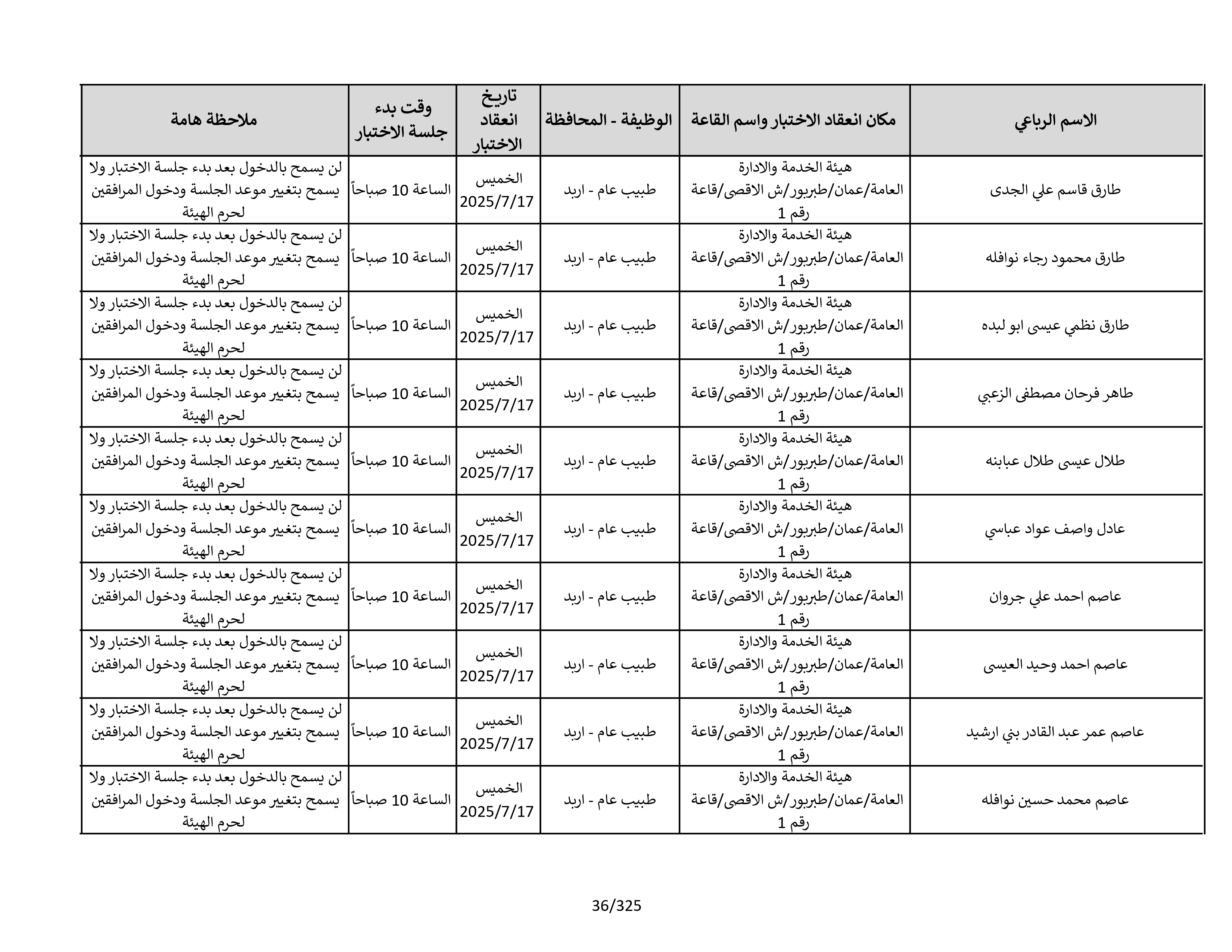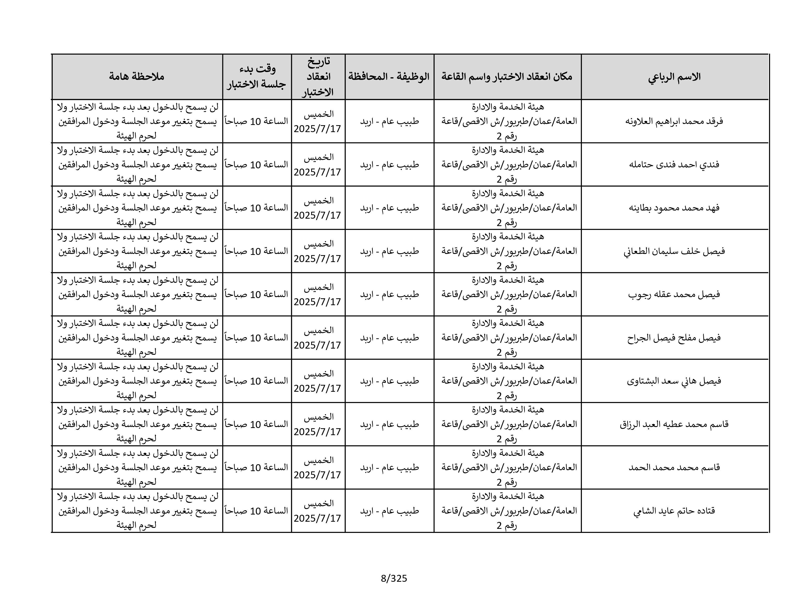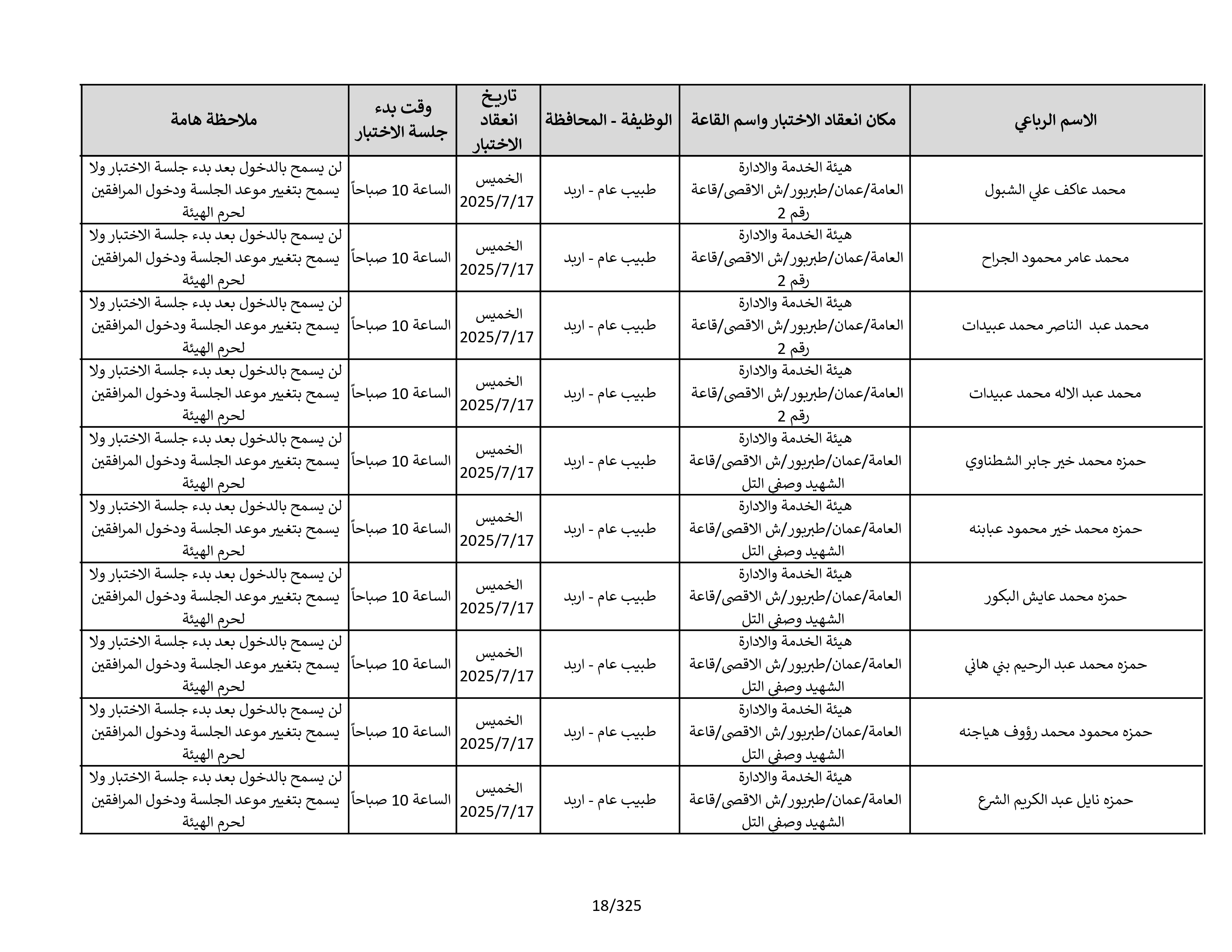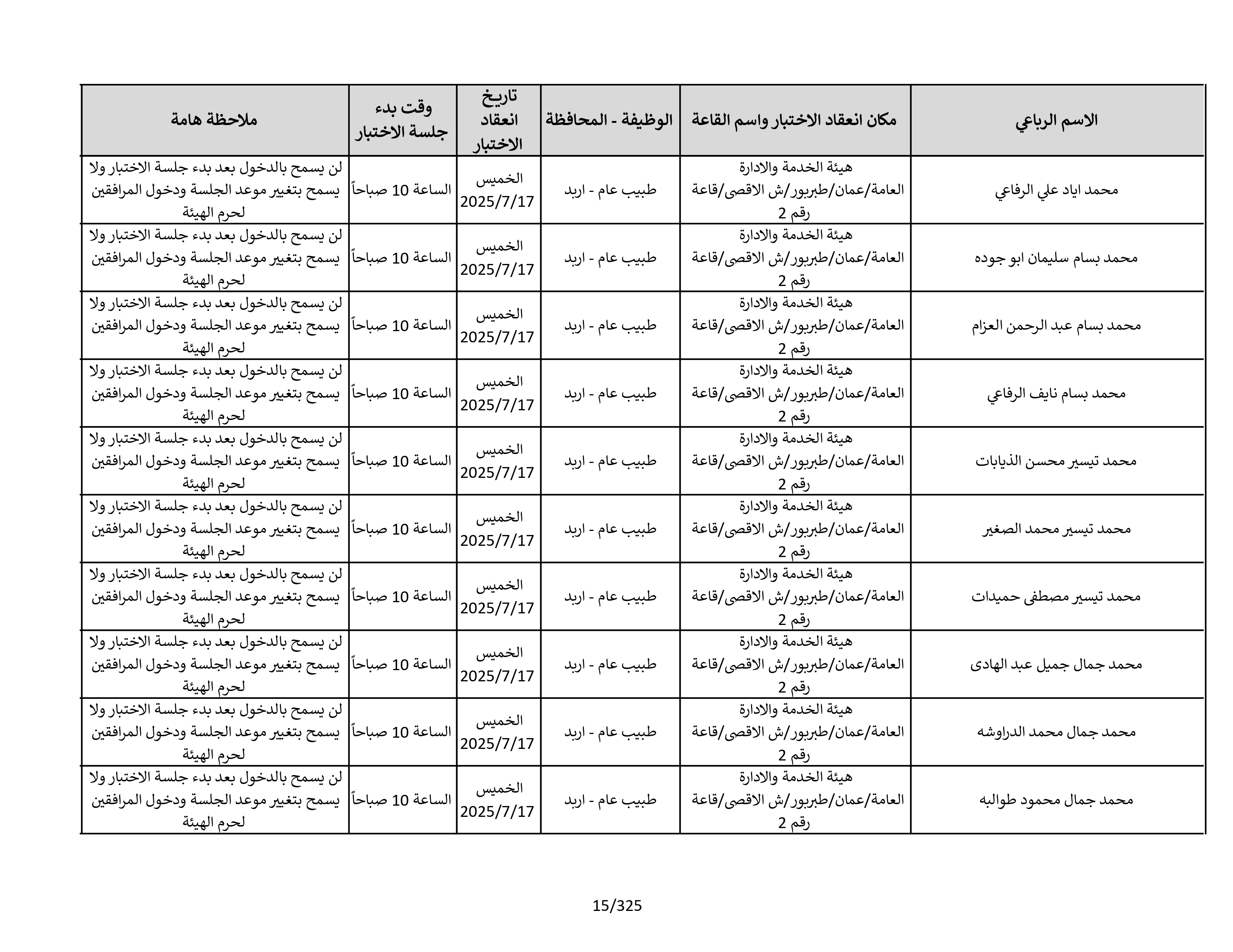 دعت وزارة الصحة المرشحين الواردة أسماؤهم ضمن قوائم المؤهلين، والذين انطبقت عليهم شروط الإعلان السابق، إلى التواجد في مبنى هيئة الخدمة والإدارة العامة / مركز تقييم الكفايات في العاصمة عمّان – منطقة طبربور – شارع الأقصى، وذلك لحضور الاختبار التنافسي الإلكتروني بحسب مجال التخصص الوظيفي لكل مرشح.