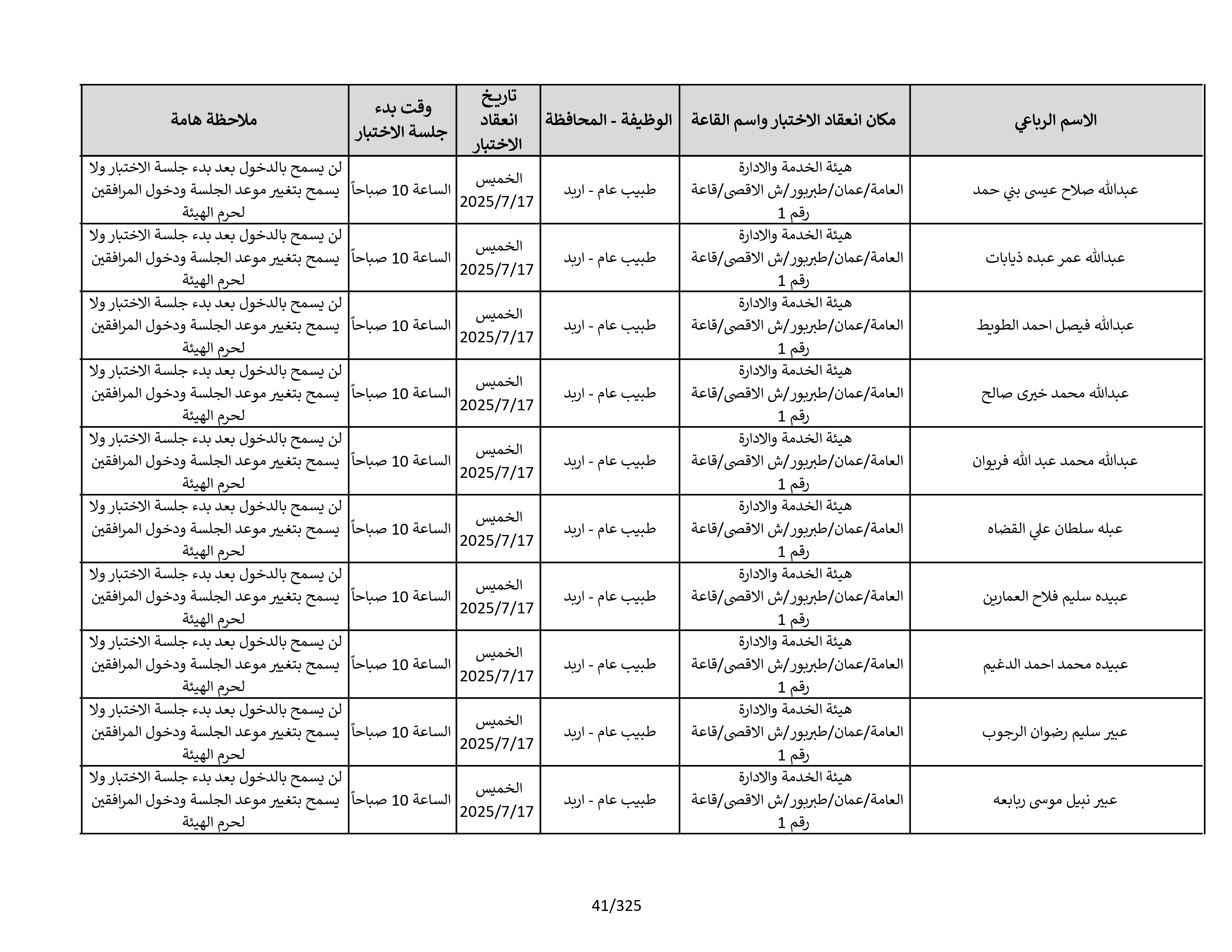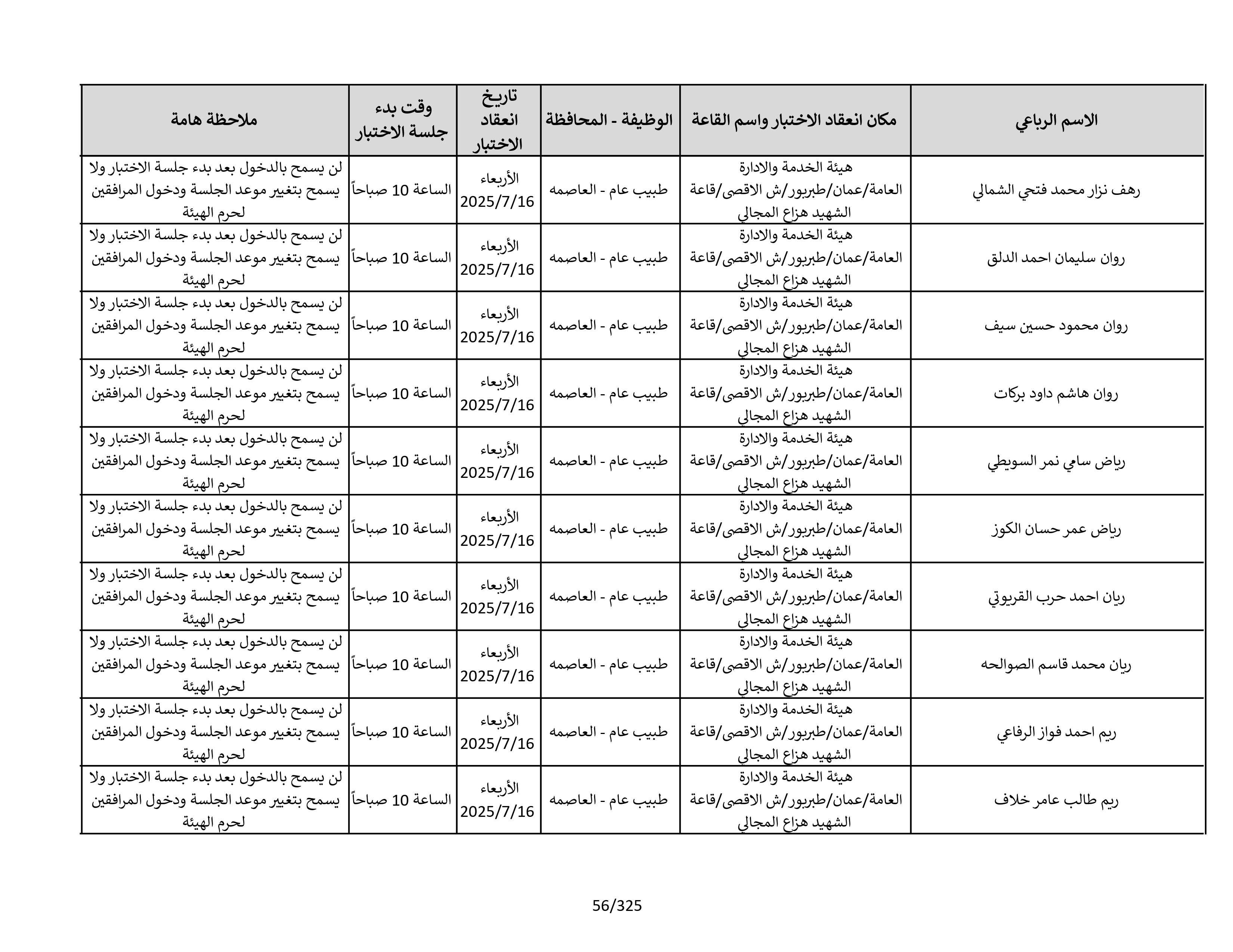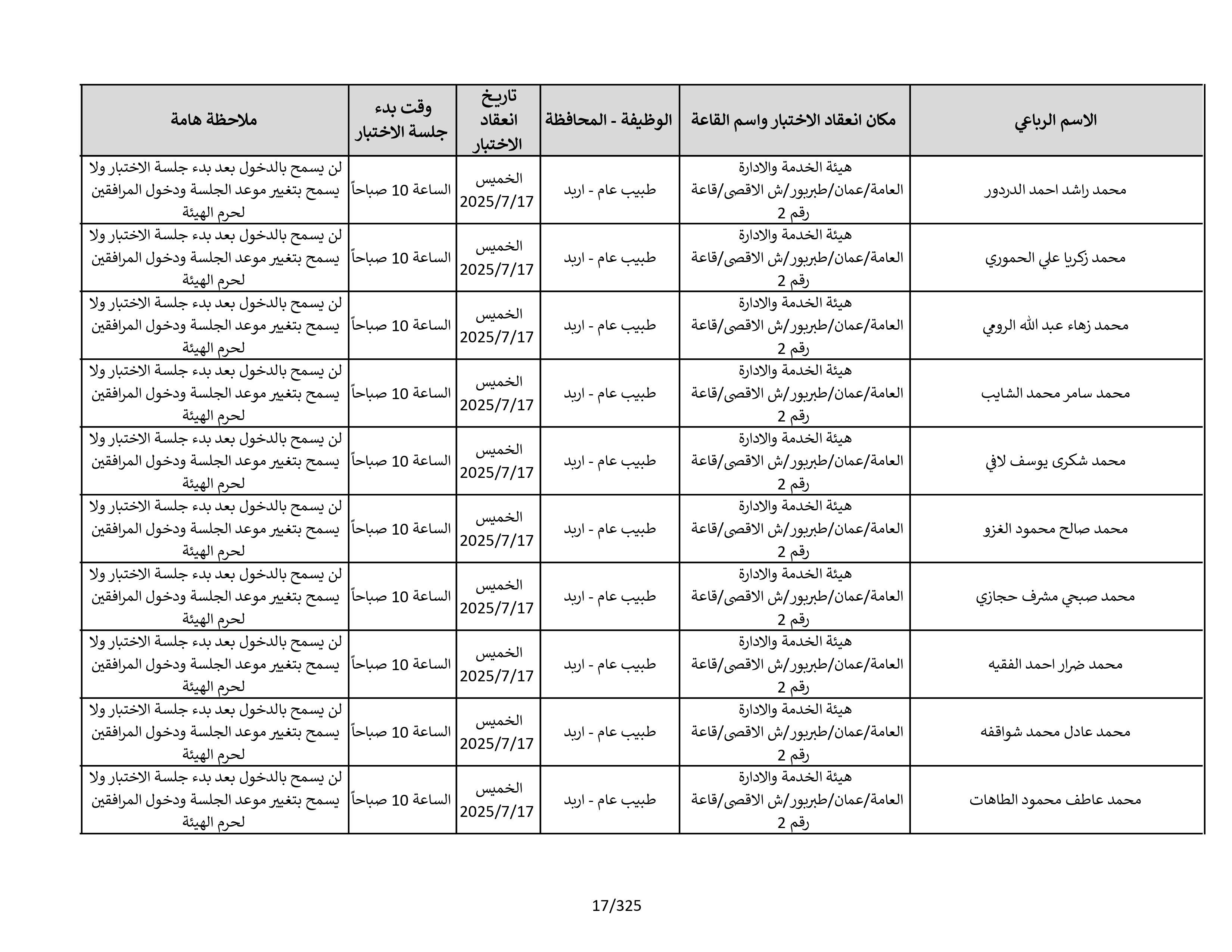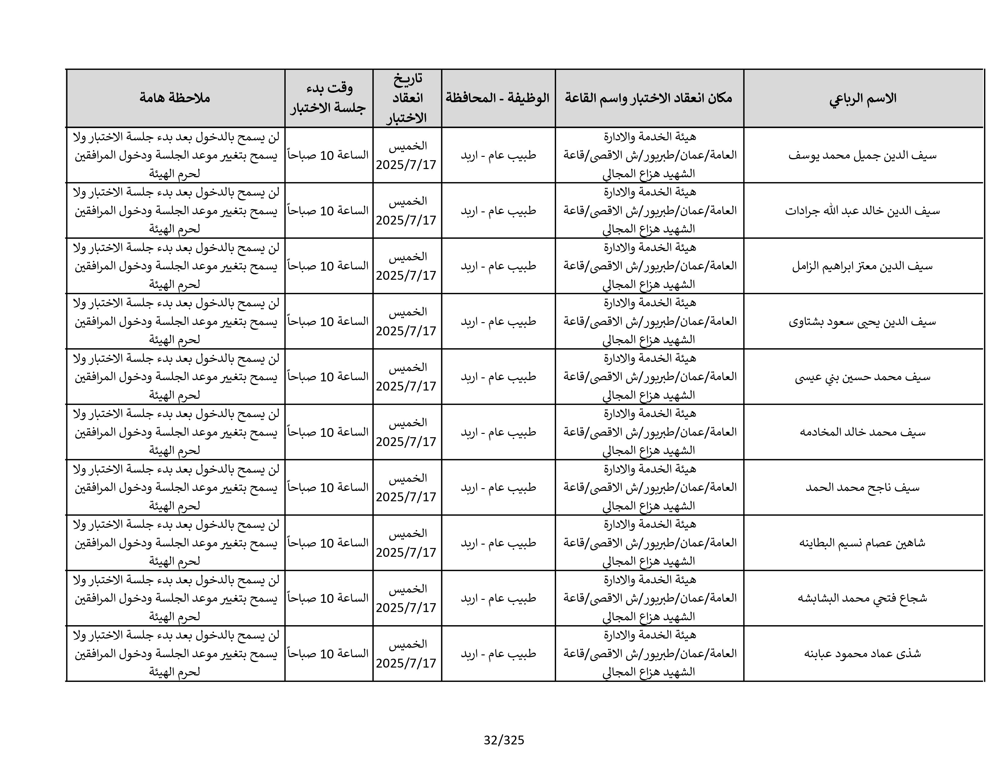 دعت وزارة الصحة المرشحين الواردة أسماؤهم ضمن قوائم المؤهلين، والذين انطبقت عليهم شروط الإعلان السابق، إلى التواجد في مبنى هيئة الخدمة والإدارة العامة / مركز تقييم الكفايات في العاصمة عمّان – منطقة طبربور – شارع الأقصى، وذلك لحضور الاختبار التنافسي الإلكتروني بحسب مجال التخصص الوظيفي لكل مرشح.