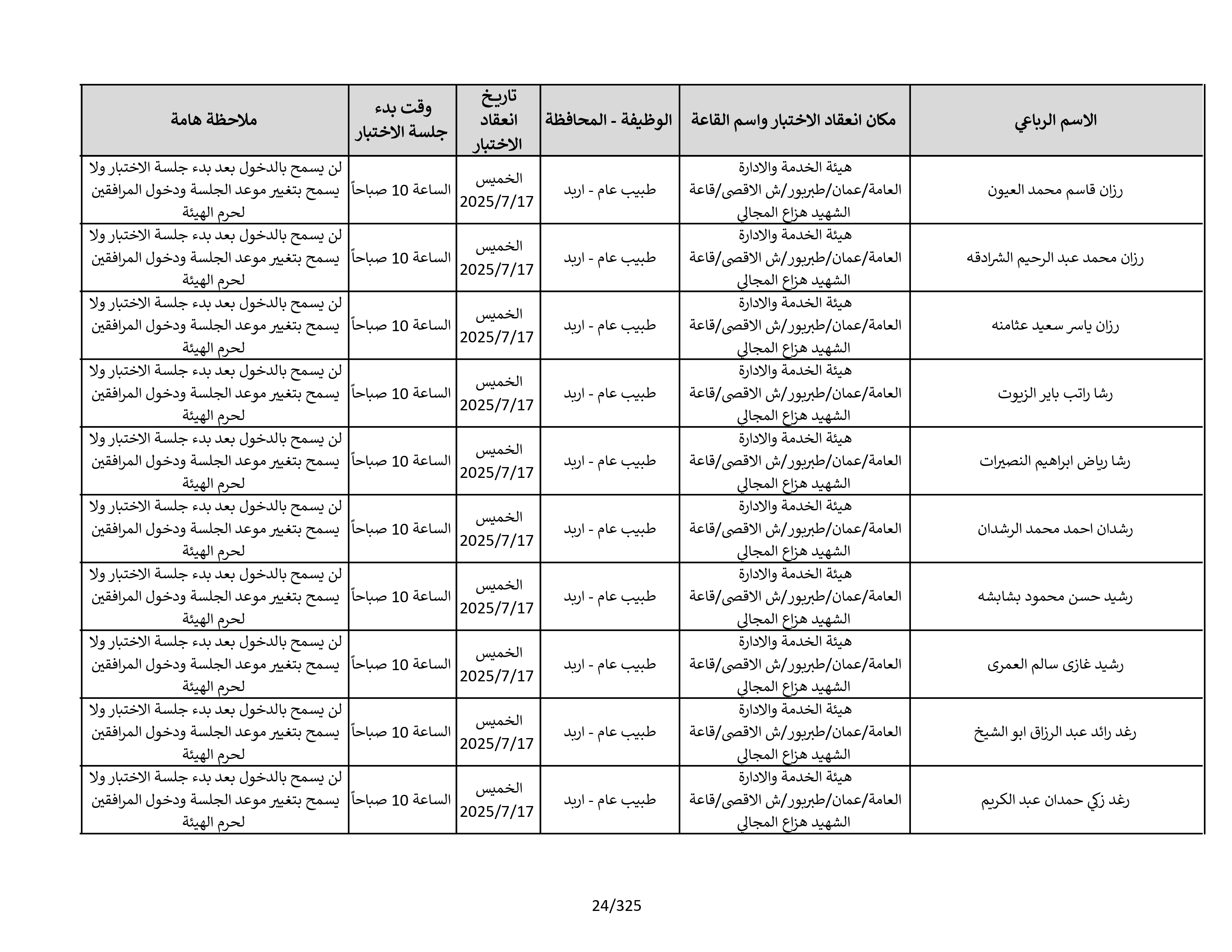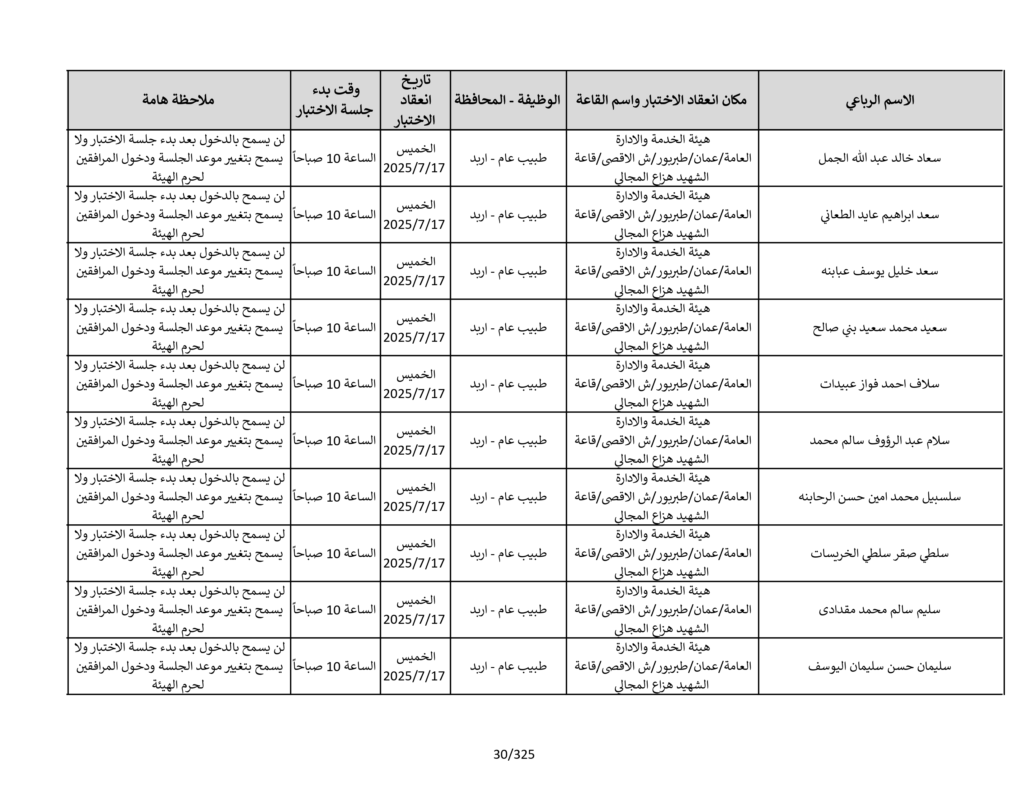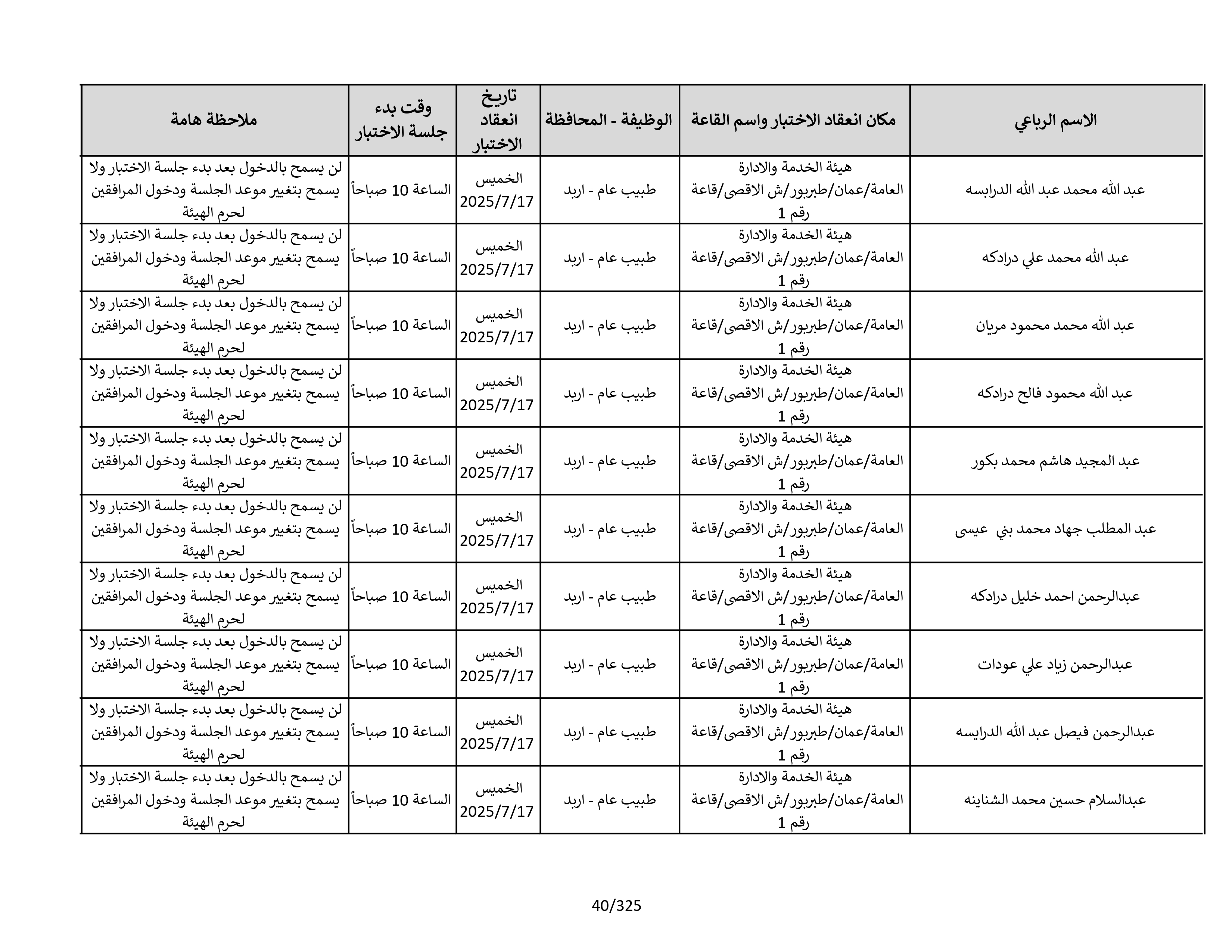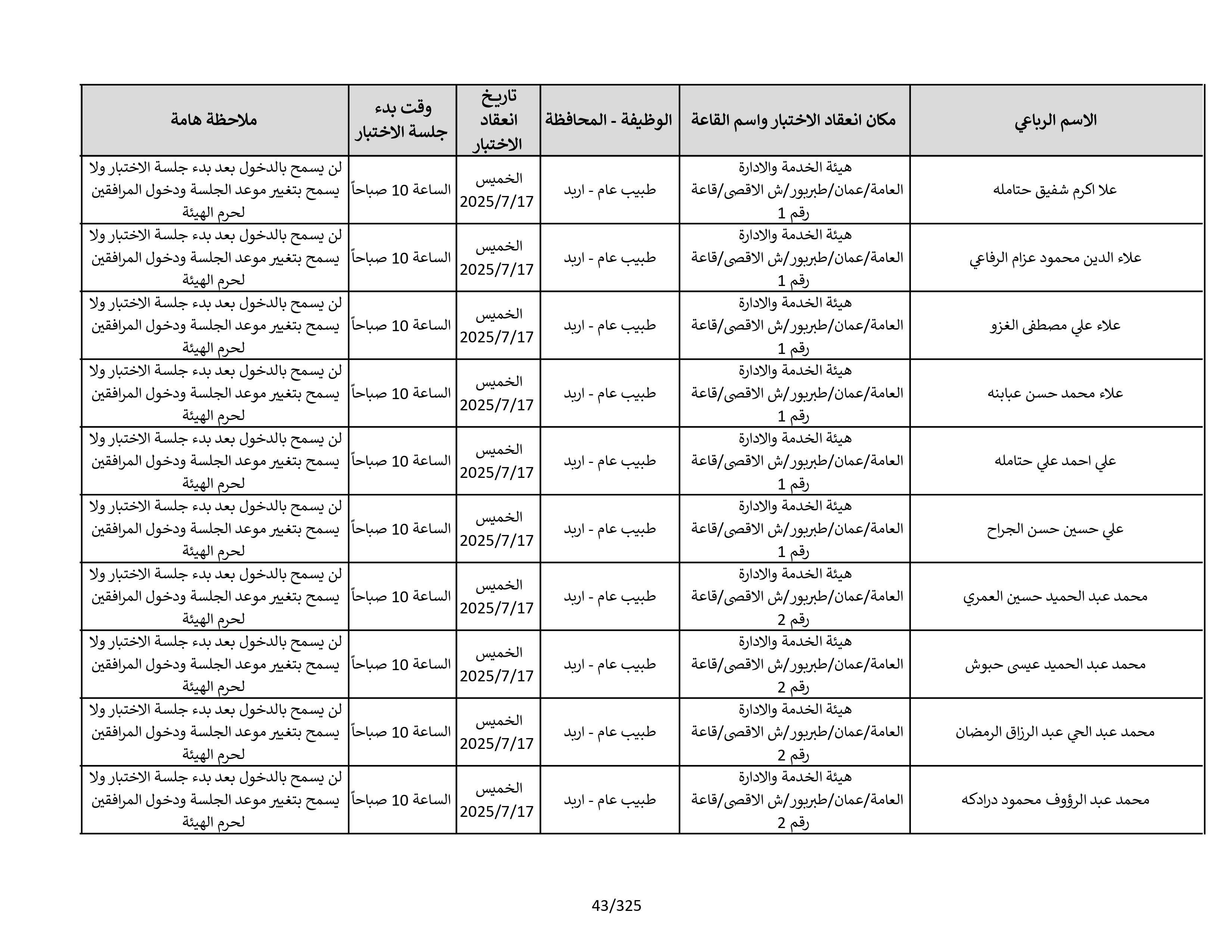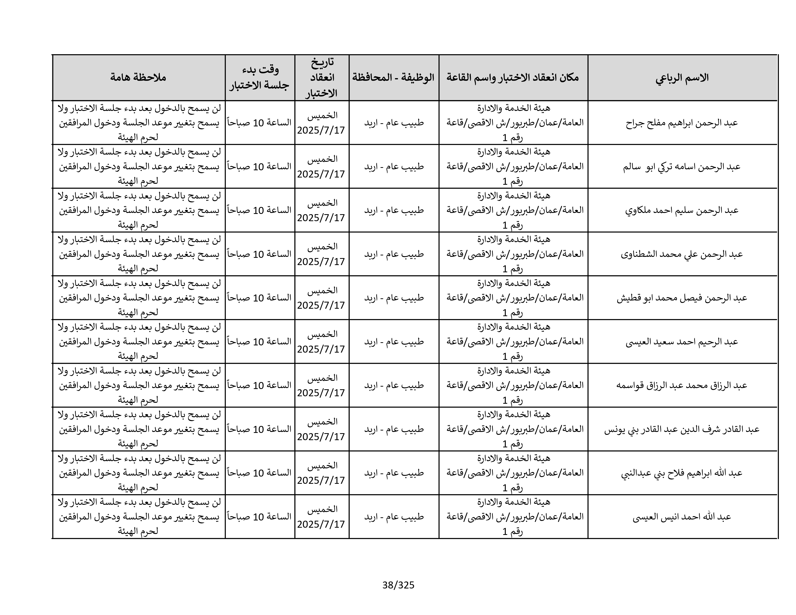 دعت وزارة الصحة المرشحين الواردة أسماؤهم ضمن قوائم المؤهلين، والذين انطبقت عليهم شروط الإعلان السابق، إلى التواجد في مبنى هيئة الخدمة والإدارة العامة / مركز تقييم الكفايات في العاصمة عمّان – منطقة طبربور – شارع الأقصى، وذلك لحضور الاختبار التنافسي الإلكتروني بحسب مجال التخصص الوظيفي لكل مرشح.