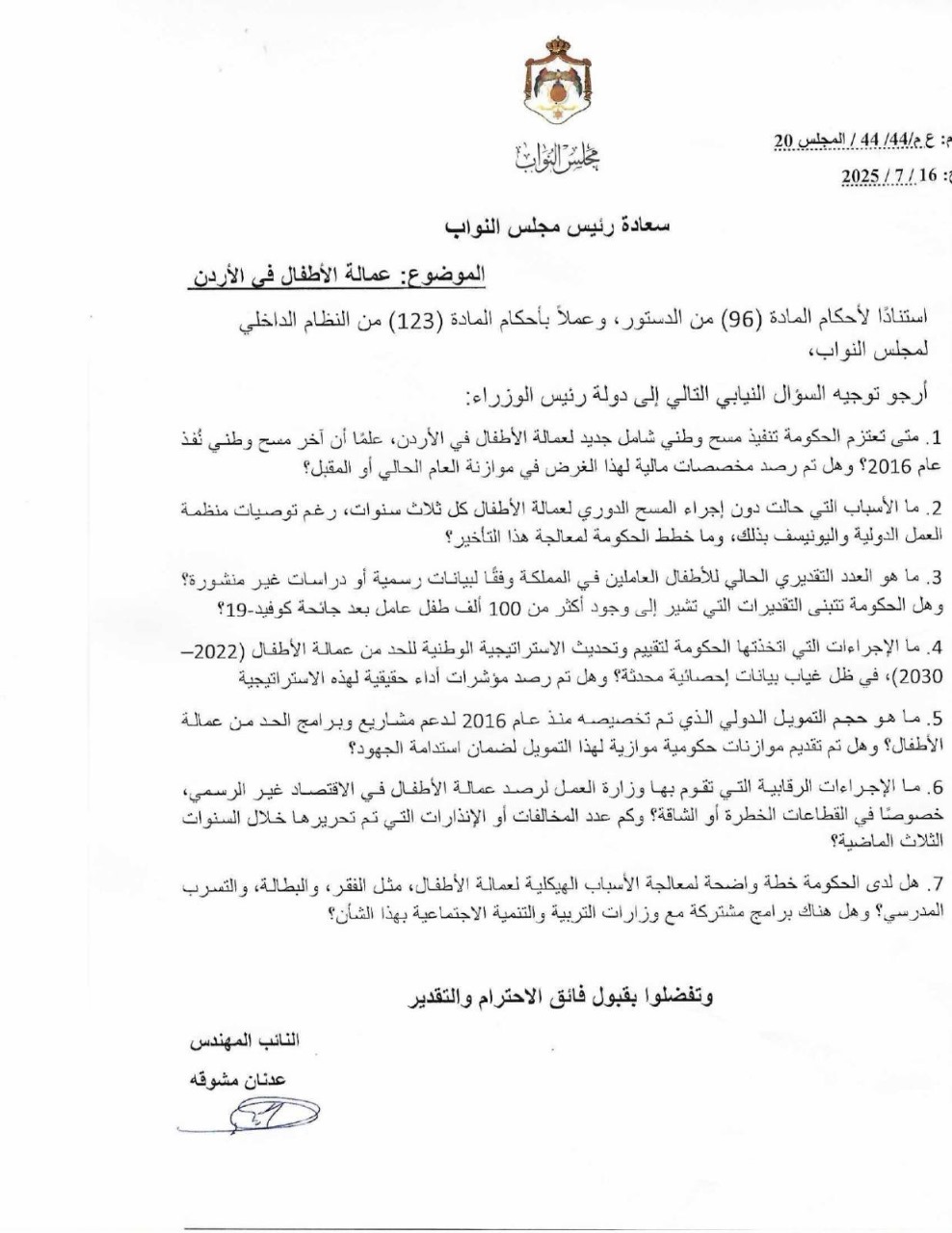 وجّه النائب عدنان مشوقة مجموعة من الأسئلة الرقابية إلى الحكومة حول ملف عمالة الأطفال في الأردن، منتقدًا ما وصفه بـ"الجمود الرسمي" في مواجهة هذه الظاهرة المتفاقمة، وغياب التحديث الدوري للبيانات والإجراءات الفعلية رغم تعاظم التحديات الاجتماعية والاقتصادية، لا سيما بعد جائحة كورونا.