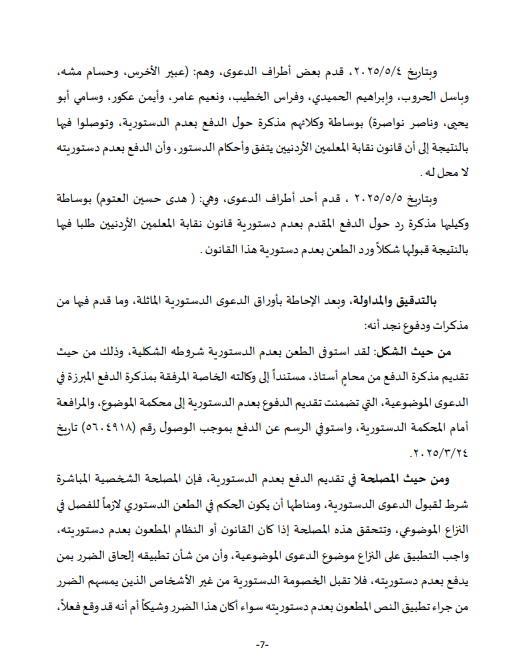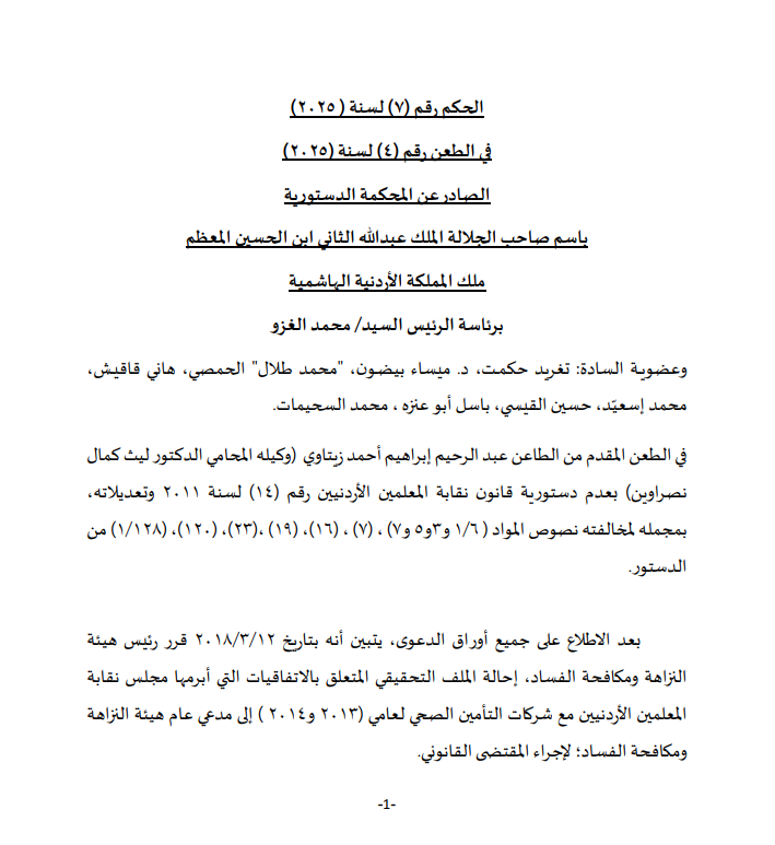 وتنشر صحيفة "أخبار الأردن الإلكترونية" النص الكامل للقرار الصادر عن المحكمة الدستورية، الذي يُعد مرجعية ملزمة ونهائية في تفسير دستورية القوانين.