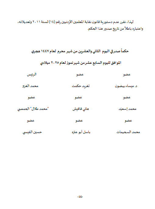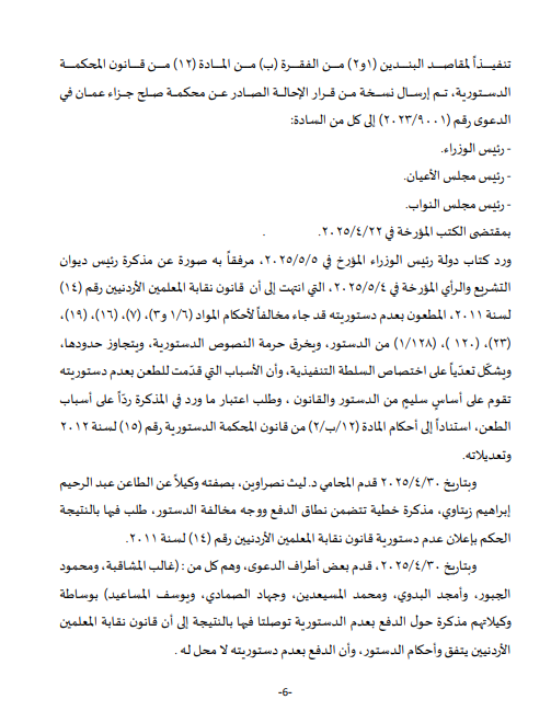 في خطوة قضائية مفصلية، أصدرت المحكمة الدستورية، بهيئتها العامة، اليوم الخميس، حكمًا يقضي بعدم دستورية قانون نقابة المعلمين الأردنيين رقم (14) لسنة 2011 وتعديلاته، واعتباره لاغيًا بالكامل من تاريخ صدور الحكم.