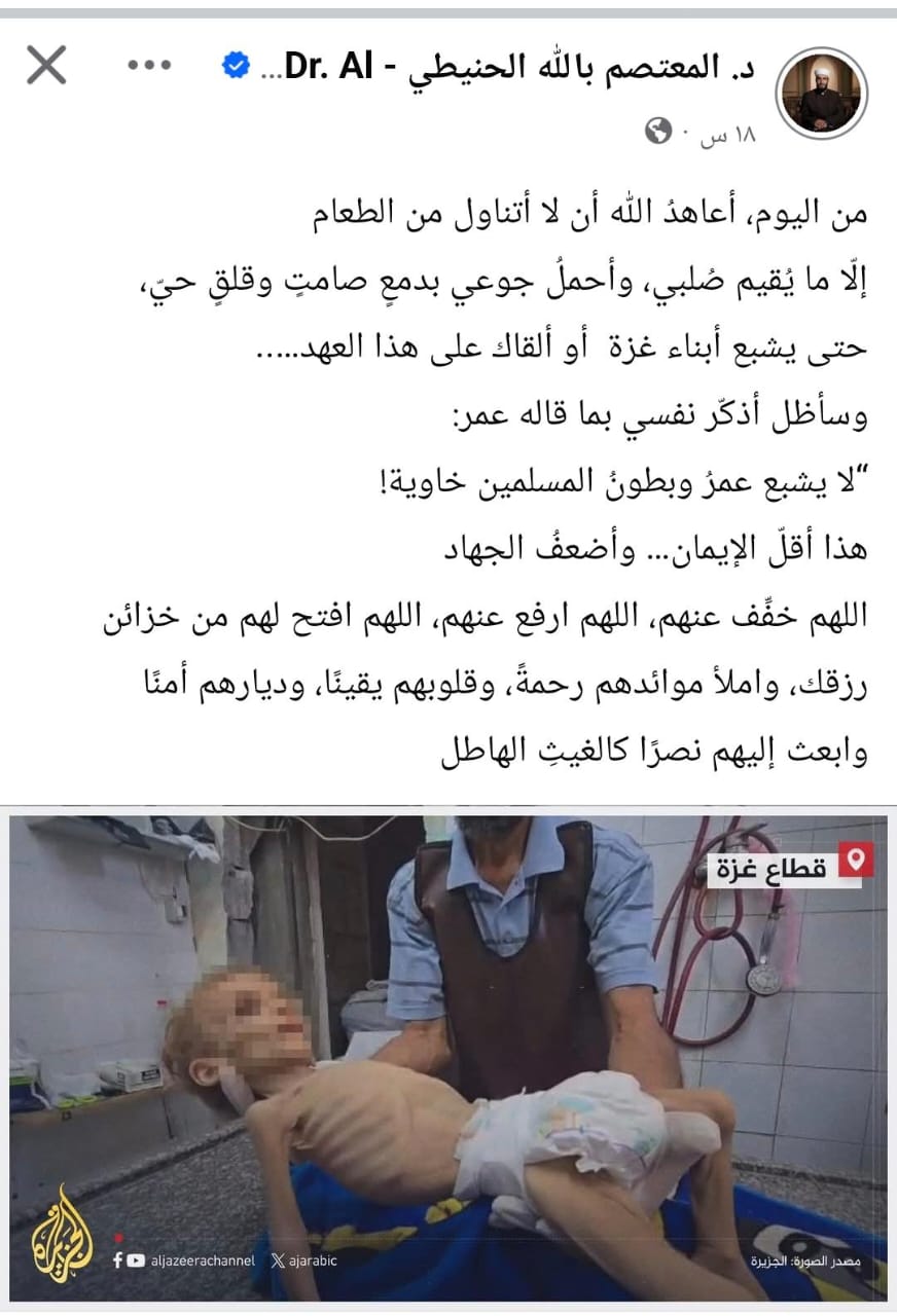 ونشر الدكتور الحنيطي منشوراً عبر صفحته الرسمية على موقع "فيسبوك"، قال فيه: "من اليوم، أعاهدُ الله أن لا أتناول من الطعام إلّا ما يُقيم صُلبي، وأحملُ جوعي بدمعٍ صامتٍ وقلقٍ حيّ، حتى يشبع أبناء غزة أو ألقاك على هذا العهد..."