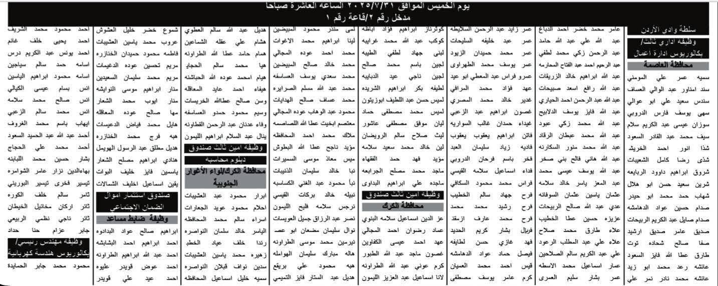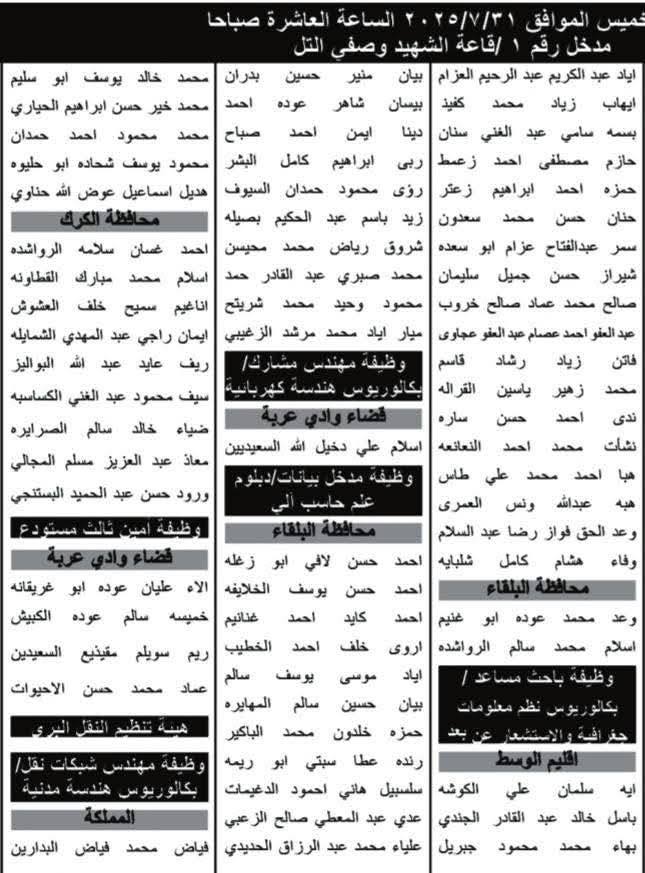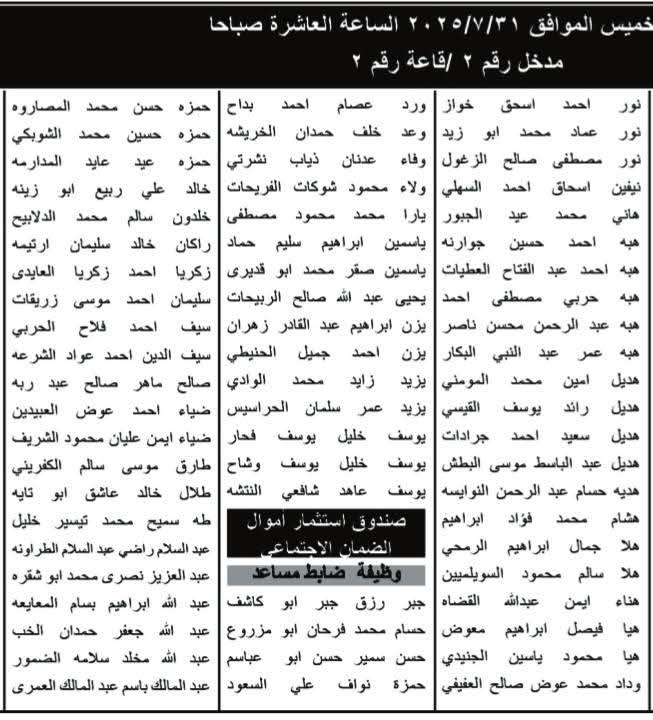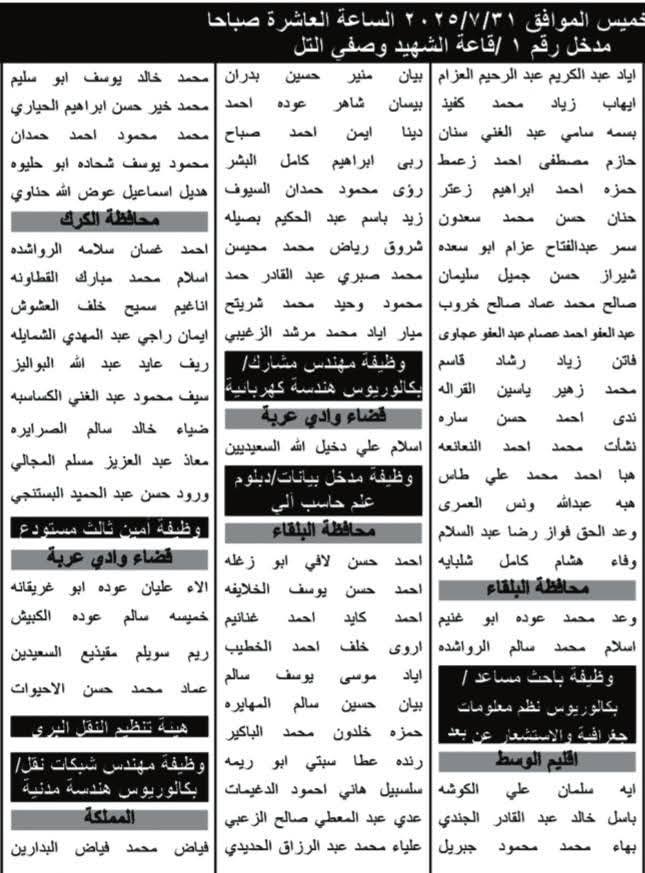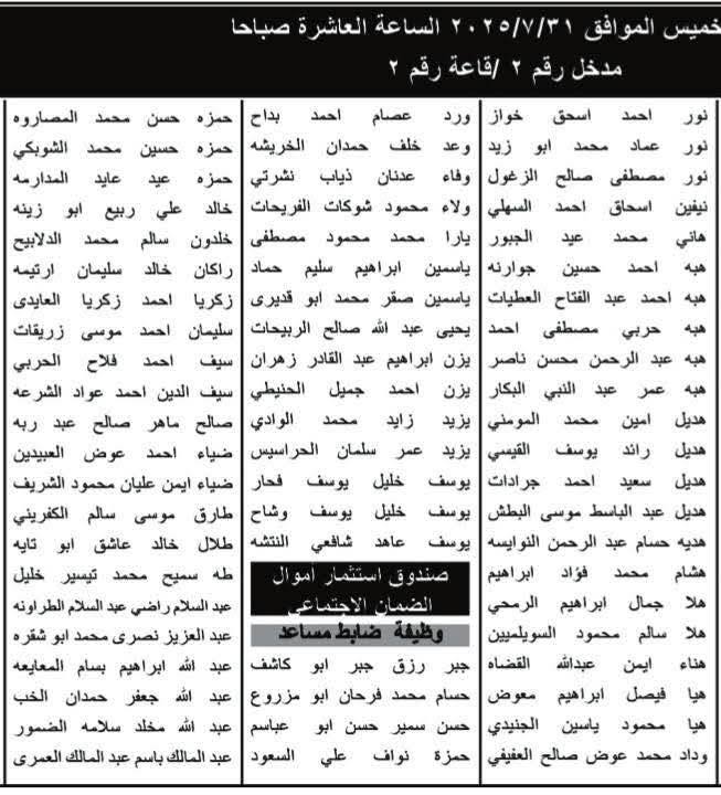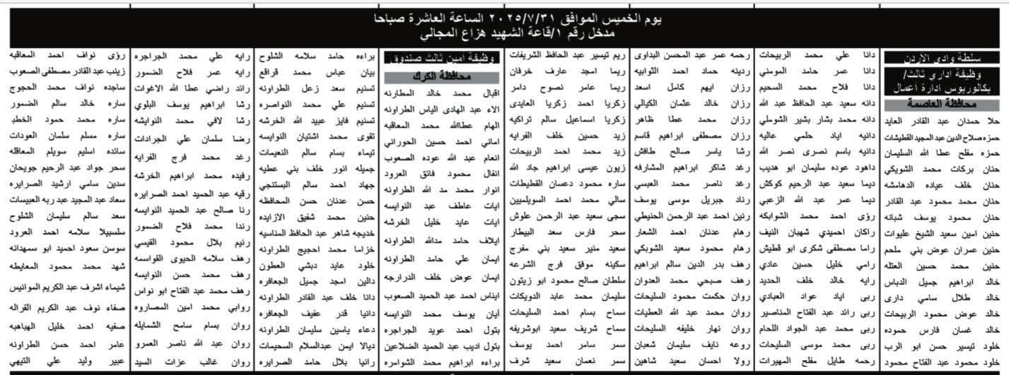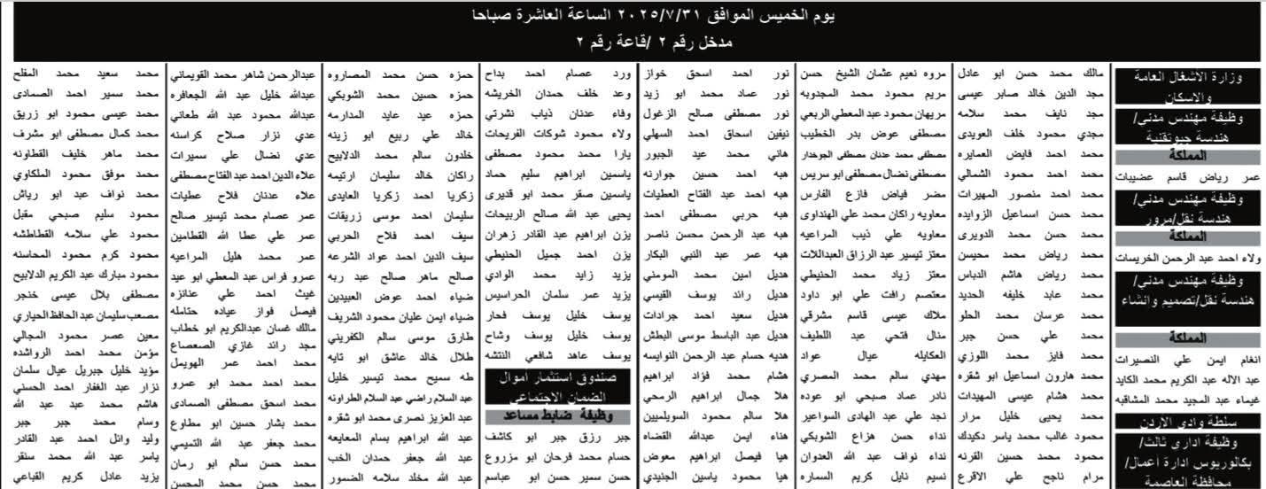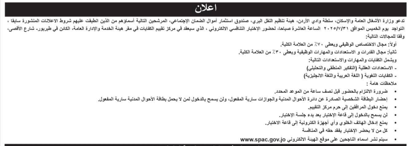 دعت وزارة الأشغال العامة والإسكان، وسلطة وادي الأردن، وهيئة تنظيم النقل البري، وصندوق استثمار أموال الضمان الاجتماعي، المرشحين المدرجة أسماؤهم ممن انطبقت عليهم الشروط الواردة في الإعلانات السابقة، للتواجد يوم الخميس الموافق 31 تموز 2025، الساعة العاشرة صباحًا، في مقر هيئة الخدمة والإدارة العامة - مركز تقييم الكفايات، الكائن في طبربور/ شارع الأقصى، وذلك لحضور الاختبار التنافسي الإلكتروني.