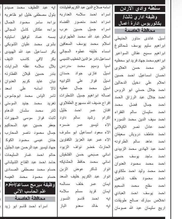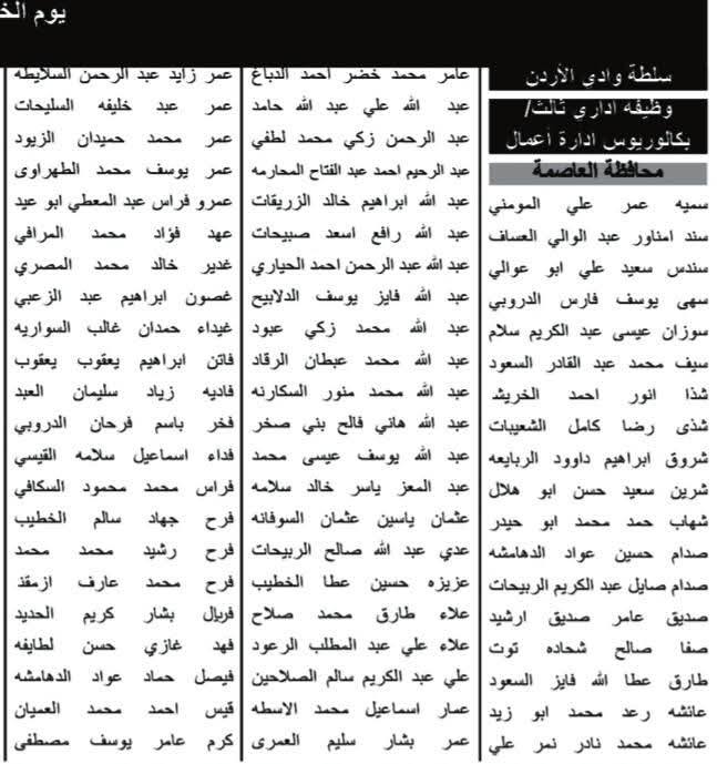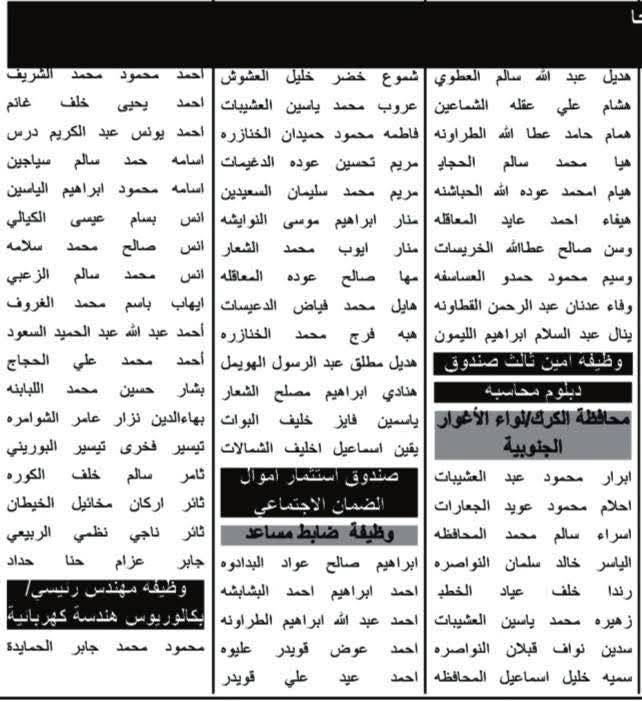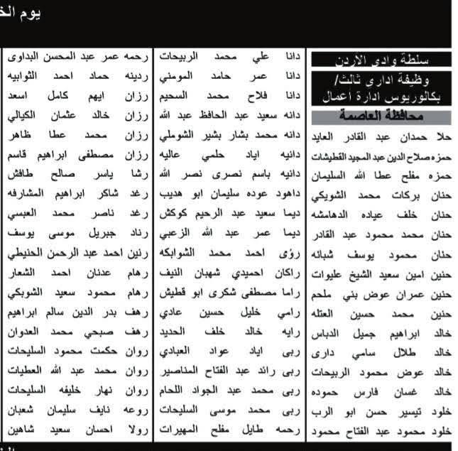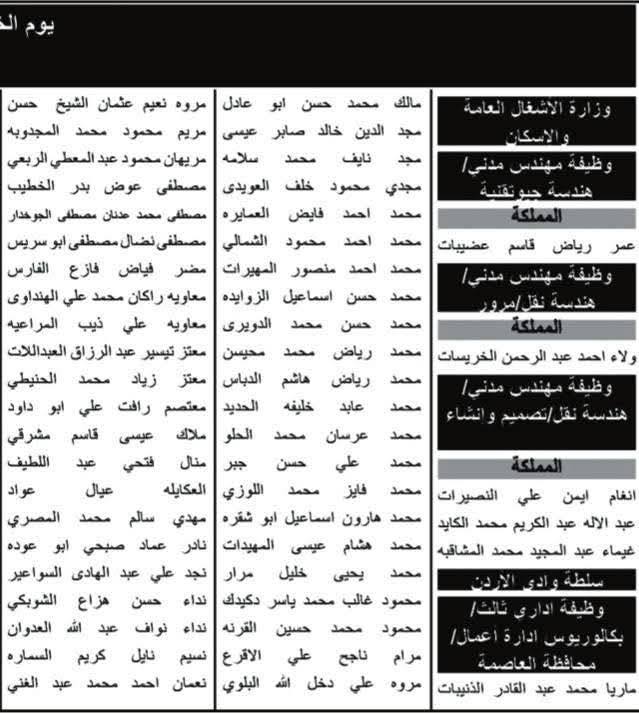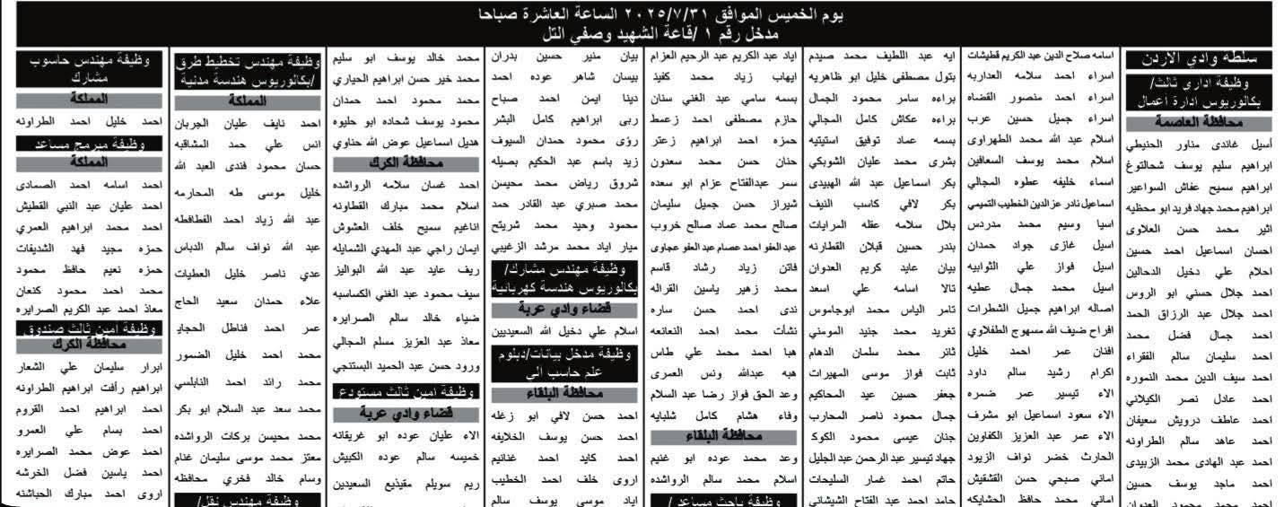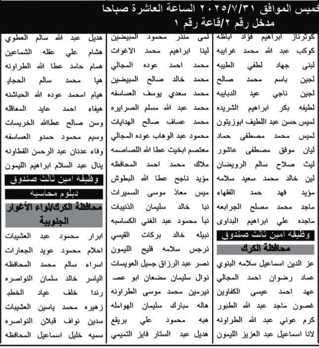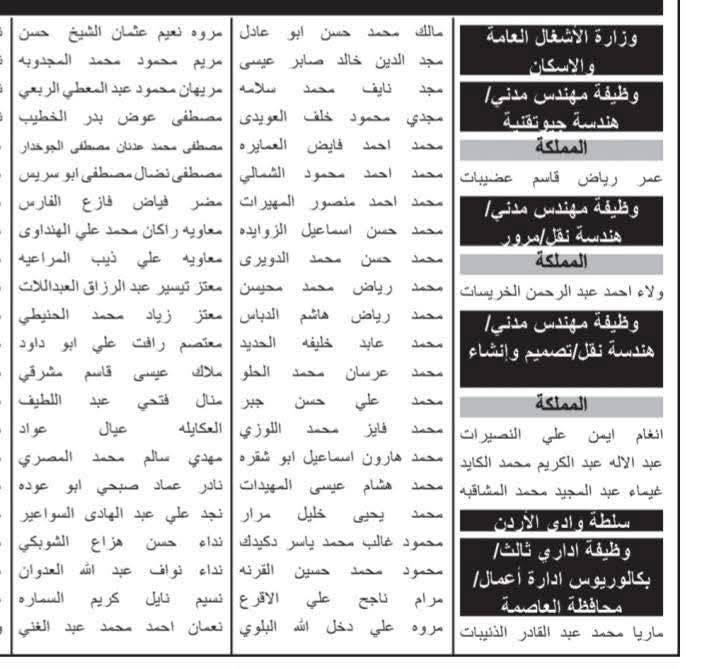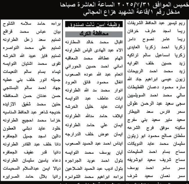 دعت وزارة الأشغال العامة والإسكان، وسلطة وادي الأردن، وهيئة تنظيم النقل البري، وصندوق استثمار أموال الضمان الاجتماعي، المرشحين المدرجة أسماؤهم ممن انطبقت عليهم الشروط الواردة في الإعلانات السابقة، للتواجد يوم الخميس الموافق 31 تموز 2025، الساعة العاشرة صباحًا، في مقر هيئة الخدمة والإدارة العامة - مركز تقييم الكفايات، الكائن في طبربور/ شارع الأقصى، وذلك لحضور الاختبار التنافسي الإلكتروني.