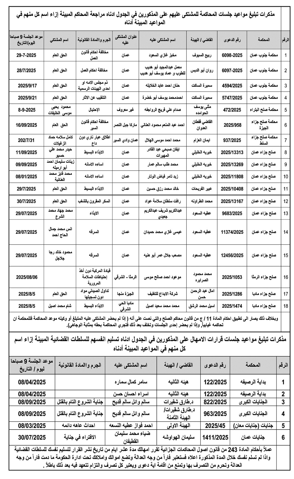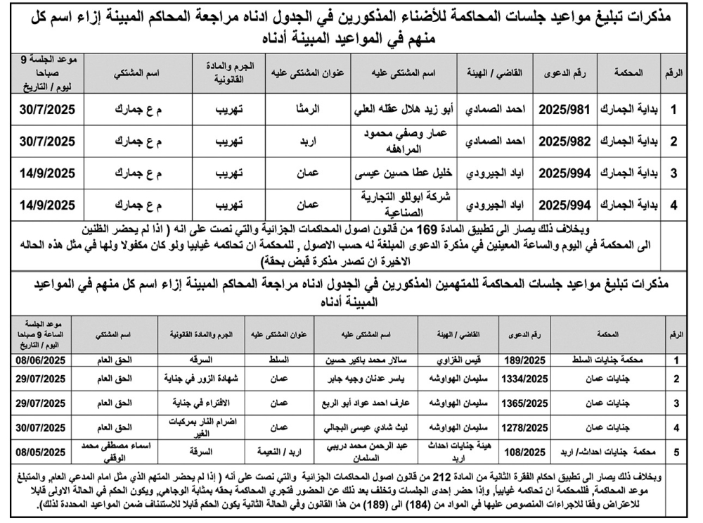 أصدرت الجهات القضائية المختصة، اليوم الاثنين، مذكرات تبليغ لحضور جلسات محاكمة بحق عدد من المشتكى عليهم والمتهمين، بالإضافة إلى قرارات إمهال لمراجعة المحاكم.
