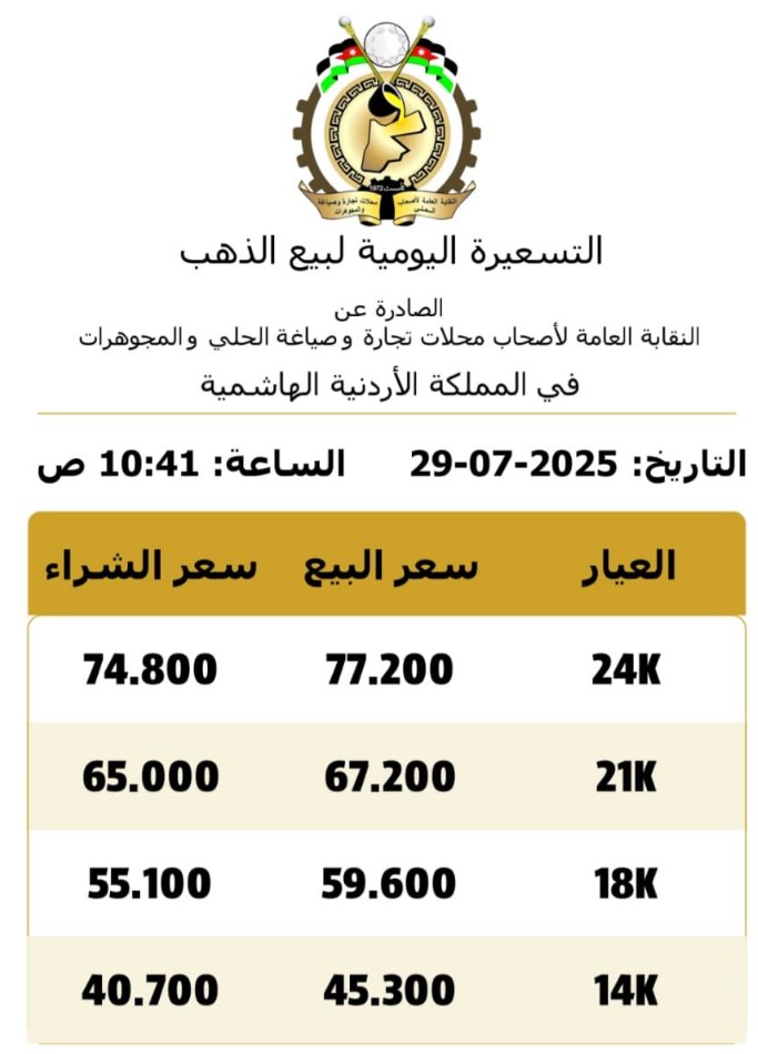 كما بلغ سعر غرام الذهب عيار 24، الأعلى تصنيفاً من حيث النقاء، 77.2 دينار لغايات البيع، في حين سجل عيار 18 نحو 59.6 دينار، وعيار 14 نحو 45.3 دينار.