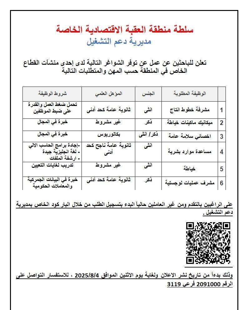 أعلنت سلطة منطقة العقبة الاقتصادية الخاصة عن توافر عدد من الوظائف الشاغرة لدى إحدى منشآت القطاع الخاص، وذلك وفقًا للمهن والمتطلبات المحددة في الإعلان الرسمي.