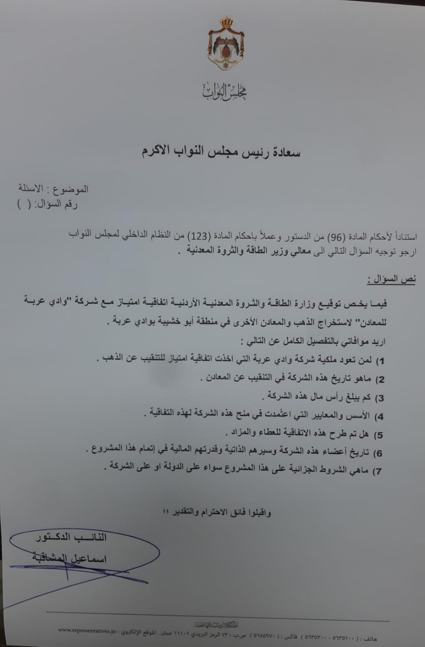وجّه النائب الدكتور إسماعيل المشاقبة سؤالًا نيابيًا إلى وزير الطاقة والثروة المعدنية، استفسر فيه عن تفاصيل اتفاقية الامتياز المبرمة مع شركة "وادي عربة للمعادن"، والخاصة بالتنقيب عن الذهب في منطقة أبو خشيبة جنوبي الأردن.