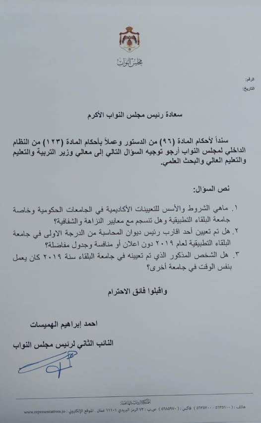 وجّه النائب أحمد إبراهيم الهميسات سؤالًا نيابيًا إلى وزير التربية والتعليم والتعليم العالي والبحث العلمي، استنادًا لأحكام المادة (96) من الدستور والمادة (123) من النظام الداخلي لمجلس النواب، طالب فيه بتوضيح آليات التعيين الأكاديمي في الجامعات الحكومية، وبخاصة جامعة البلقاء التطبيقية.