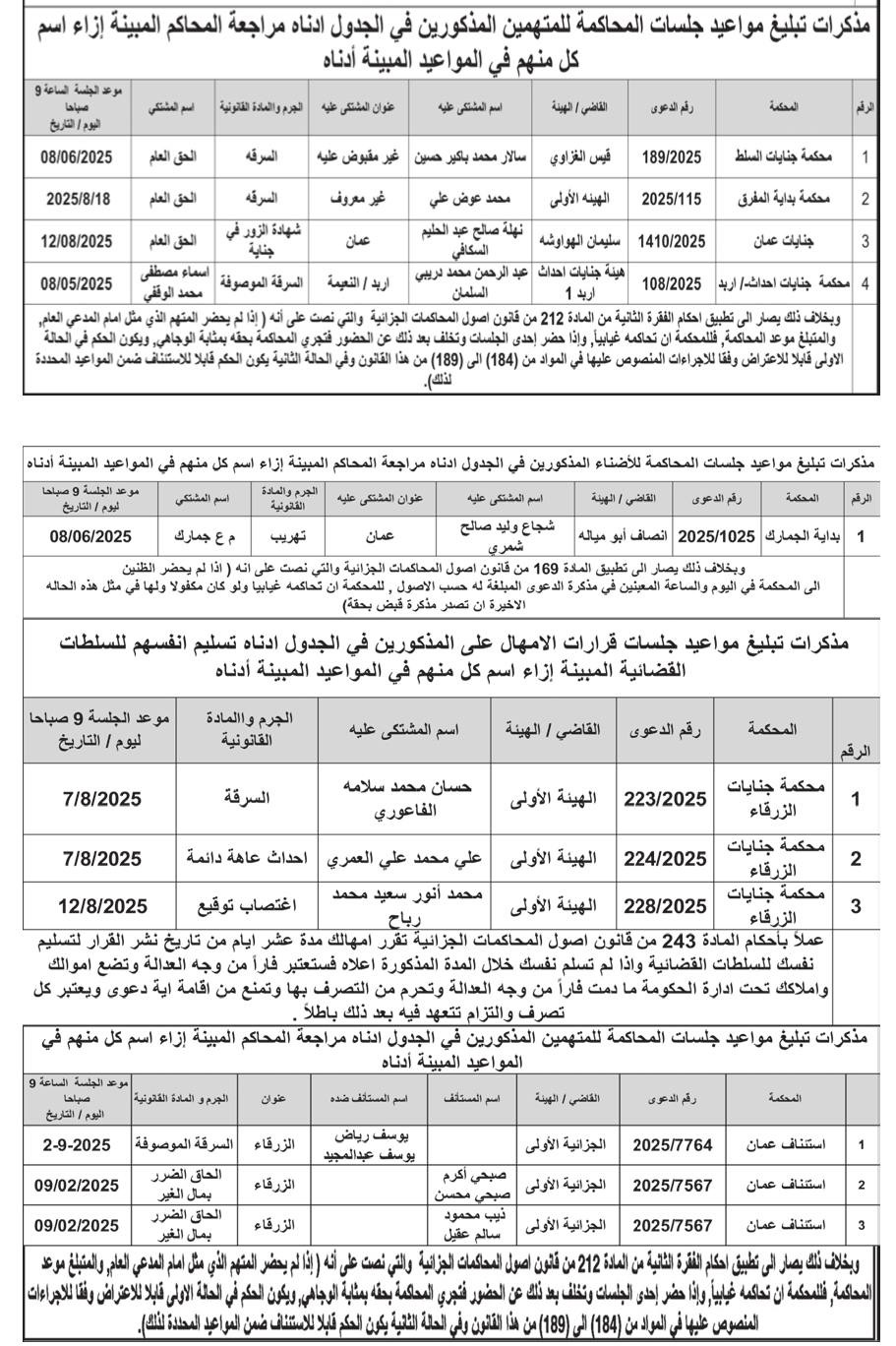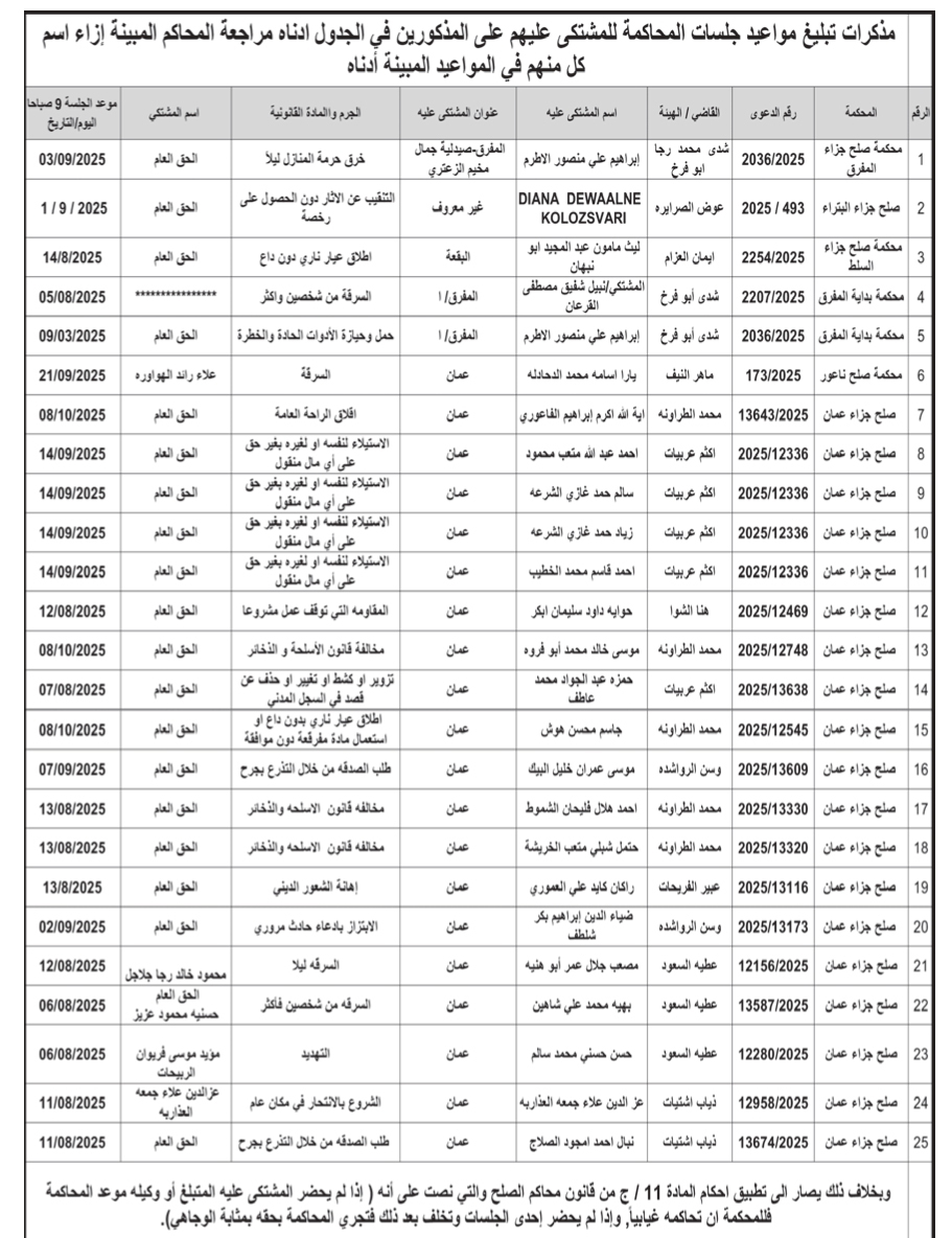 عادت الصحف اليومية، اليوم الاثنين، إلى نشر مذكرات تبليغ جديدة بحق عدد من الأردنيين، تتضمن مواعيد جلسات محاكمة لمتهمين ومشتكى عليهم، إضافة إلى قرارات إمهال صادرة عن الجهات القضائية المختصة.
