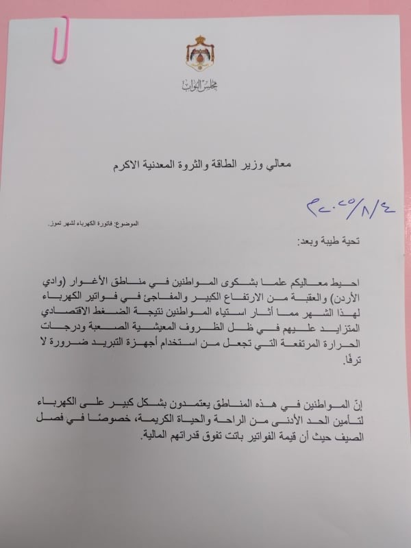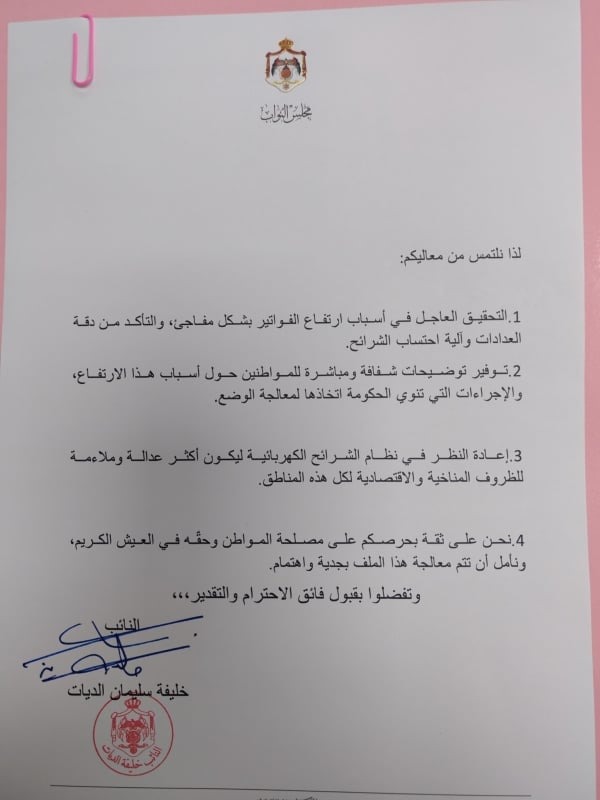 وجّه النائب خليفة سليمان الديات كتابًا رسميًا إلى وزير الطاقة والثروة المعدنية، دعا فيه إلى فتح تحقيق عاجل بشأن الارتفاع المفاجئ وغير المبرر في فواتير الكهرباء، خاصة في مناطق الأغوار (وادي الأردن) والعقبة، والتي تشهد موجة استياء شعبي متزايدة بسبب الفواتير المرتفعة.