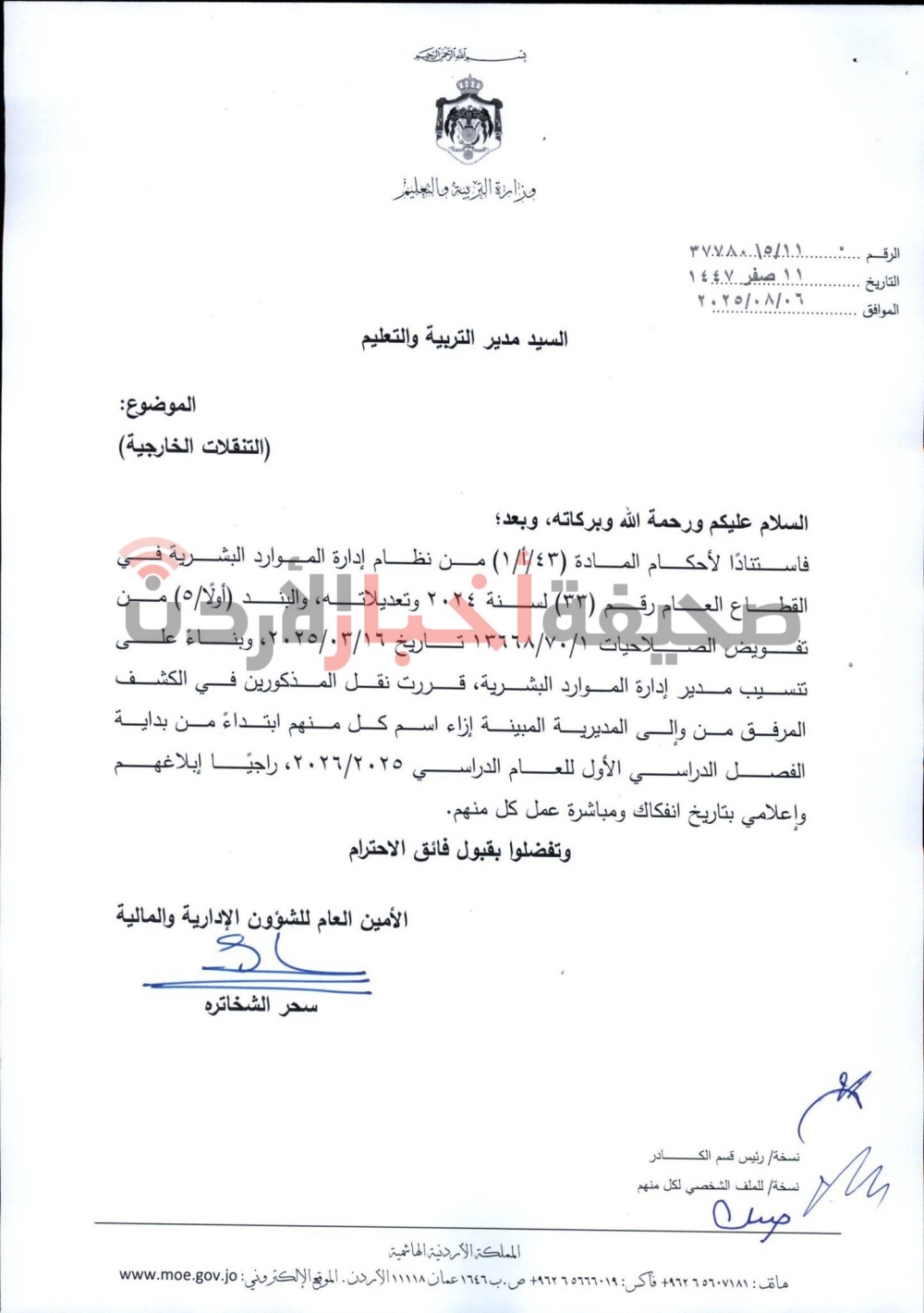 قررت وزارة التربية والتعليم الموافقة على النقل الخارجي لـ740 معلما وموظفا بدءا من الفصل الدراسي الأول 2025 / 2026.