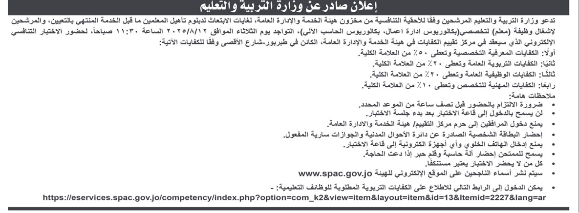 دعت وزارة التربية والتعليم، اليوم الخميس، مجموعة من المرشحين المدرجة أسماؤهم تاليا، لحضور الامتحان التنافسي تمهيدا للتعيين في الوظائف التعليمية.