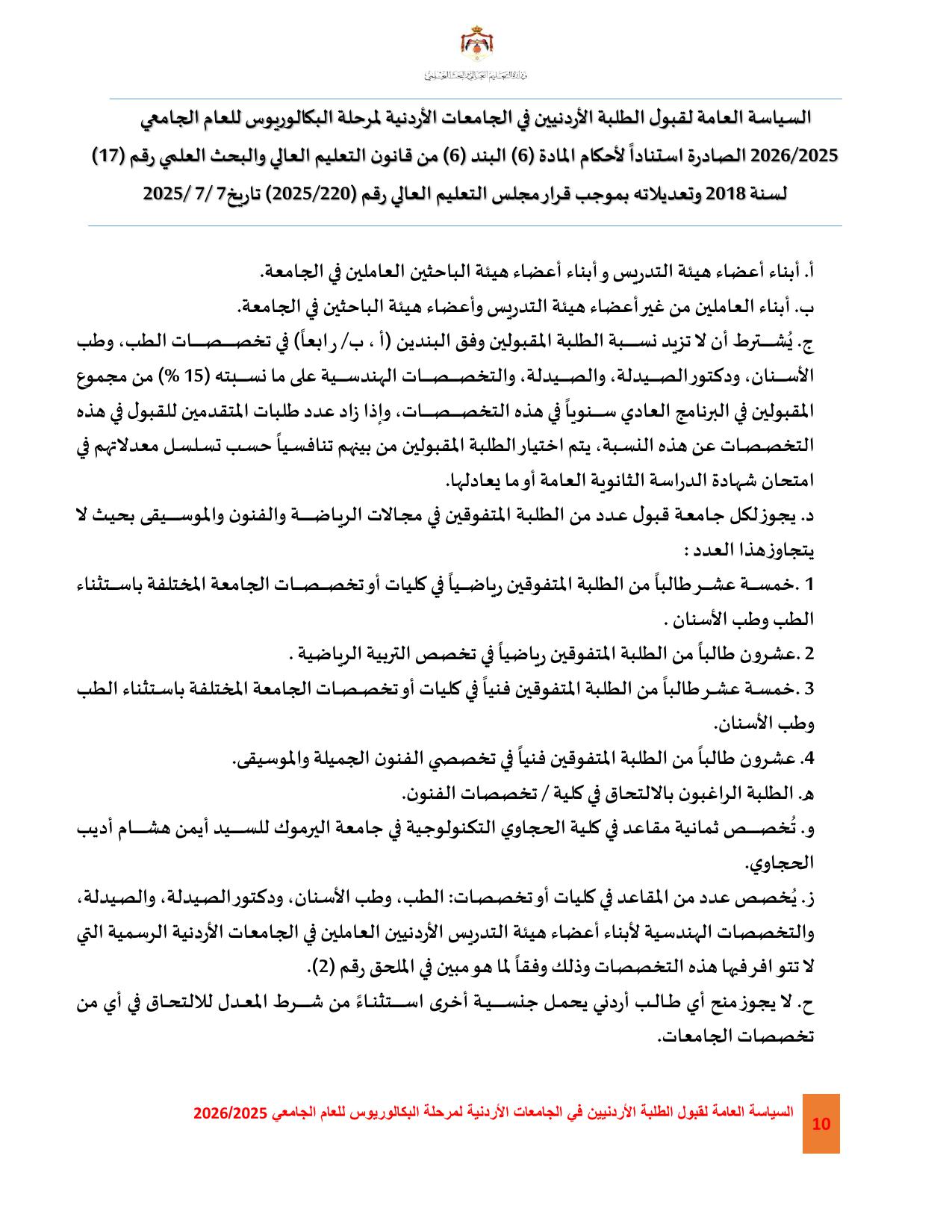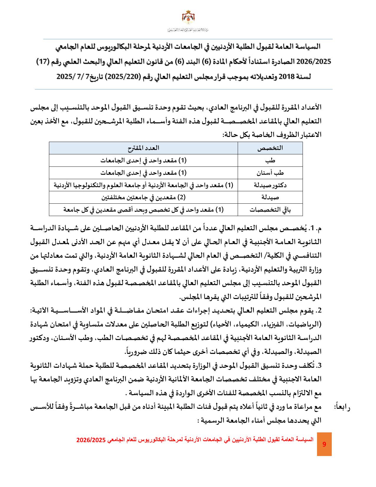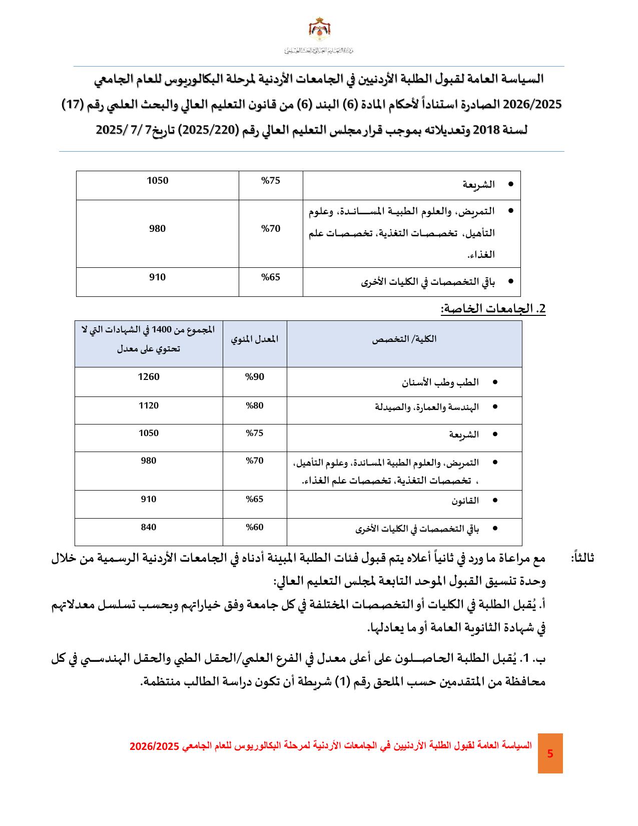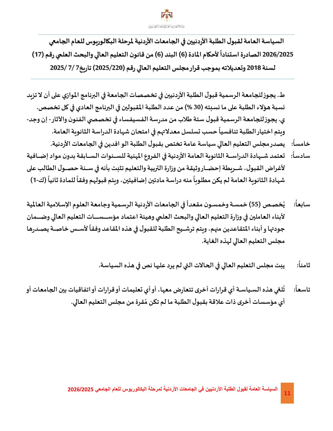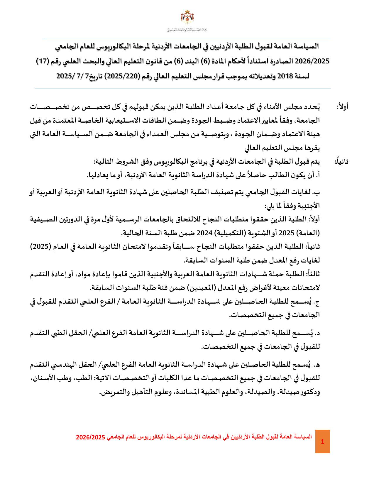 نشرت وحدة تنسيق القبول الموحد التابعة لوزارة التعليم العالي والبحث العلمي، السياسة العامة لقبول الطلبة في الجامعات الأردنية الرسمية والخاصة لمرحلة البكالوريوس للعام الجامعي 2026/2025.