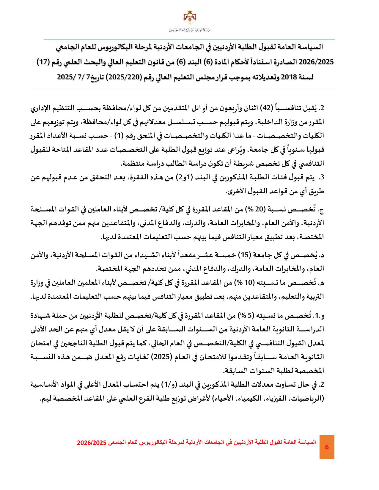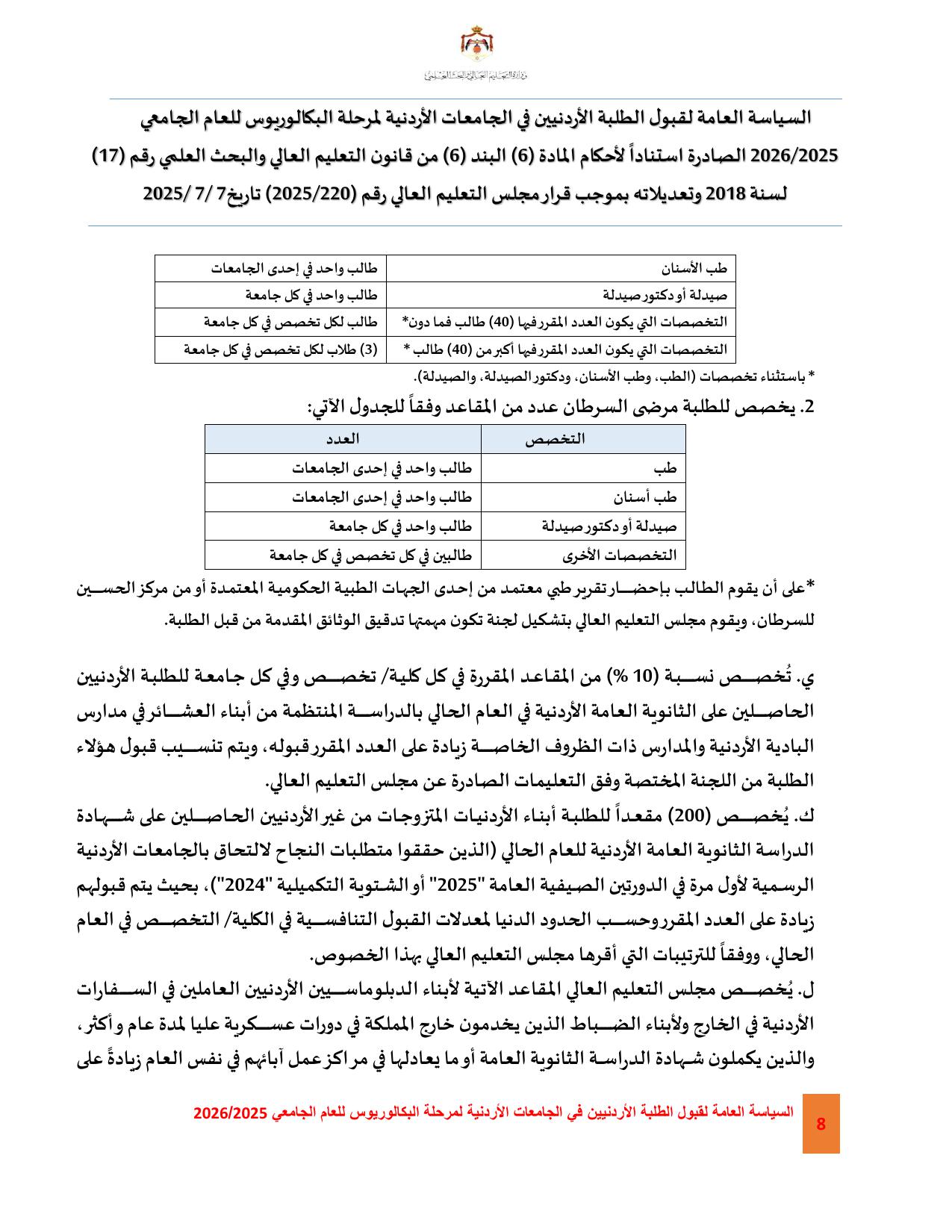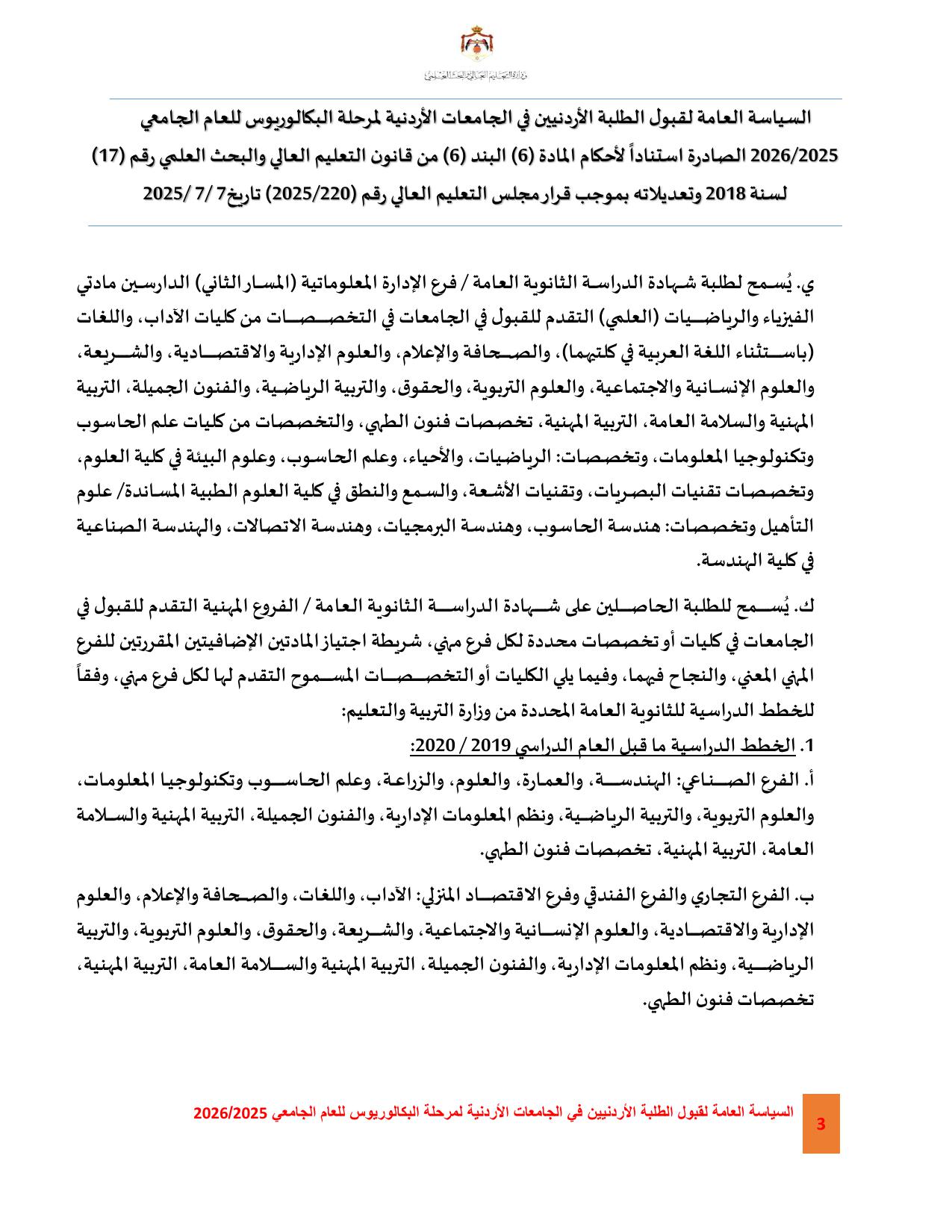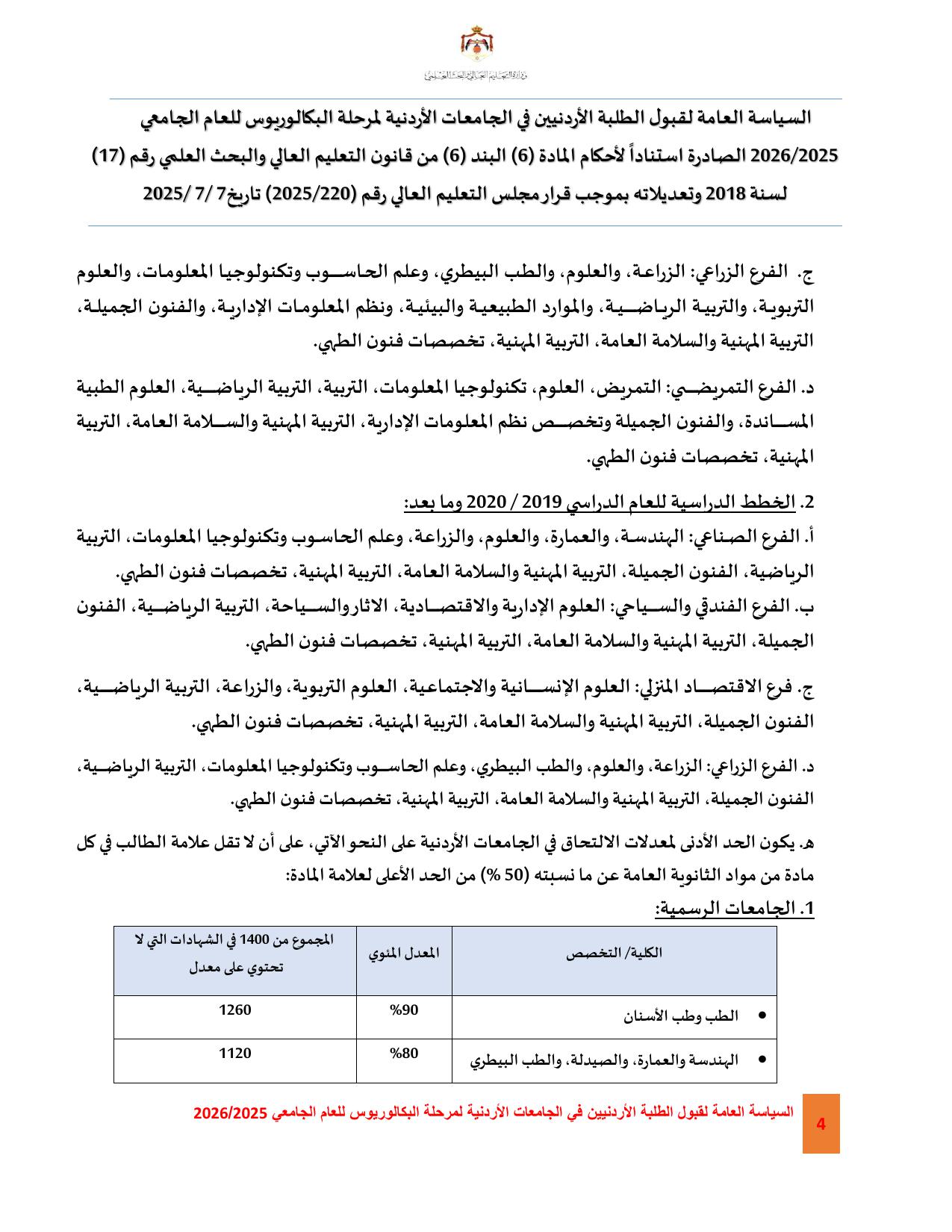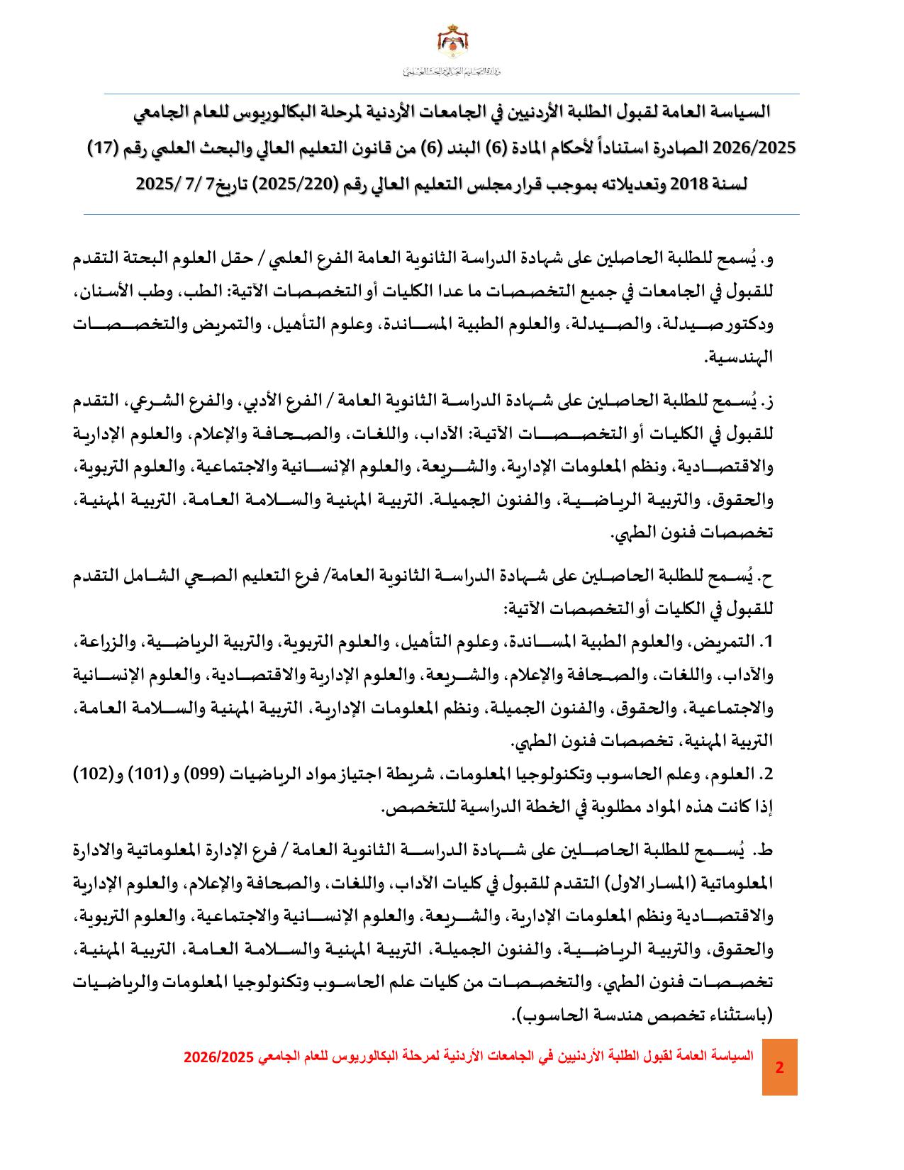 نشرت وحدة تنسيق القبول الموحد التابعة لوزارة التعليم العالي والبحث العلمي، السياسة العامة لقبول الطلبة في الجامعات الأردنية الرسمية والخاصة لمرحلة البكالوريوس للعام الجامعي 2026/2025.