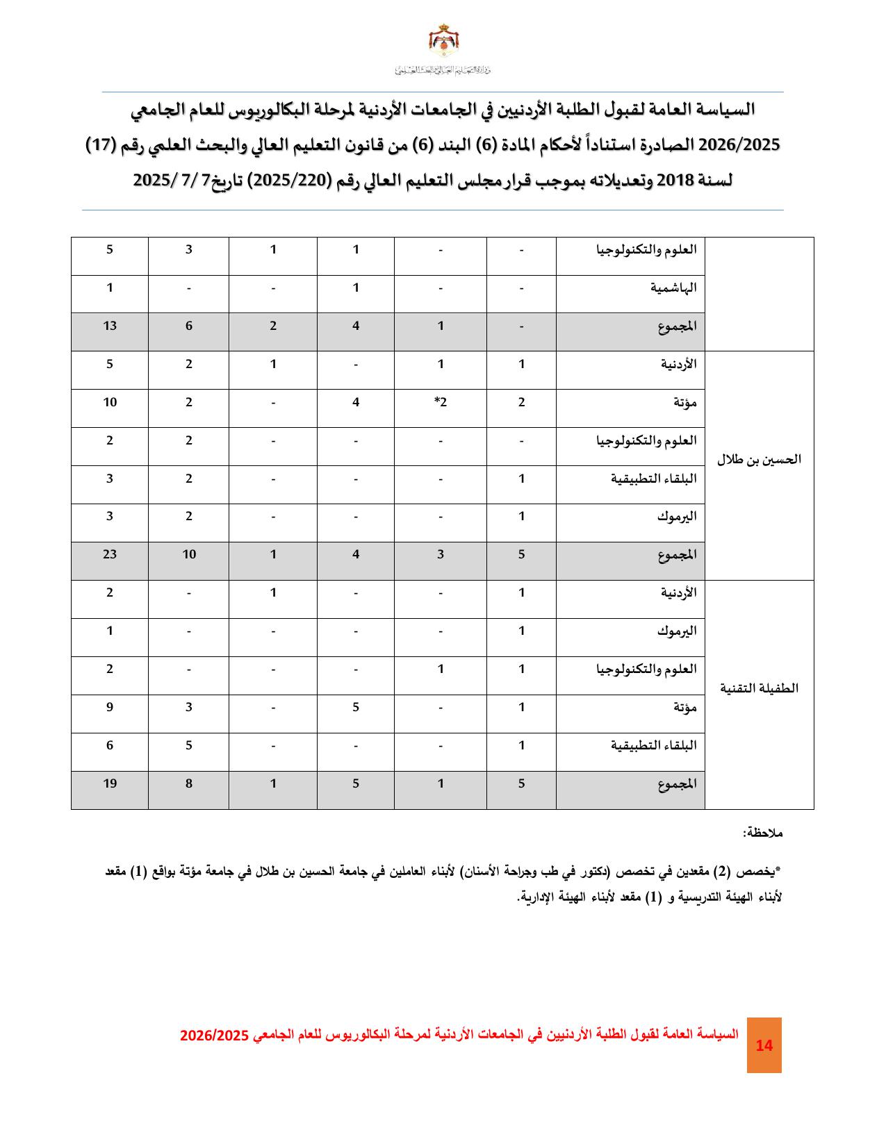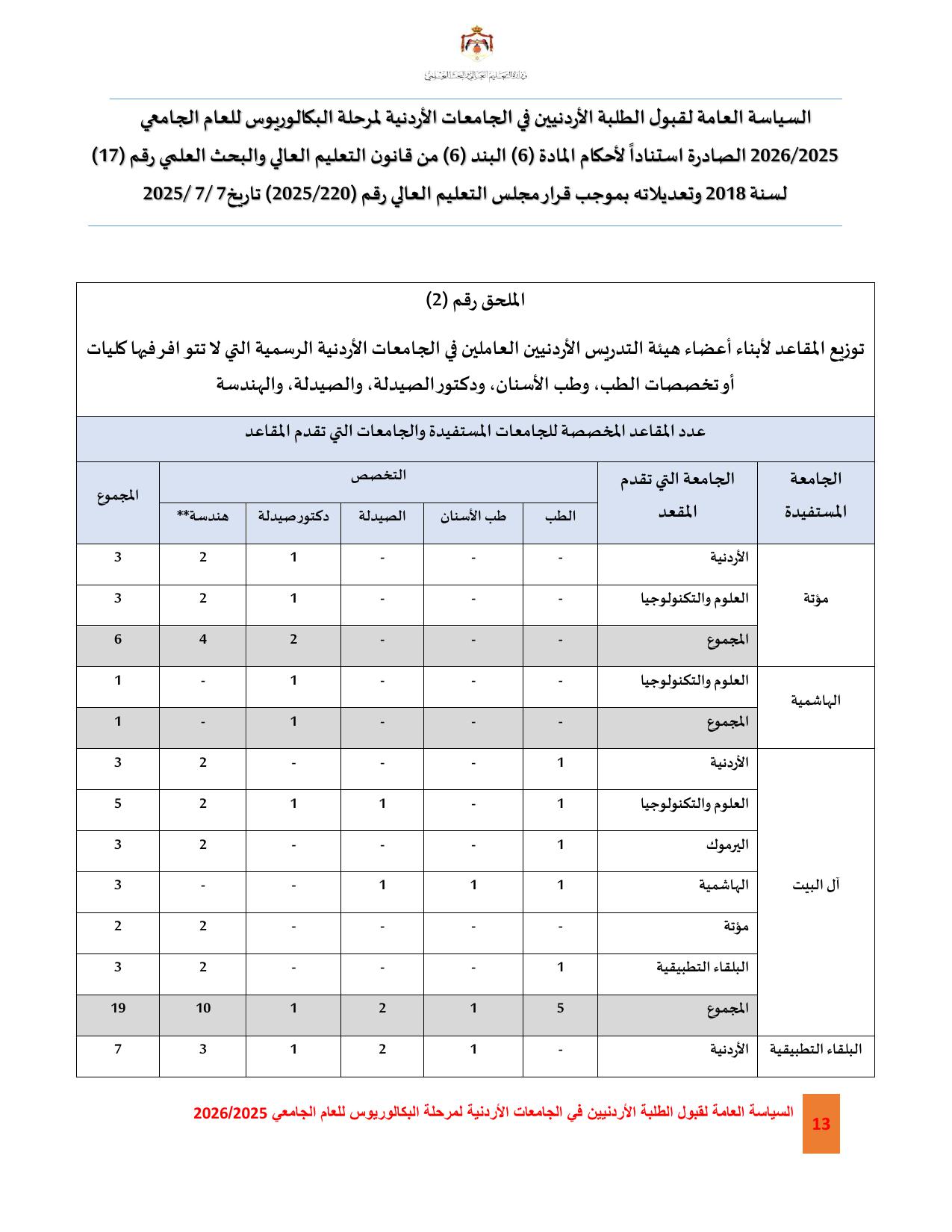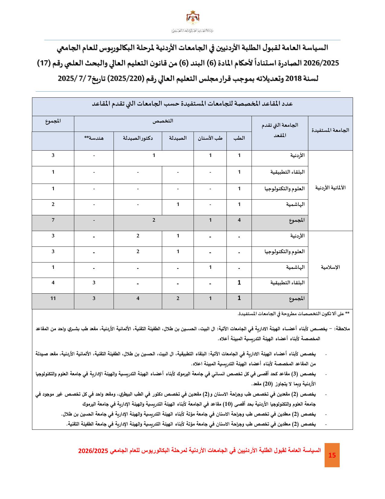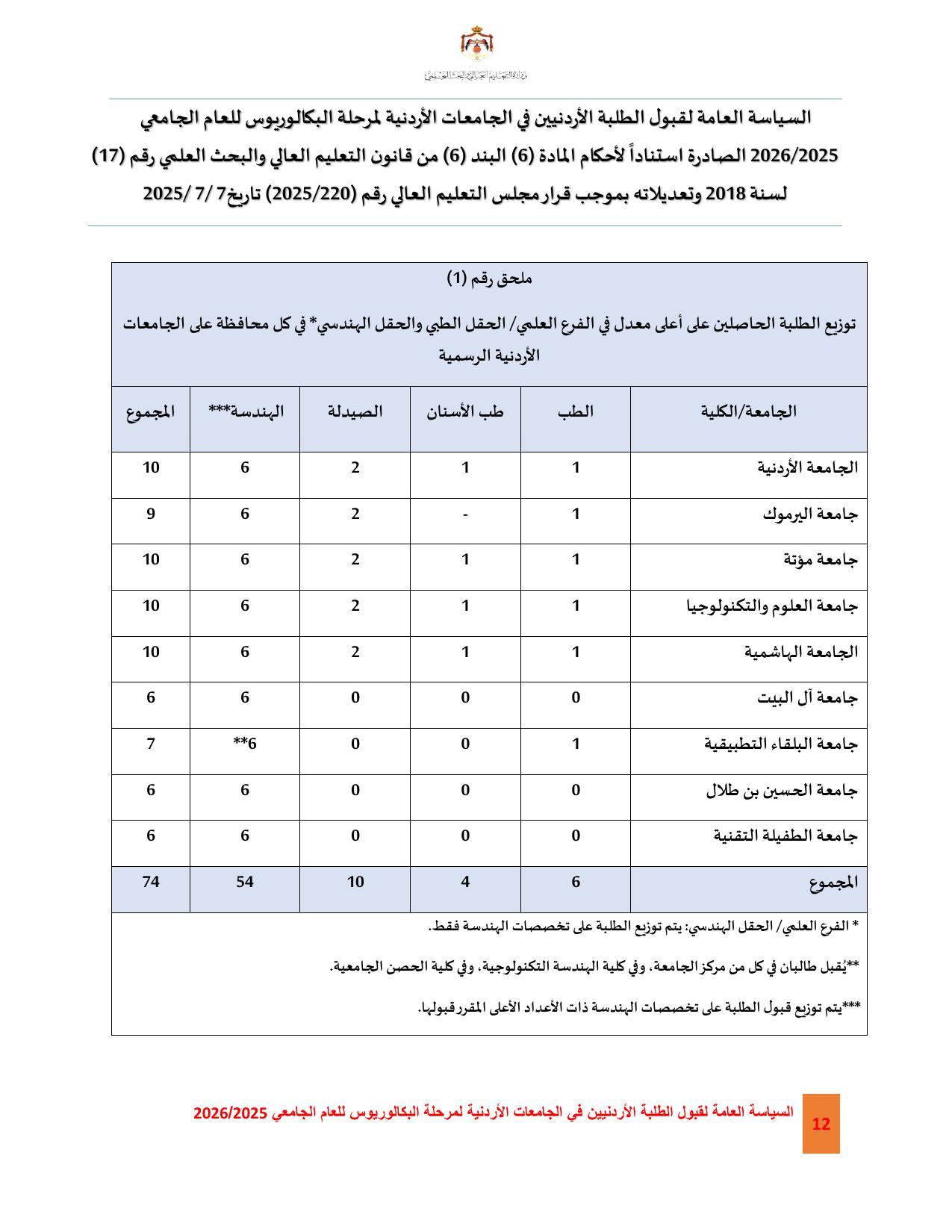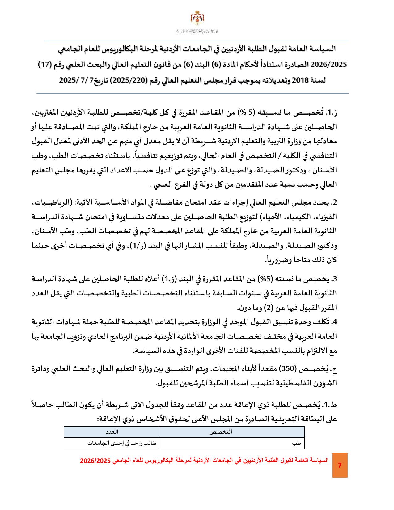 نشرت وحدة تنسيق القبول الموحد التابعة لوزارة التعليم العالي والبحث العلمي، السياسة العامة لقبول الطلبة في الجامعات الأردنية الرسمية والخاصة لمرحلة البكالوريوس للعام الجامعي 2026/2025.