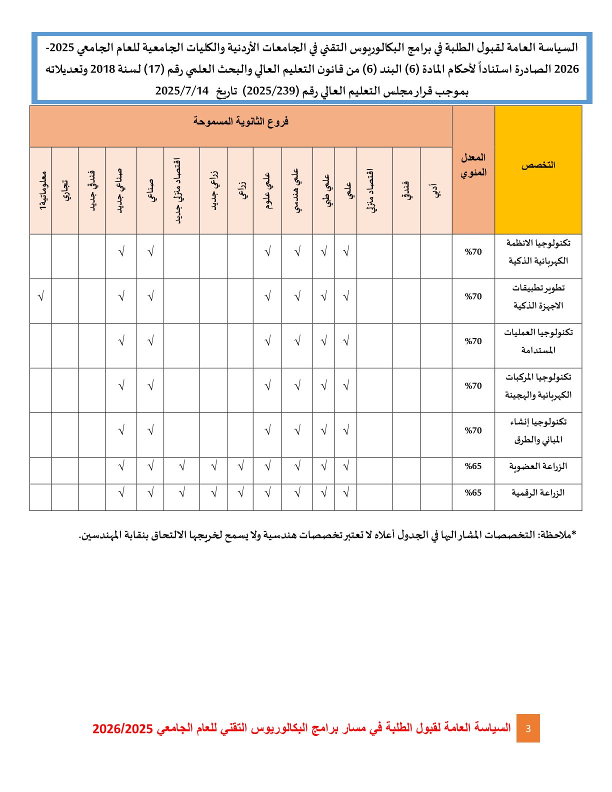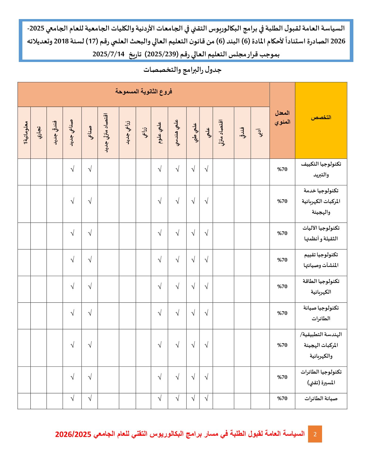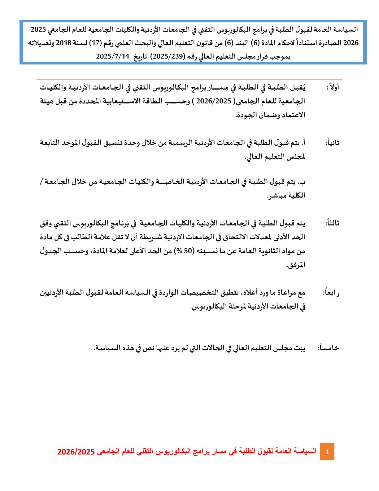 نشرت وحدة تنسيق القبول الموحد التابعة لوزارة التعليم العالي والبحث العلمي، السياسة العامة لقبول الطلبة في مسار برامج البكالوريوس التقني في جامعة البلقاء التطبيقية والكليات الجامعية التابعة لها للعام الجامعي 2026/2025