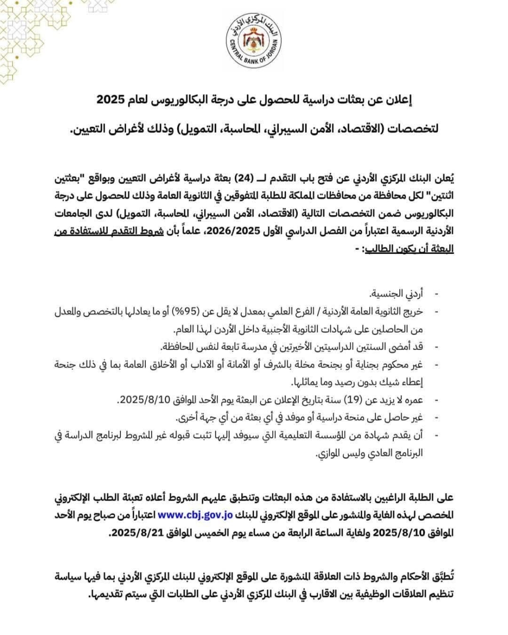 أعلن البنك المركزي الأردني عن فتح باب التقدم لـ (24) بعثة دراسية لأغراض التعيين، بواقع بعثتين لكل محافظة من محافظات المملكة، للطلبة المتفوقين في الثانوية العامة، وذلك للحصول على درجة البكالوريوس في تخصصات: الاقتصاد والأمن السيبراني والمحاسبة والتمويل.