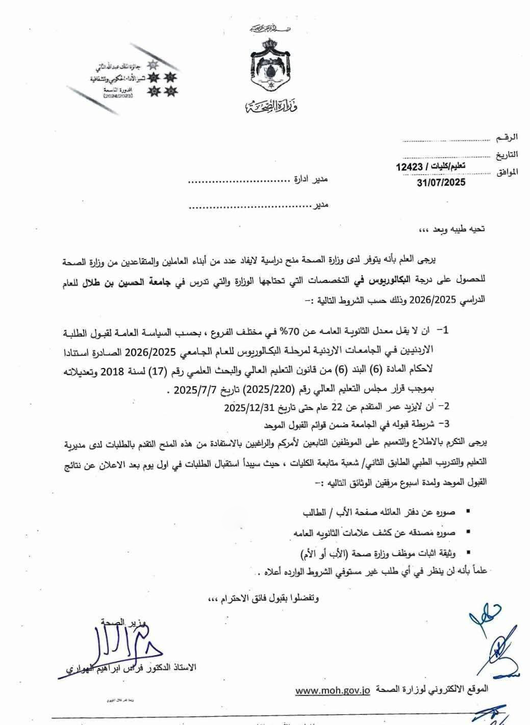 أعلنت وزارة الصحة عن توفر منح دراسية لأبناء العاملين والمتقاعدين لديها، بهدف إيفادهم للحصول على درجة البكالوريوس في التخصصات التي تحتاجها الوزارة، والتي تُدرّس في جامعة الحسين بن طلال للعام الجامعي 2025/2026.