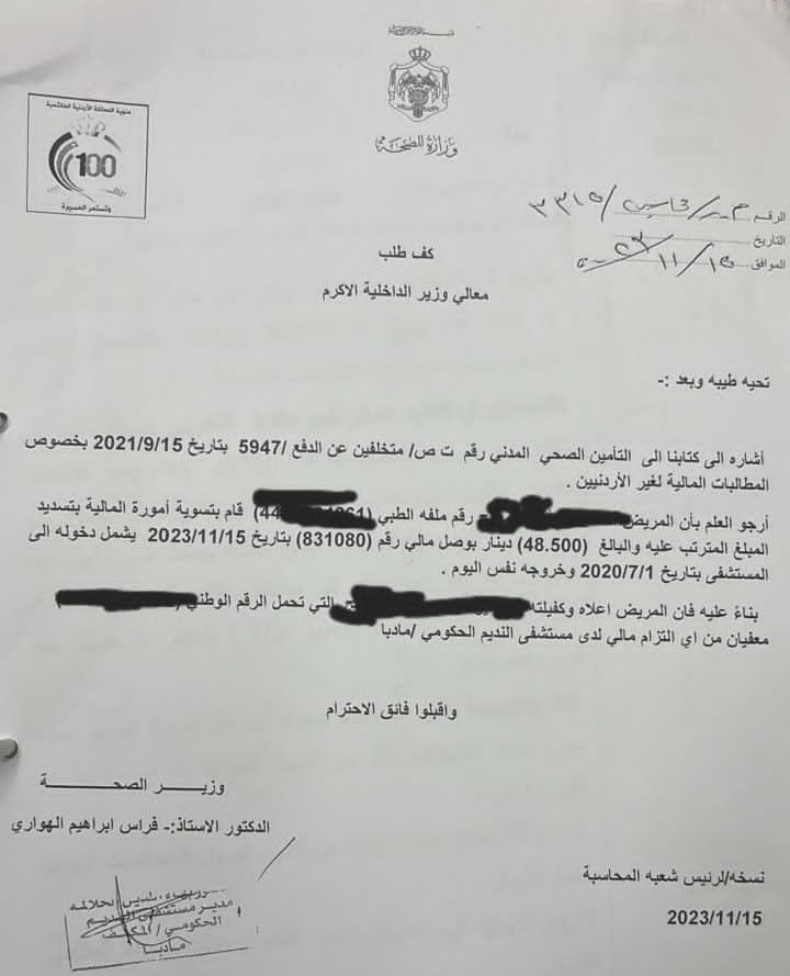 وبعد عام، تلقت السيدة طلبا من وزارة الداخلية لمراجعتها، حيث أُبلغت بوجود ذمة مالية مقدارها 48 دينارا لصالح المستشفى. وعند مراجعتها المستشفى، أوضحت أن طفلها أردني الجنسية وفقا لدفتر العائلة، إلا أن المستشفى رفض إسقاط المبلغ، ما دفعها إلى دفعه والحصول على وصل رسمي بذلك.