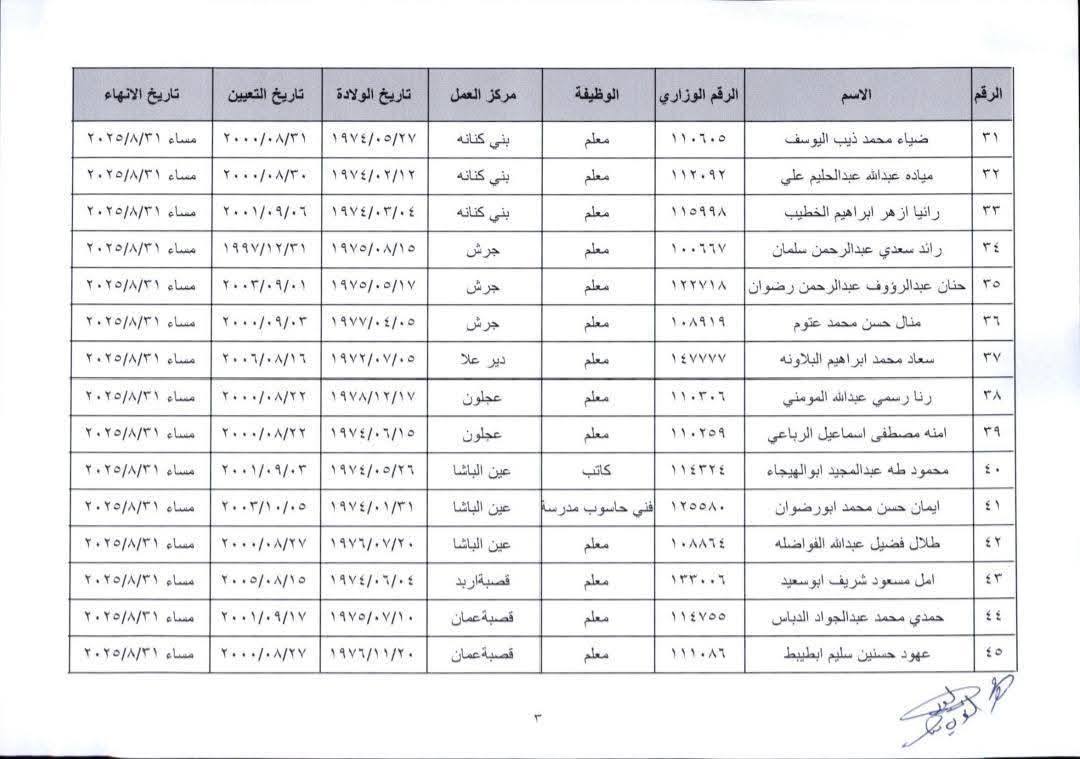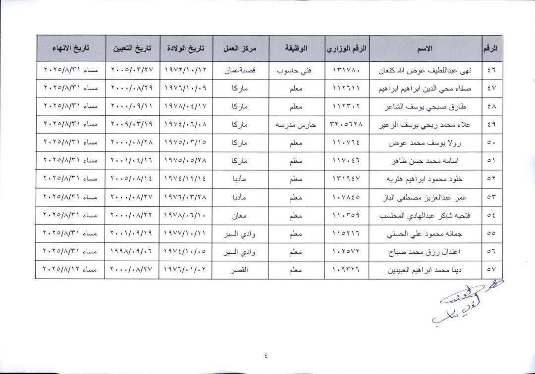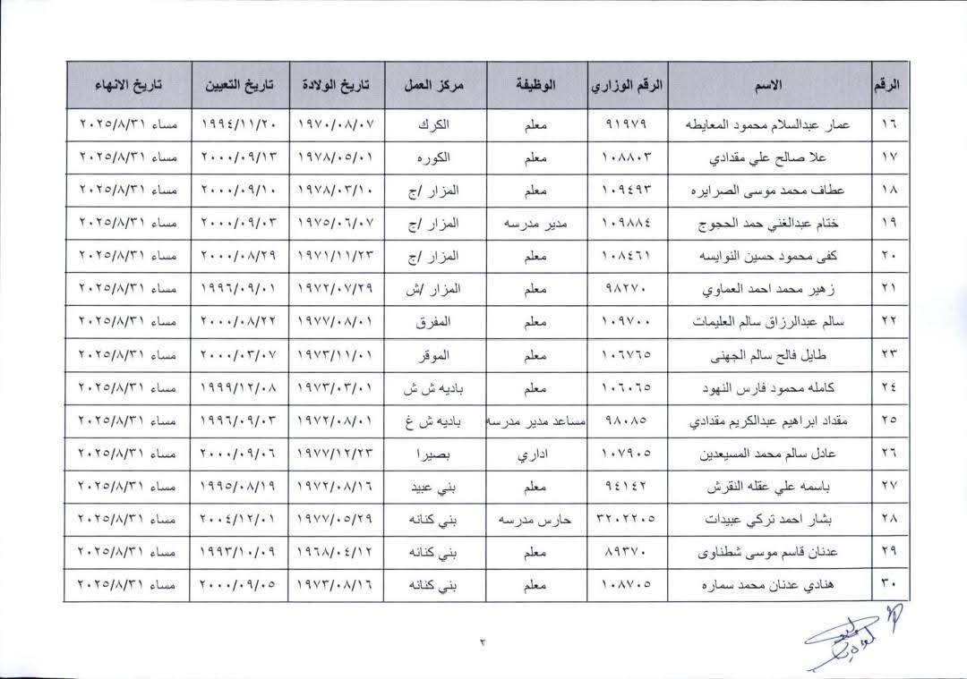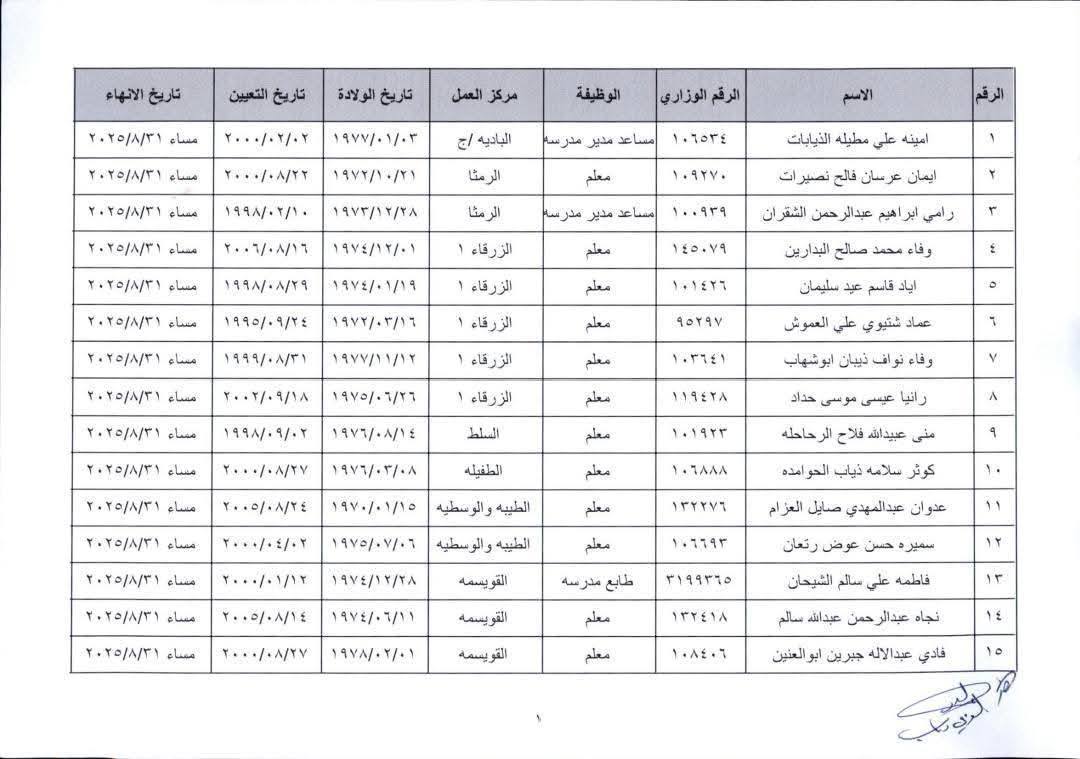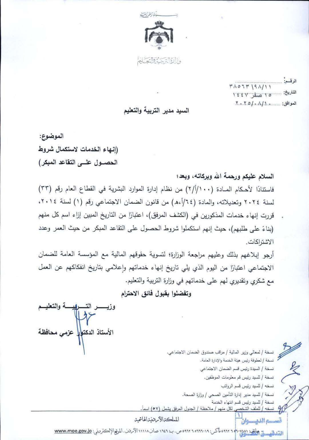 قرر وزير التربية والتعليم إنهاء خدمات عدد من الموظفين بناء على طلبهم حيث استكملوا شروط التقاعد المبكر.