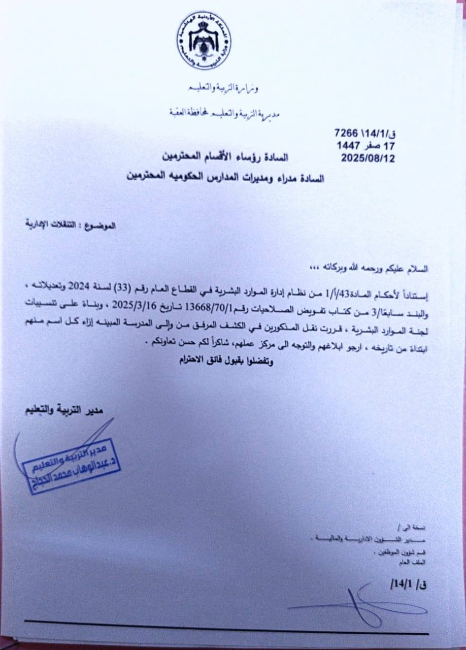 قرر مدير تربية العقبة، إجراء تنقلات لمديري مدارس ومعلمين تمشيا مع قرار تأنيث بعض المدارس، وتاليا التفاصيل والأسماء: