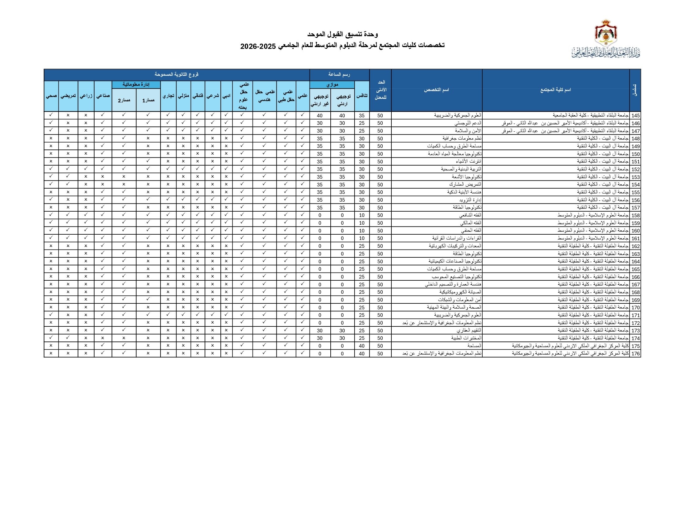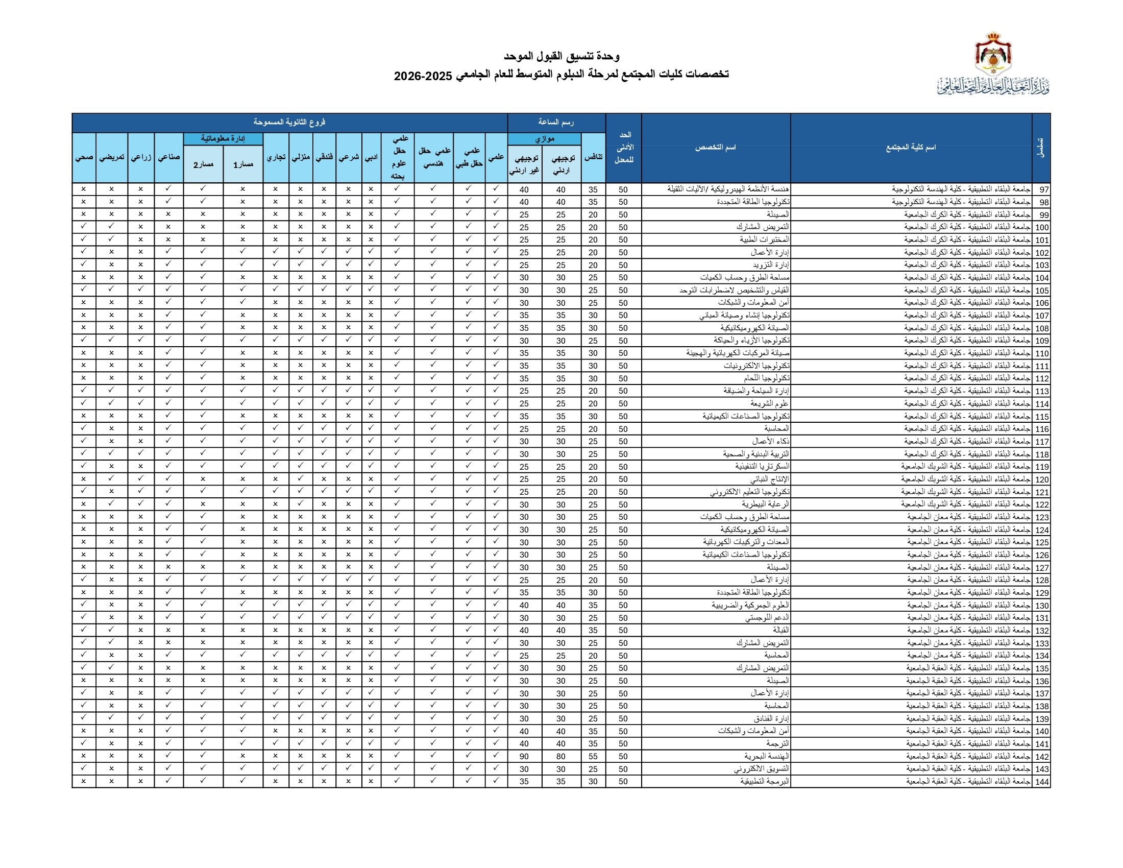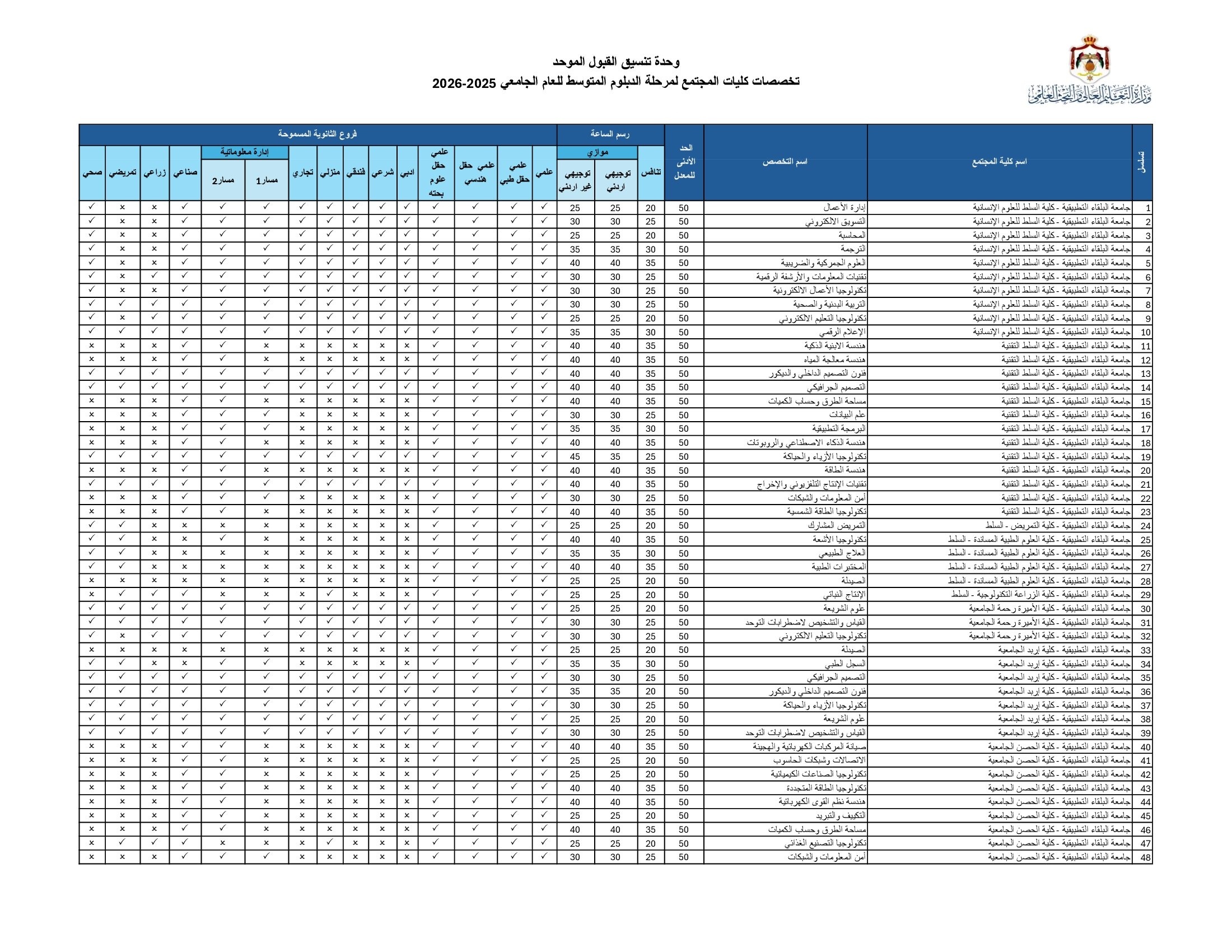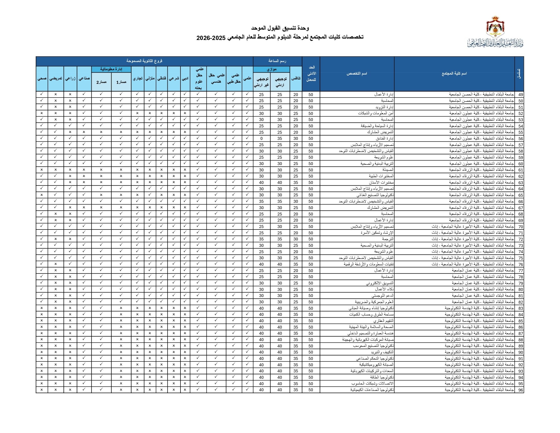 أعلنت وحدة تنسيق القبول الموحد في وزارة التعليم العالي والبحث العلمي، التخصصات المتاحة في كليات المجتمع، والحد الأدنى للقبول، ورسوم الساعات لكل تخصص.