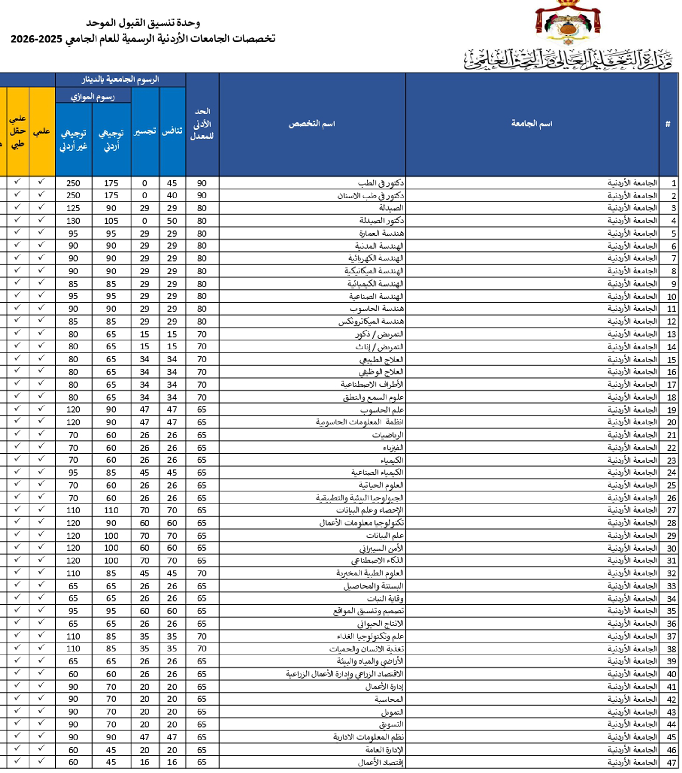 نشرت وحدة تنسيق القبول الموحد في وزارة التعليم العالي والبحث العلمي، رسوم جميع التخصصات المتاحة في الجامعات الرسمية.