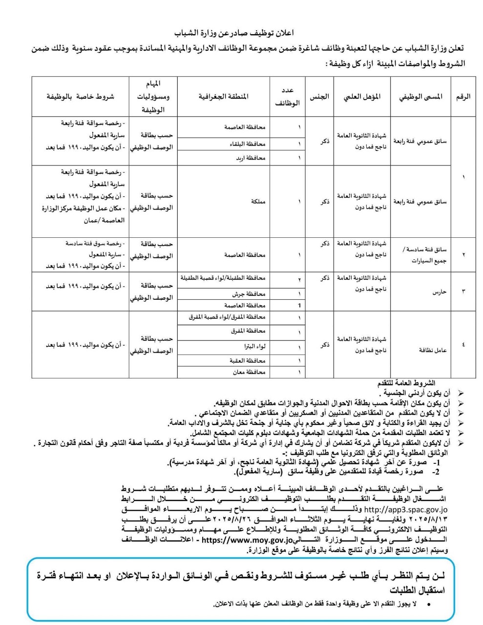 وفي السياق نفسه، أعلنت وزارة الشباب عن حاجتها لشغل وظائف إدارية ومهنية مساندة بعقود سنوية، وفق الشروط والمواصفات المحددة لكل وظيفة، على أن يتم التقديم عبر الرابط: app3.spac.gov.jo.