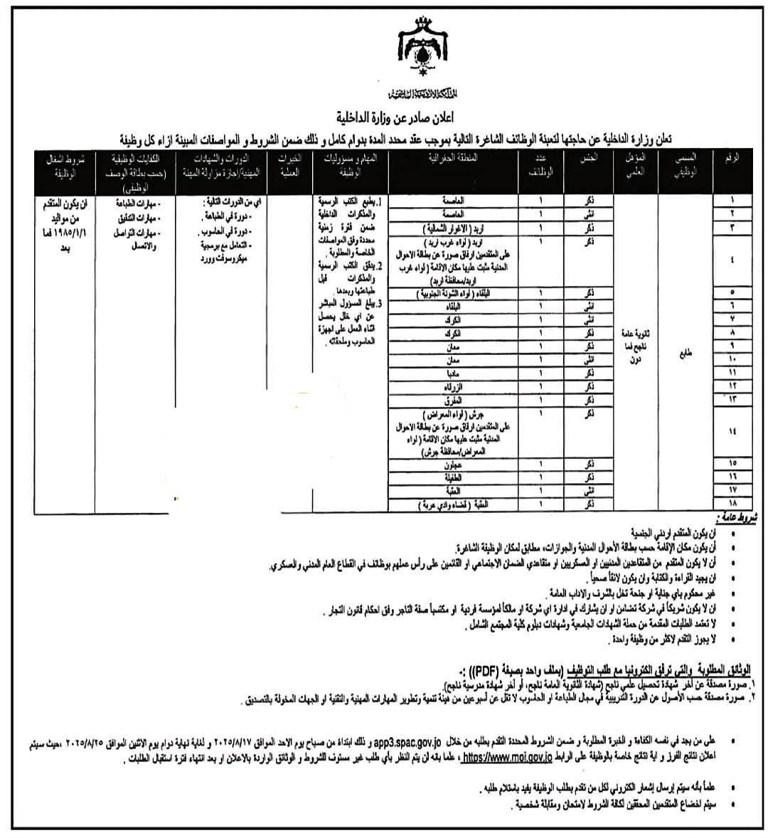أعلنت وزارة الداخلية عن حاجتها لتعبئة مجموعة من الوظائف الشاغرة بموجب عقد محدد المدة ودوام كامل، وفق الشروط والمواصفات المحددة لكل وظيفة. ودعت الوزارة الراغبين في التقدم ممن يجدون في أنفسهم الكفاءة والخبرة المطلوبة إلى تقديم طلباتهم عبر الرابط: app3.spac.gov.jo، اعتبارًا من صباح يوم الأحد 17 آب 2025 وحتى نهاية دوام يوم الاثنين 25 آب 2025.