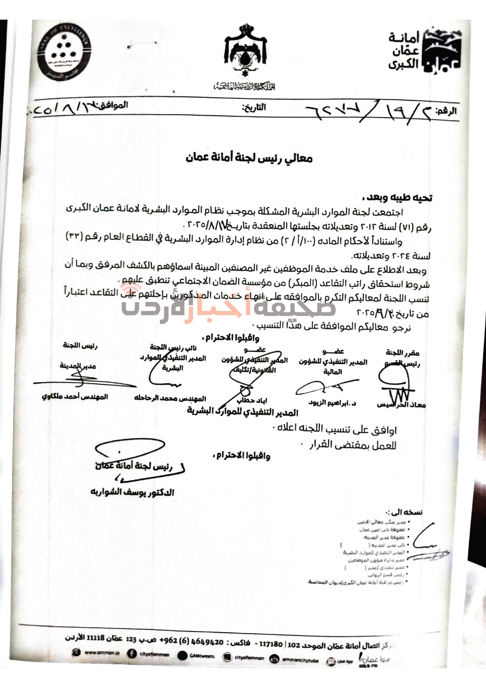 وأكدت اللجنة التنفيذية للموارد البشرية في توصيتها أنّ هذه الخطوة تهدف إلى تصويب الأوضاع الوظيفية، بما ينسجم مع نظام الخدمة المدنية وتعليمات التقاعد، حيث وقّع على التوصية عدد من المدراء المعنيين، قبل أن تحظى بموافقة رئيس لجنة الأمانة للعمل بمقتضاها.