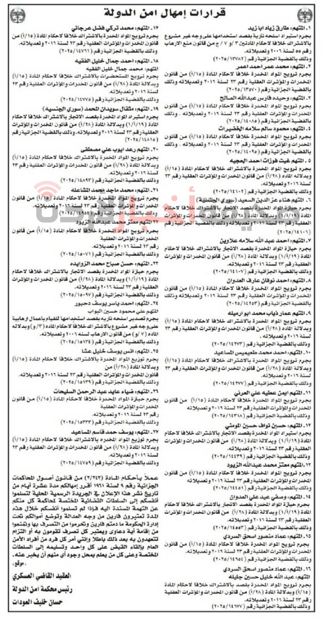 وبحسب ما ورد في المذكرات الرسمية المنشورة في الصحف اليومية، فإن الأسماء المدرجة في الجداول مطالَبة بمراجعة المحاكم المحددة مقابل أسمائهم، وذلك ضمن المواعيد القانونية، وتحت طائلة اعتبارهم متخلفين عن المثول أمام العدالة.