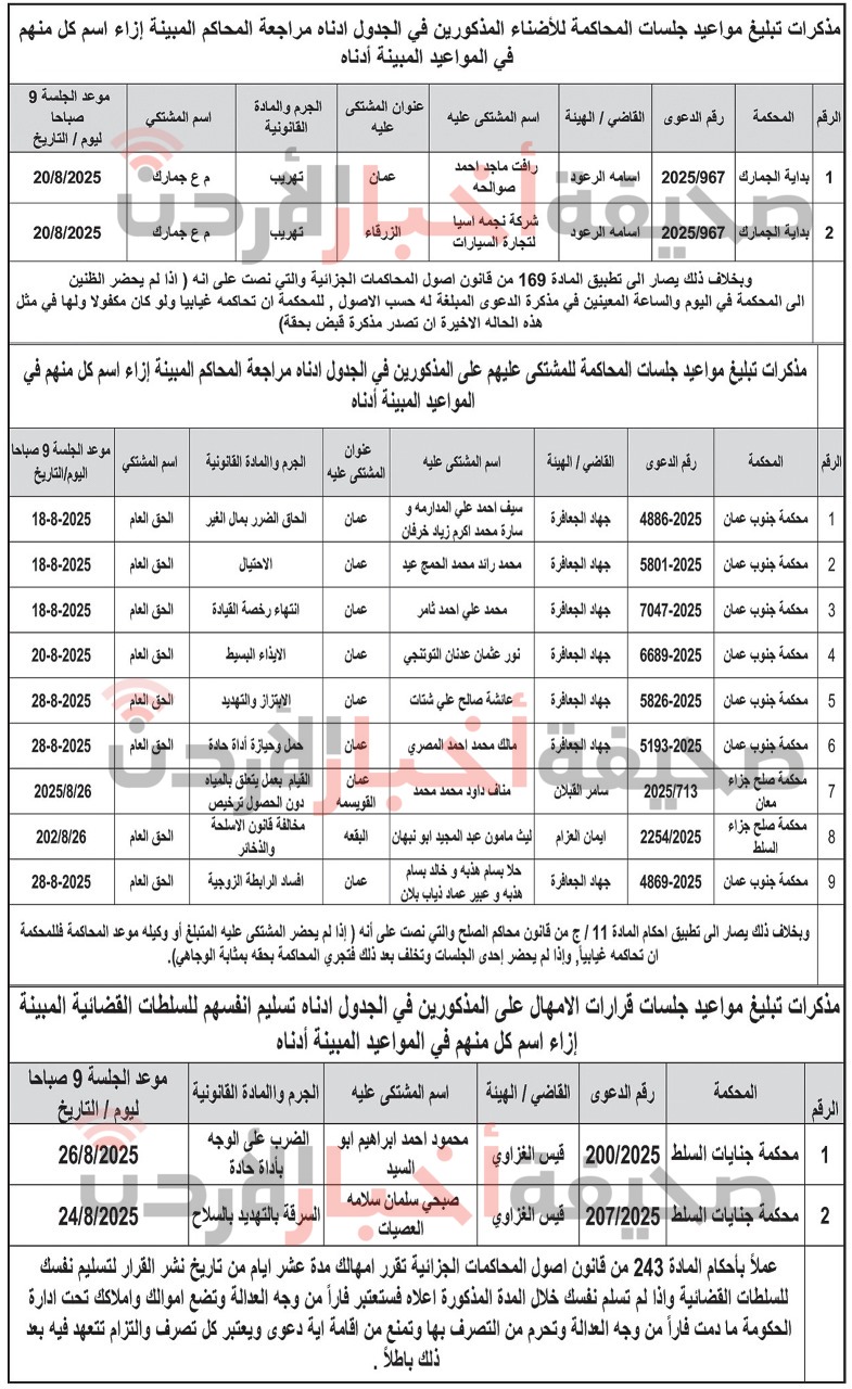 وفي السياق ذاته، أصدرت محاكم أخرى في المملكة مذكرات تبليغ لحضور جلسات محاكمة بحق عدد من المشتكى عليهم والمتهمين، إلى جانب قرارات إمهال لمراجعة المحاكم، وذلك لضمان سير العدالة وحضور الأطراف المطلوبة أمام الهيئات القضائية في المواعيد المقررة.