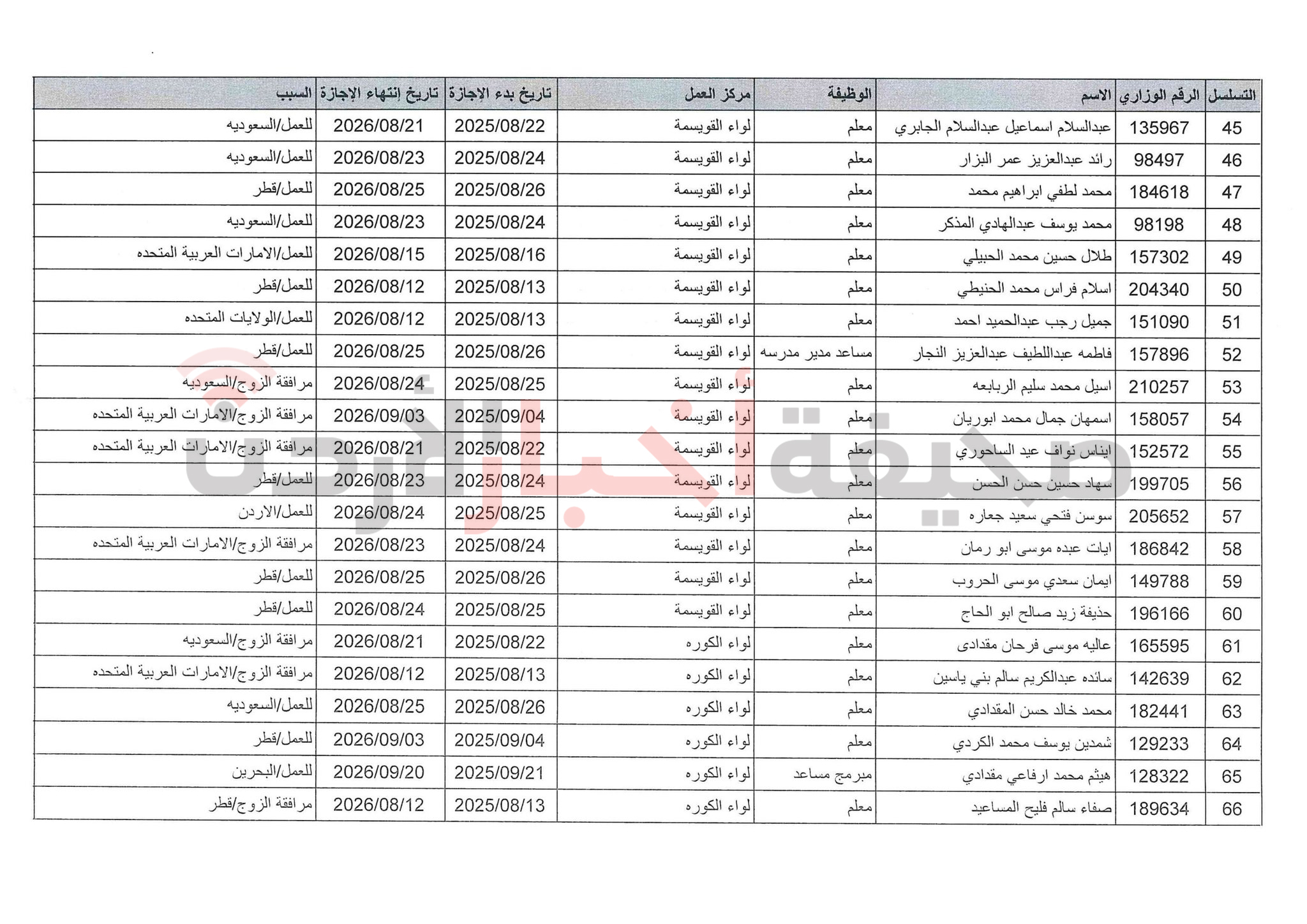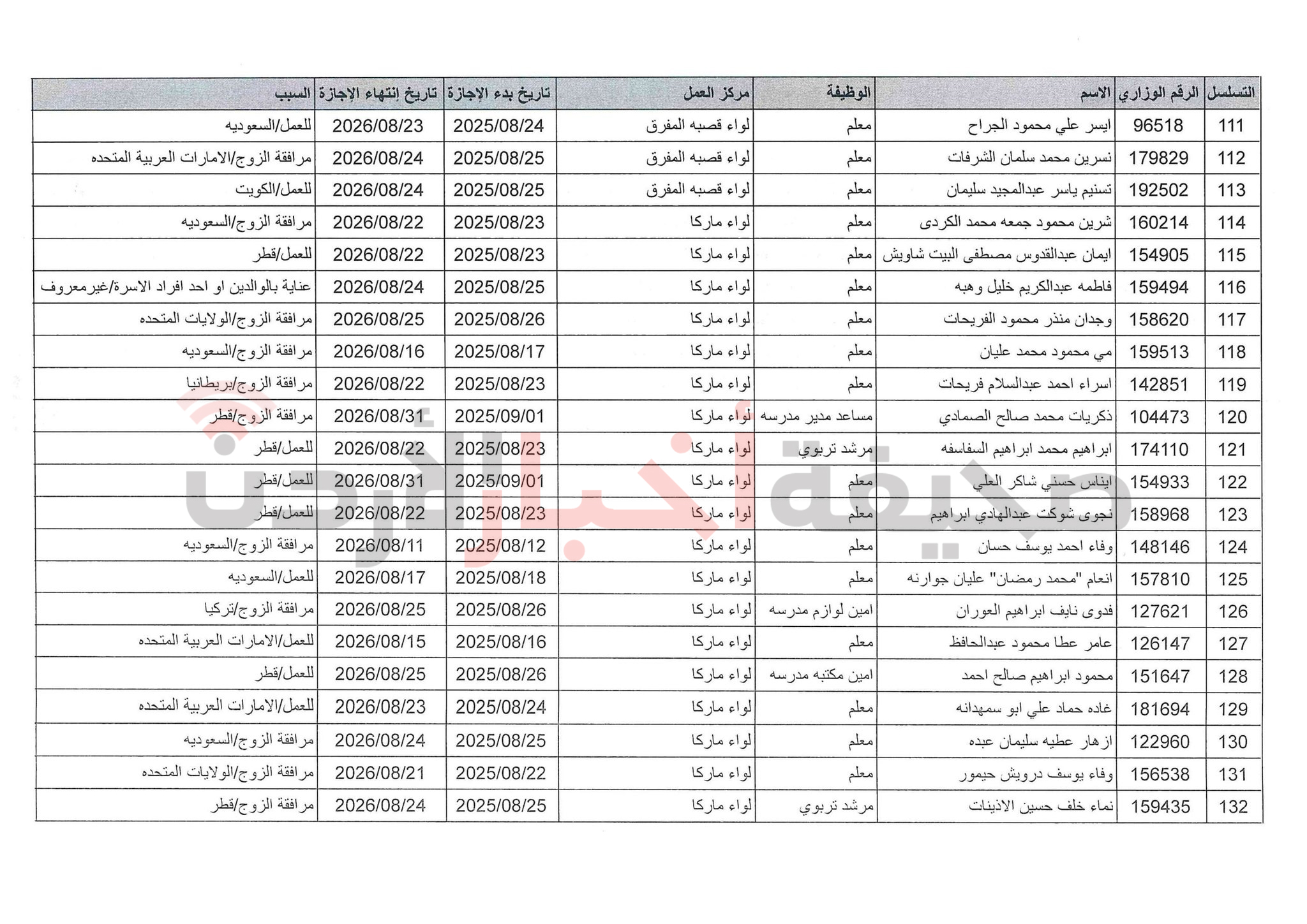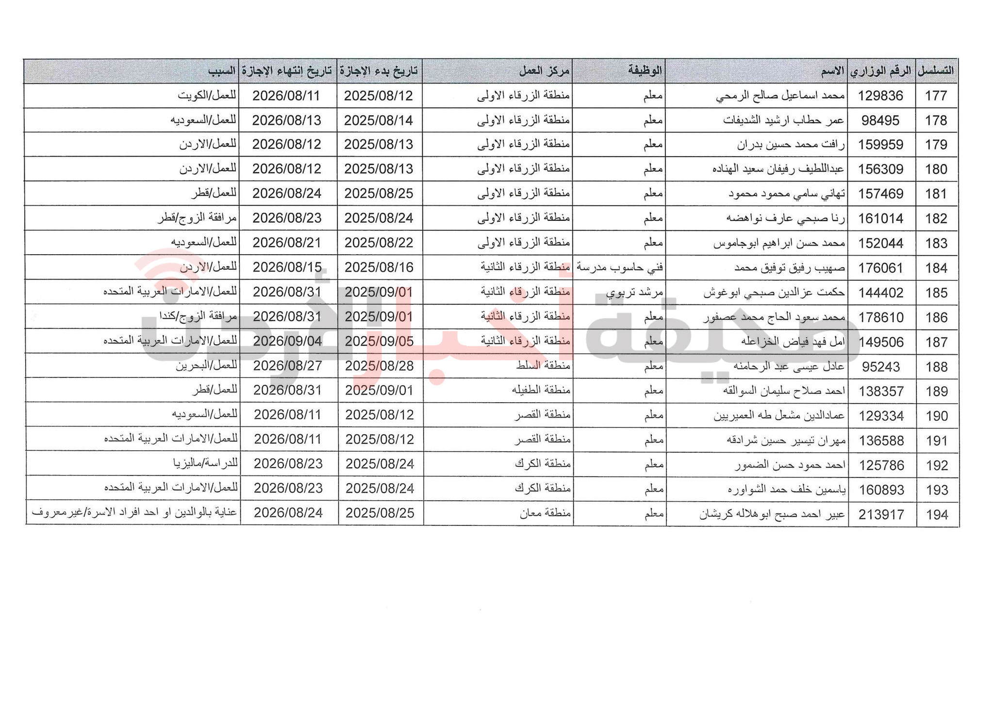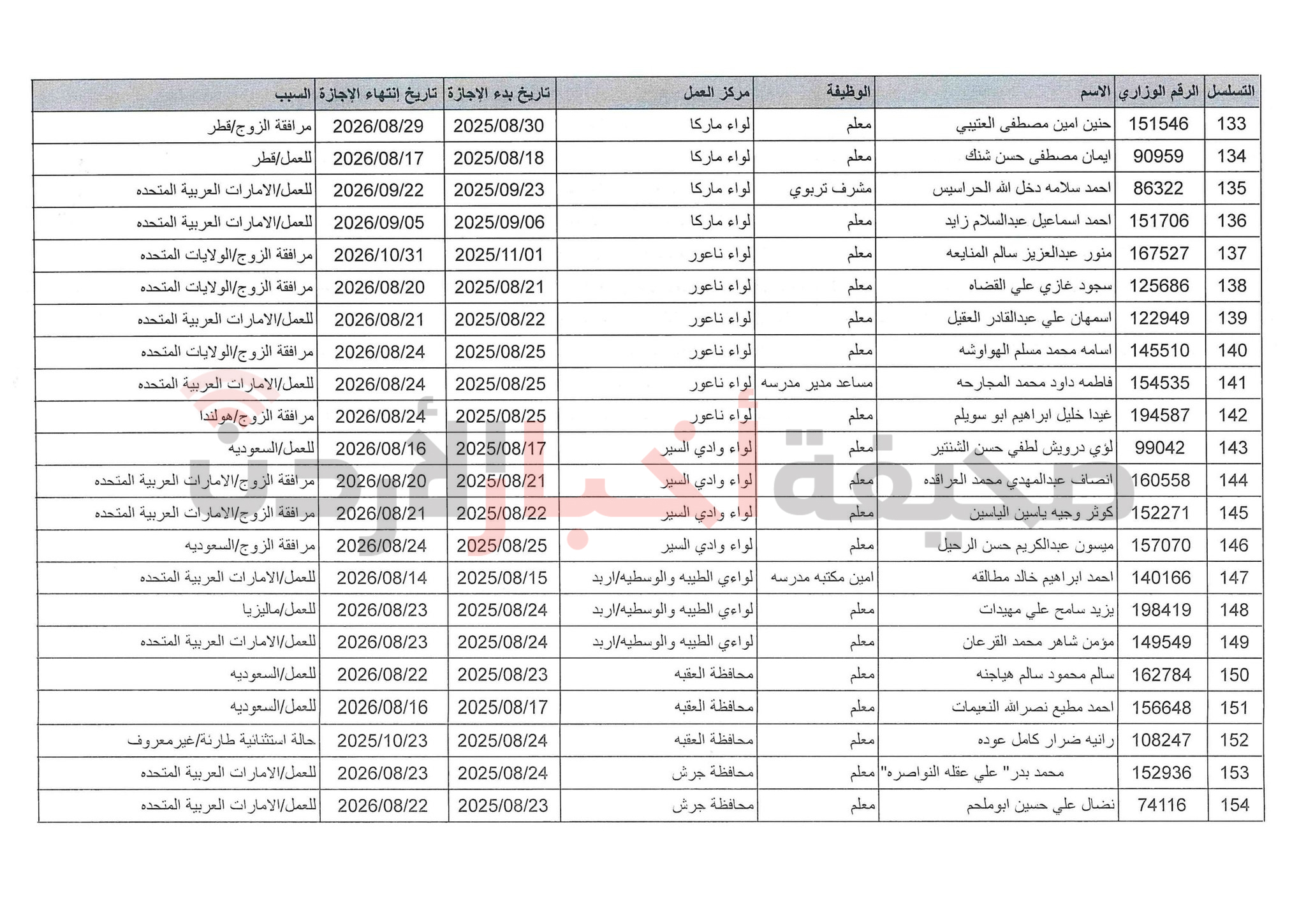 حصل 194 معلما وموظفا في وزارة التربية والتعليم على موافقة لمنحهم إجازة بدون راتب وفق الأنظمة السارية، وتاليا الأسماء والتفاصيل: