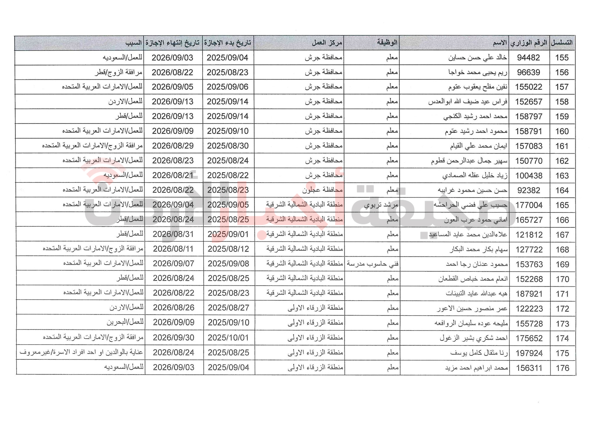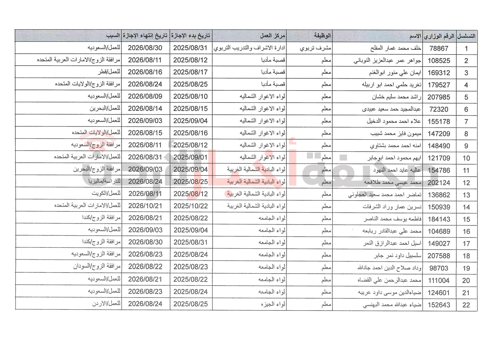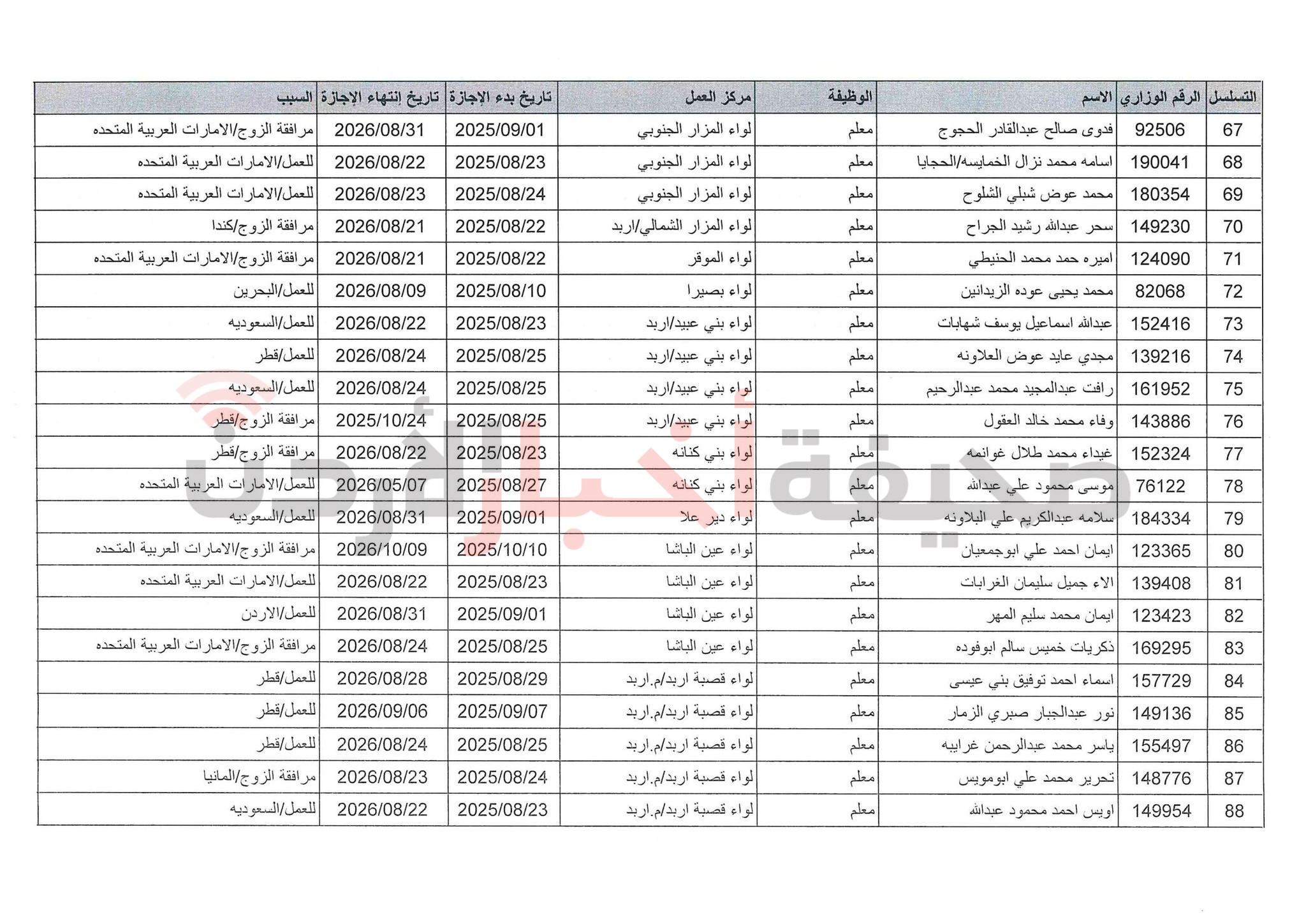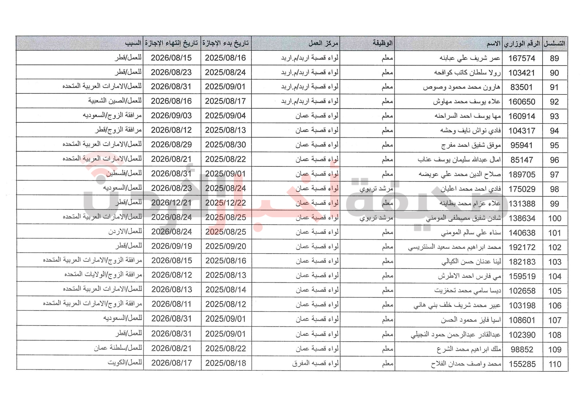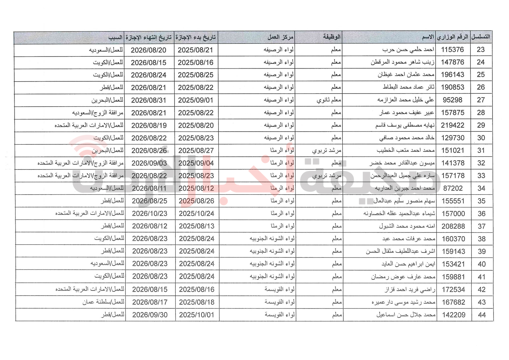 حصل 194 معلما وموظفا في وزارة التربية والتعليم على موافقة لمنحهم إجازة بدون راتب وفق الأنظمة السارية، وتاليا الأسماء والتفاصيل: