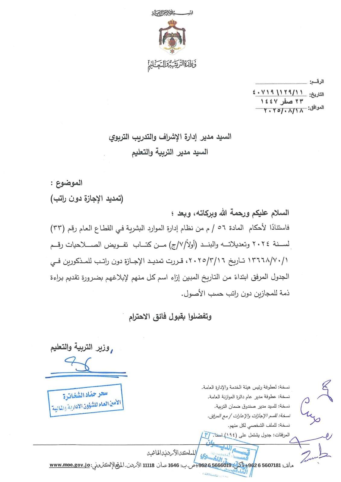 إجازات بدون راتب لـ194 معلما وموظفا في التربية (أسماء)