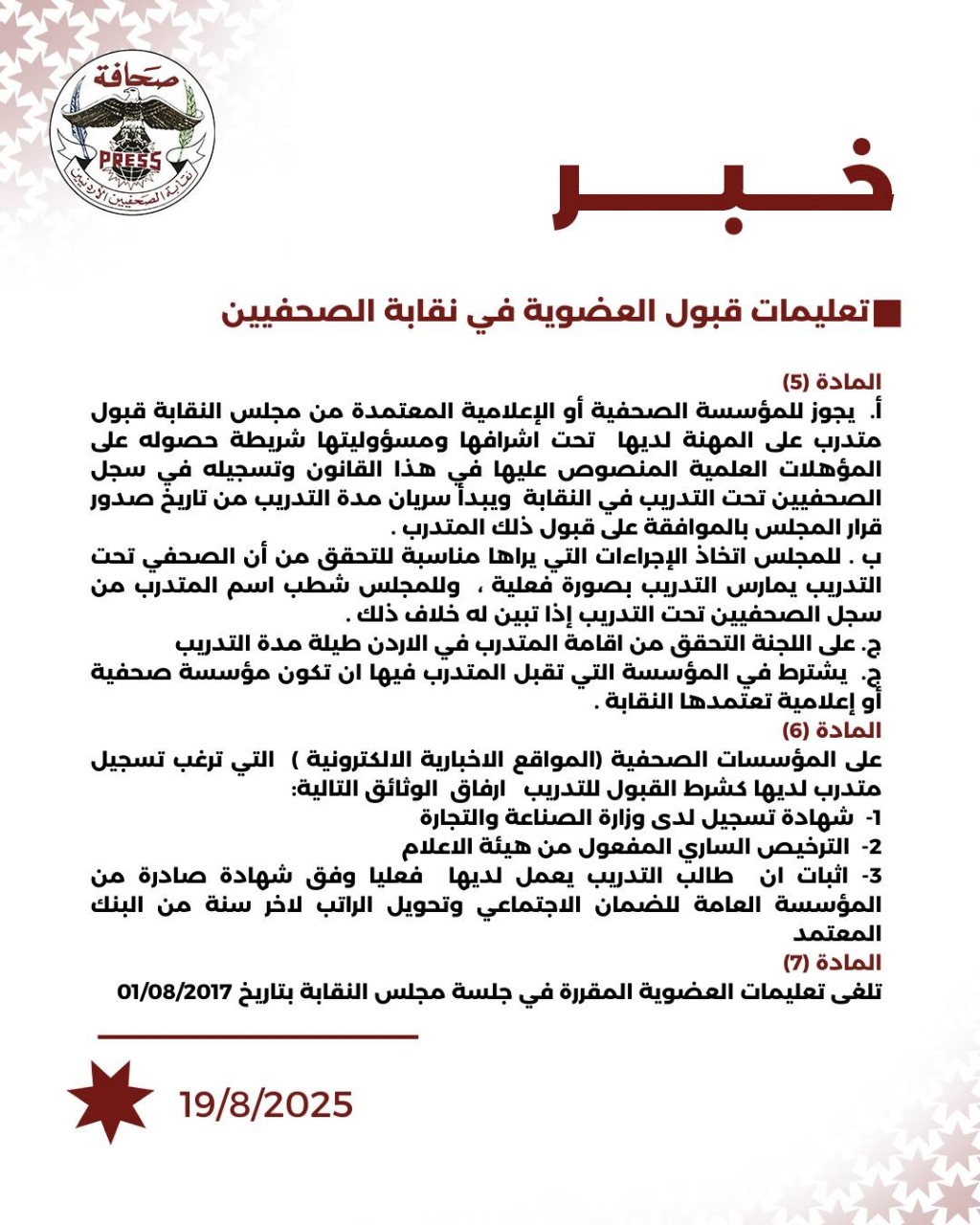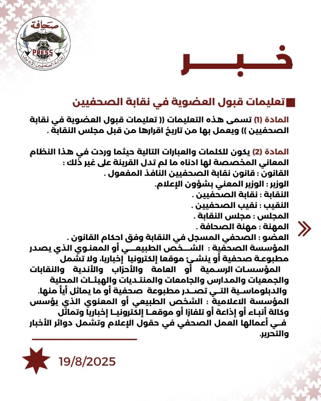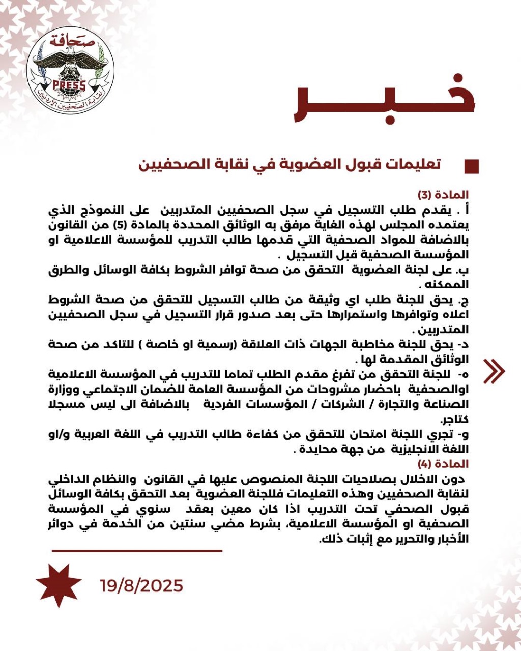 فيما يلي تعليمات قبول العضوية في نقابة الصحفيين الأردنيين:
