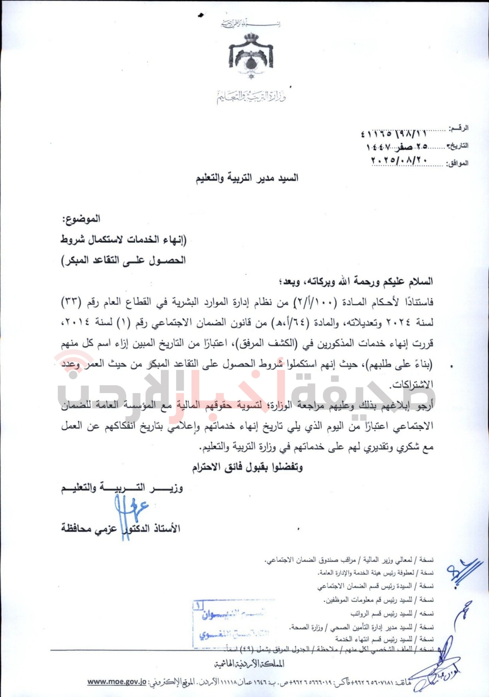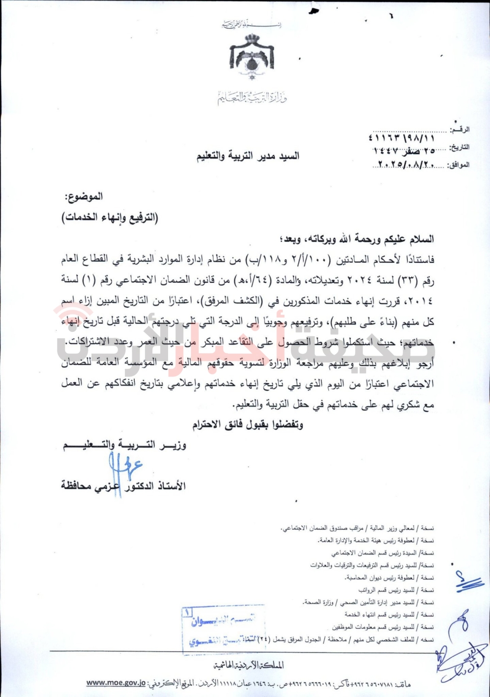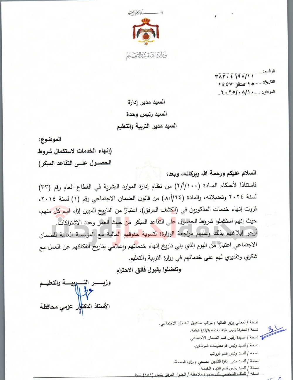قرر وزير التربية والتعليم، عزمي محافظة، إنهاء خدمات المئات من الموظفين في الوزارة بعد استكمالهم شروط الحصول على التقاعد المبكر من حيث العمر وعدد الاشتراكات، كما قرر الوزير ترفيع موظفين آخرين وإنهاء خدماتهم.