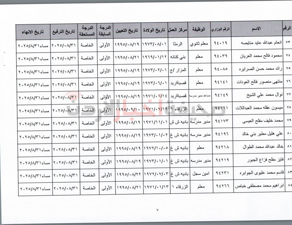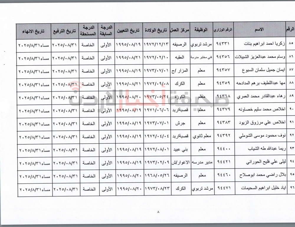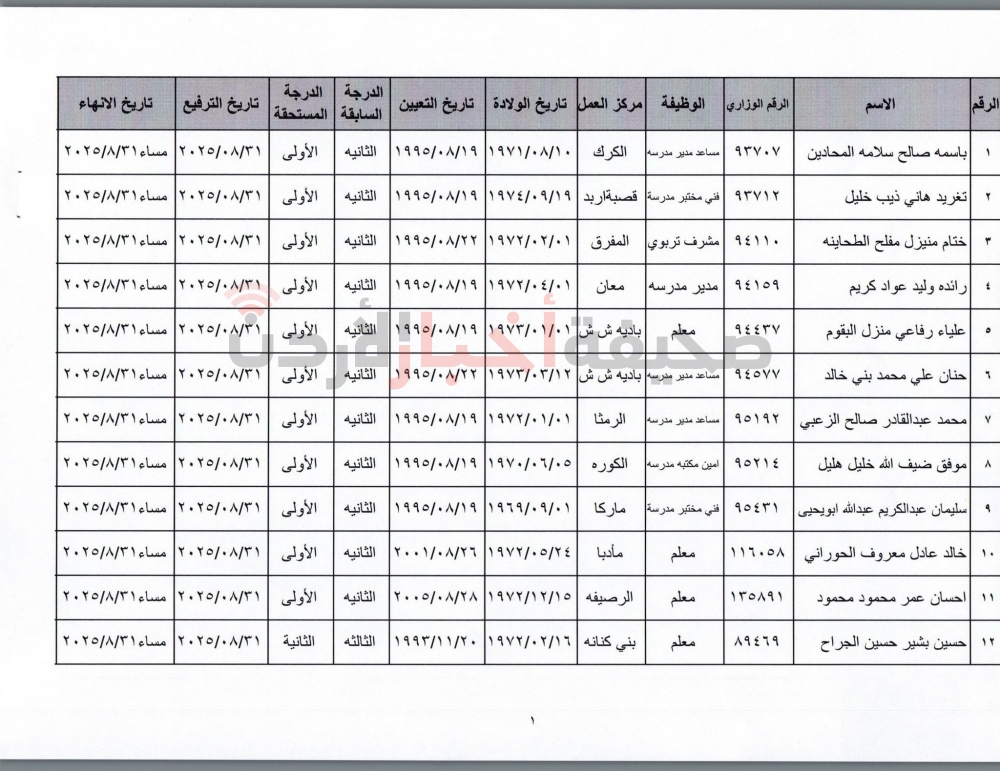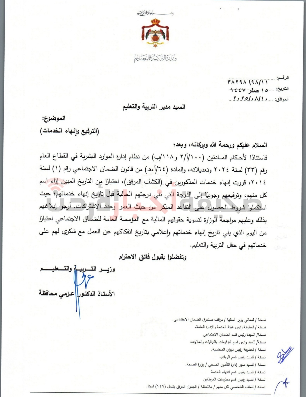 قرر وزير التربية والتعليم، عزمي محافظة، إنهاء خدمات المئات من الموظفين في الوزارة بعد استكمالهم شروط الحصول على التقاعد المبكر من حيث العمر وعدد الاشتراكات، كما قرر الوزير ترفيع موظفين آخرين وإنهاء خدماتهم.