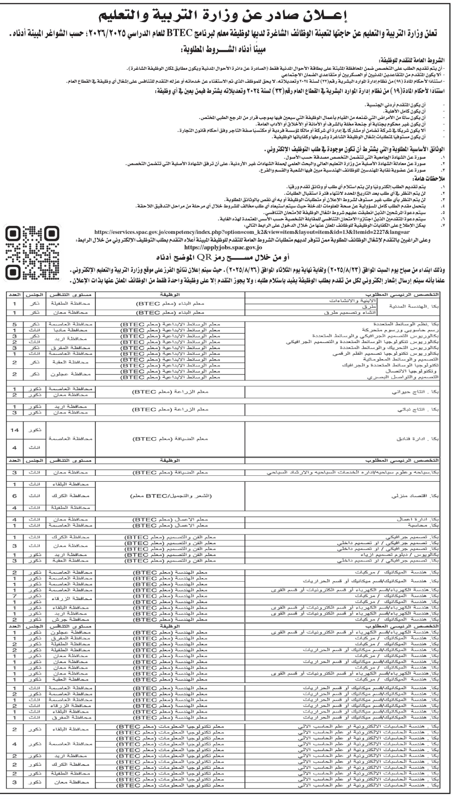 أعلنت وزارة التربية والتعليم عن حاجتها لتعبئة الوظائف الشاغرة لديها ضمن برنامج BTEC للعام الدراسي 2025/2026، داعية الراغبين بالتقديم ممن تتوفر لديهم الشروط العامة للتقدم إلى التسجيل الإلكتروني عبر الرابط applyjobs.spac.gov.jo