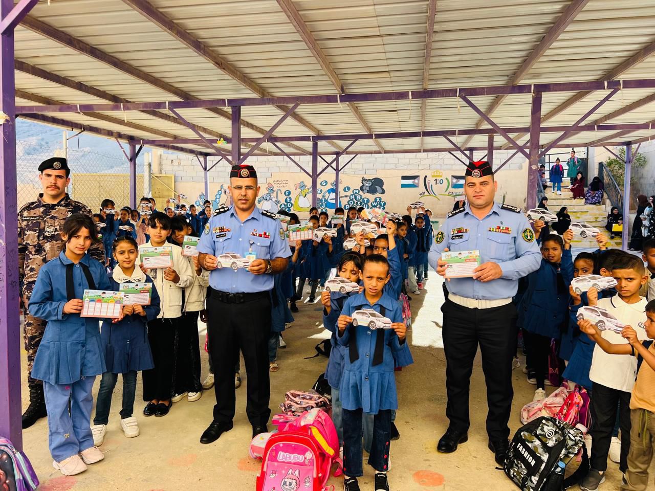 ووزعت مديرية الإعلام والشرطة المجتمعية، وإدارة السير، والمعهد المروري هدايا في عدد من المدارس في مواقع مختلفة تضمنت حقائب، وقرطاسية، ودفاتر رسم، وعلب ألوان، وجداول مدرسية، دُوّن عليها نصائح توعوية مهمة للطلاب.