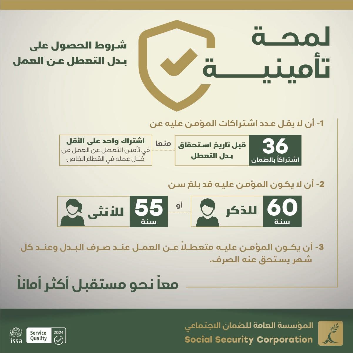 وأوضحت المؤسسة أنه يشترط لاستفادة المؤمن عليه من بدل التعطل عن العمل؛ أن لا تقل عدد اشتراكاته عن (36) اشتراكاً بالضمان قبل تاريخ استحقاق بدل التعطل منها اشتراك واحد على الأقل في التأمين من خلال الشمول في منشأة بالقطاع الخاص، وأن لا يكون قد بلغ سن (60) سنة بالنسبة للذكر أو سن (55) سنة بالنسبة للأنثى، وأن يتقدم المؤمن عليه بالطلب المتاح بشكل إلكتروني أثناء تعطله عن العمل.