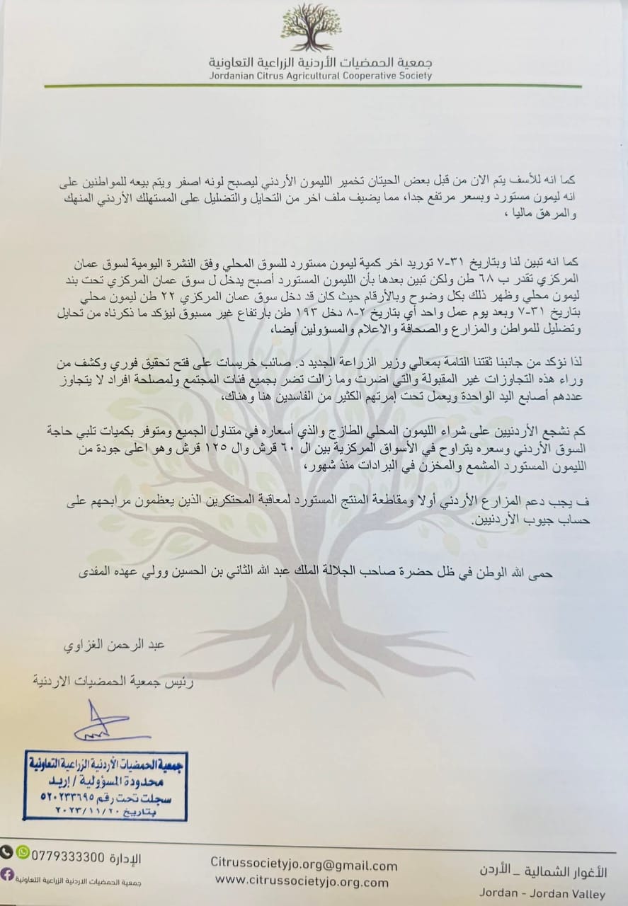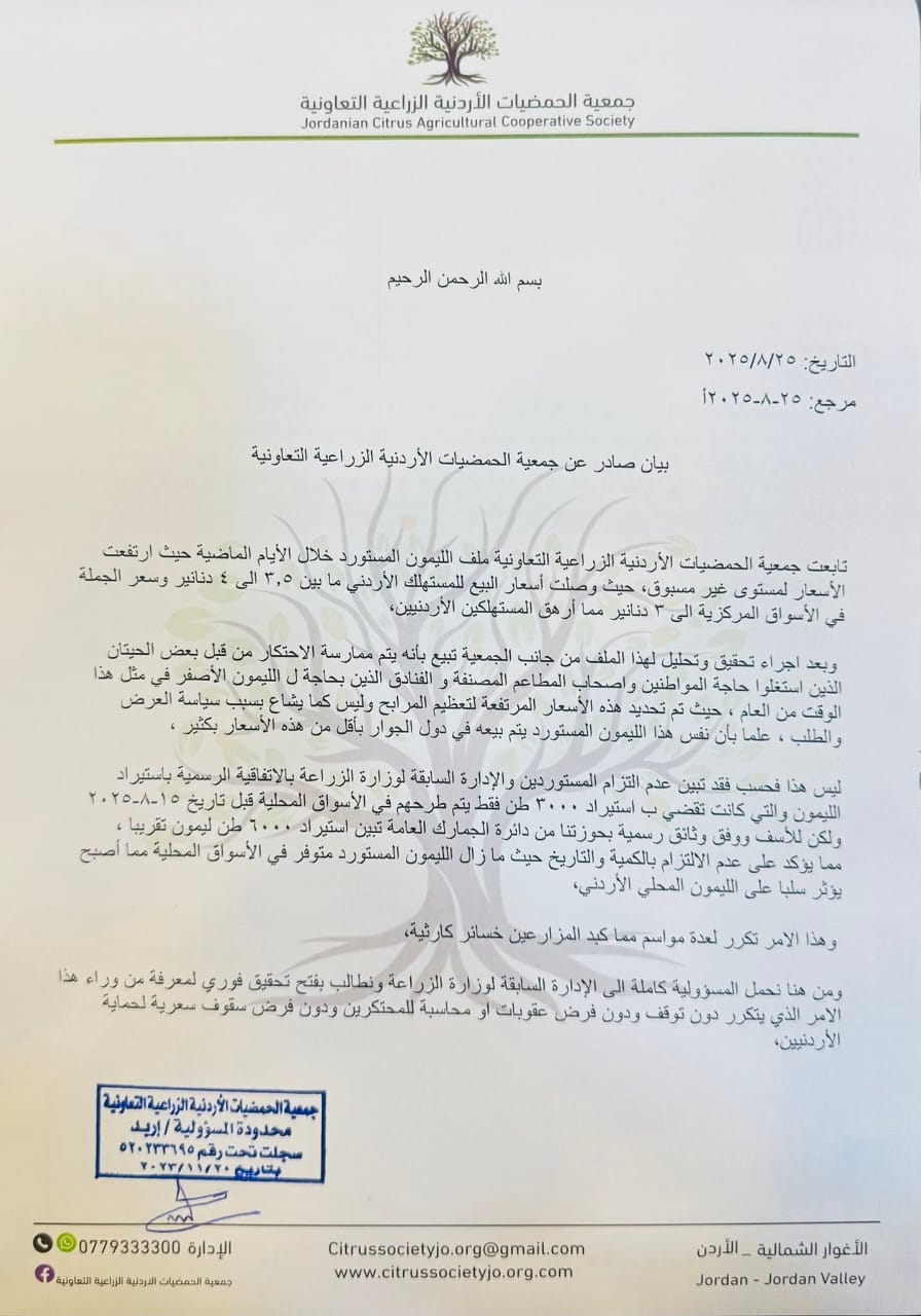 وختمت الجمعية بيانها بدعوة المواطنين إلى شراء الليمون المحلي الطازج، الذي يتراوح سعره في الأسواق المركزية بين 60 و125 قرشاً للكيلو الواحد، مؤكدة أن جودته أعلى من المستورد الذي يخزن في البرادات منذ شهور. كما شددت على أن دعم المزارع الأردني هو السبيل الوحيد لمواجهة الاحتكار وحماية الأمن الغذائي الوطني.