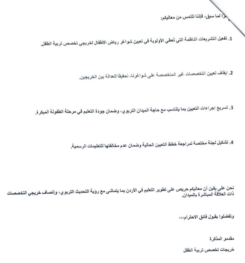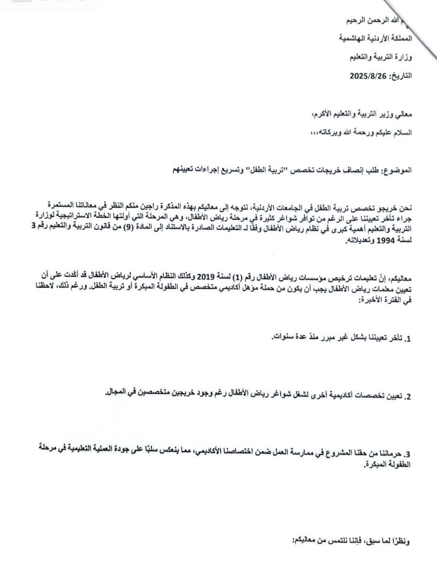 وأكدت طهبوب في مذكرتها أن فئة الطفولة تعد من أهم المراحل العمرية التي تحتاج إلى عناية خاصة، نظراً لتأثيرها العميق على مستقبل الفرد والمجتمع، مشيرةً إلى أن الجامعات حينما استحدثت هذا التخصص، إنما فعلت ذلك استجابة لحاجة مجتمعية ملحة، ولم يكن الهدف أن يصبح قابلاً للتجاوز أو الاستبدال.