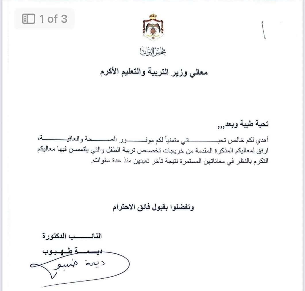 قدمت النائب ديمة طهبوب مذكرة إلى وزارة التربية والتعليم، نيابةً عن فئة كبيرة من خريجات ومعلمات تخصص تربية الطفل، طالبت فيها بإنصافهن في التعيين وعدم استبدالهن بتخصصات أخرى.