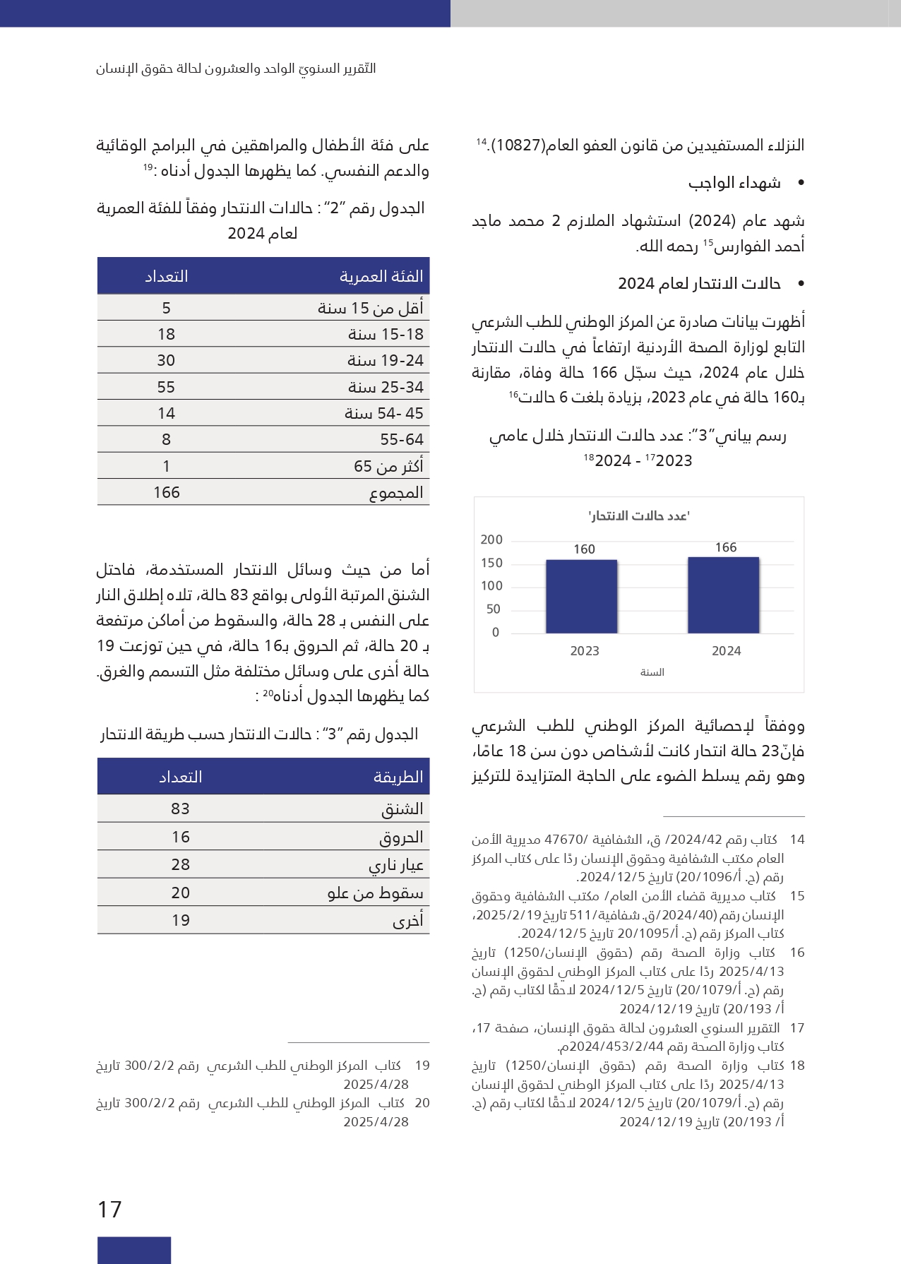 قال المركز الوطني لحقوق الإنسان إن العام الماضي شهد ارتفاعا في حالات الانتحار، حيث تم تسجيل 166 حالة مقارنة بـ160 حالة في العام 2023، وفق بيانات المركز الوطني للطب الشرعي التابع لوزارة الصحة.