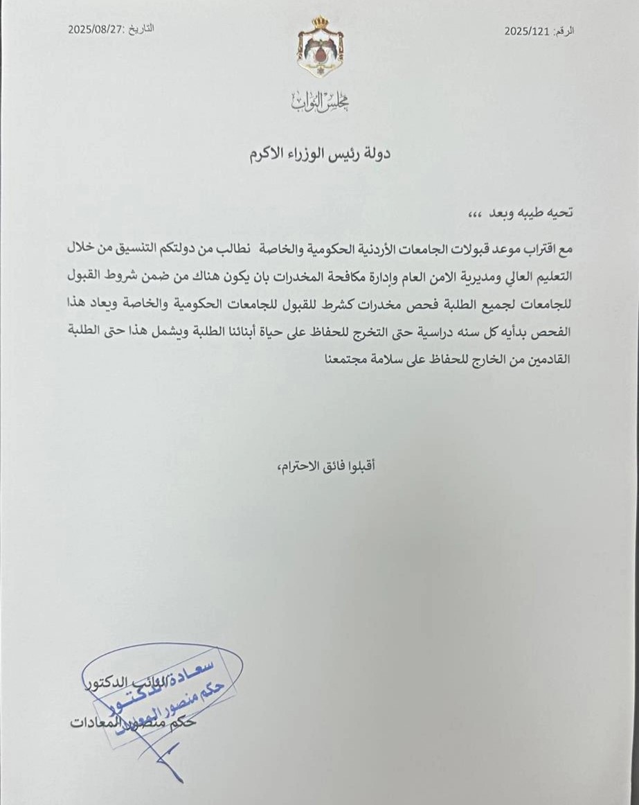 طالب النائب حكم المعادات، رئيس الوزراء الدكتور جعفر حسان، بإصدار قرار يشترط إجراء فحص تعاطي المخدرات للقبول في الجامعات الحكومية والخاصة وللطلبة القادمين من الخارج، مع تكرار الفحص بشكل دوري في بداية كل عام دراسي حتى انتهاء فترة الدراسة الجامعية.