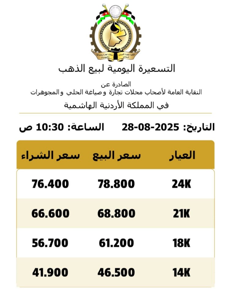 وبحسب التسعيرة اليومية الصادرة عن النقابة العامة لأصحاب محال تجارة الحلي والمجوهرات، ارتفع أيضاً سعر بيع الغرام الواحد من الذهب عيار 24 إلى 78.80 دينار، بينما بلغ سعر عيار 18 61.20 دينار في محال الصاغة.