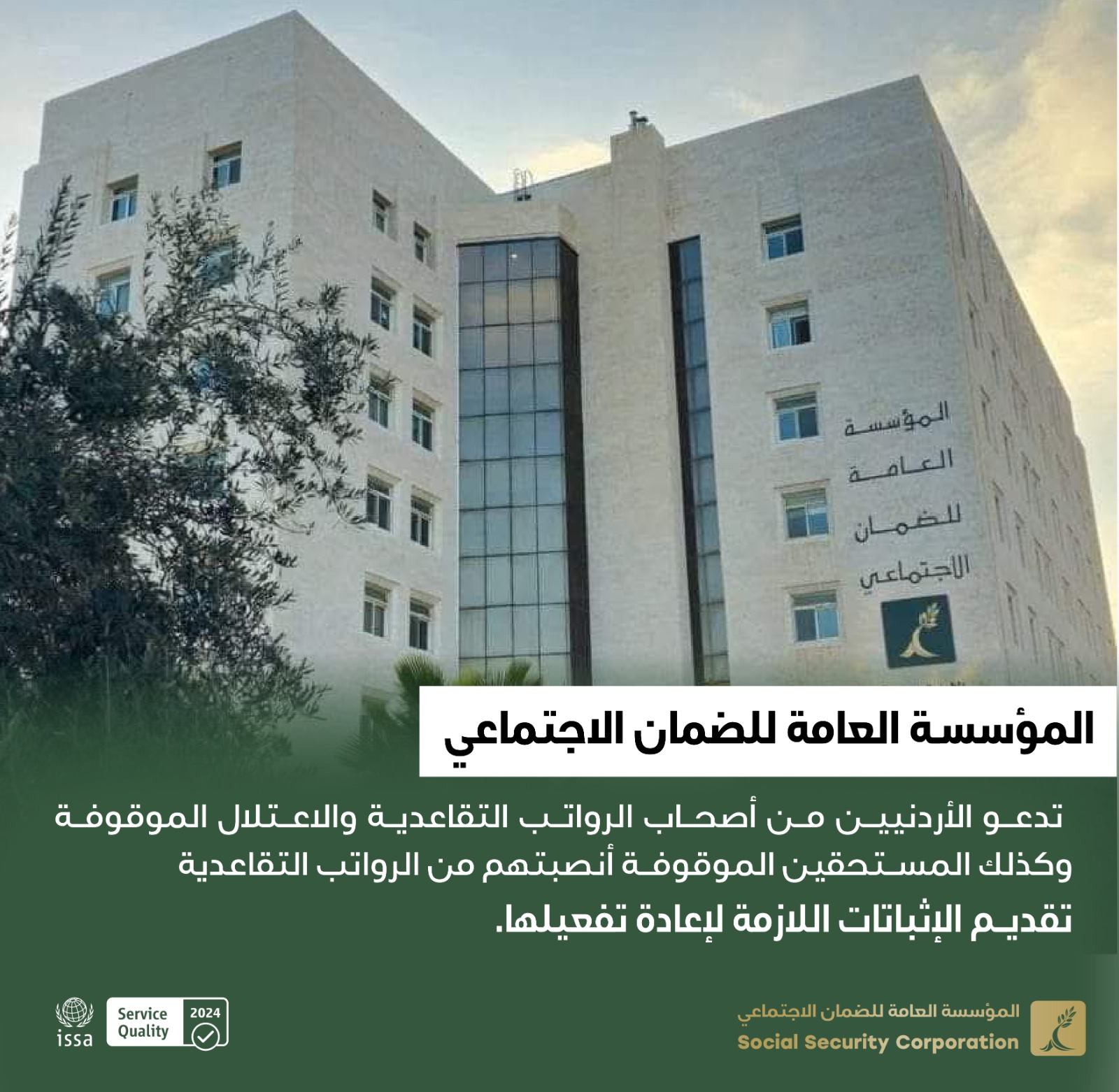 دعت المؤسسة العامة للضمان الاجتماعي الأردنيين الذين أوقف صرف رواتبهم التقاعدية أو رواتب الاعتلال عنهم أو المتقاعدين الذين أوقف صرف زيادة الإعالة لهم أو الورثة المستحقين الذين أوقفت أنصبتهم من الرواتب التقاعدية بسبب تفقد الحياة إلى ضرورة تزويدها بالوثائق المطلوبة عبر البريد الإلكتروني المخصص لهذه الغاية فقط (lifeverification@ssc.gov.jo) وذلك لإعادة تفعيل الراتب التقاعدي أو الاعتلال أو زيادة الإعالة أو النصيب المستحق من الراتب التقاعدي.
